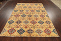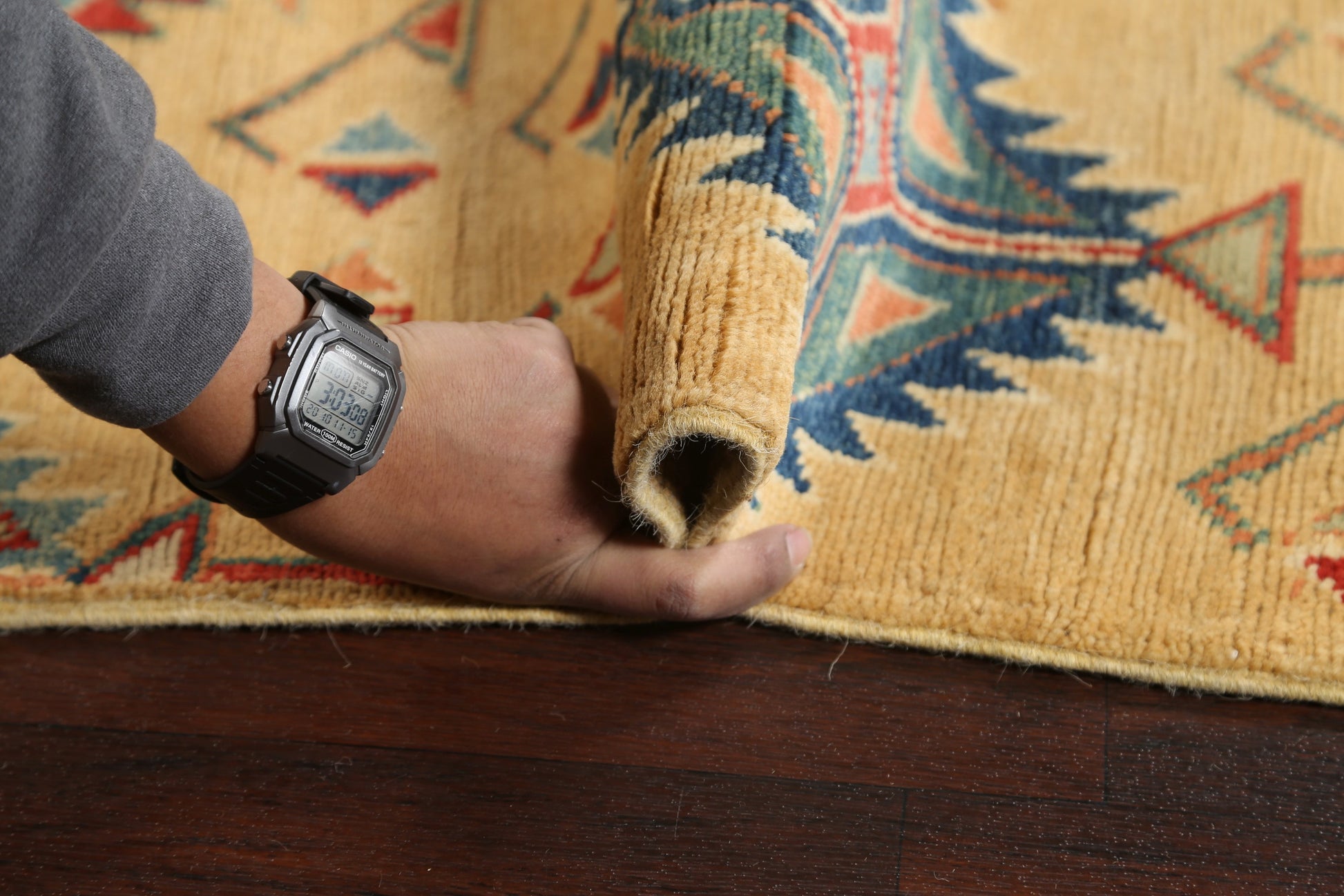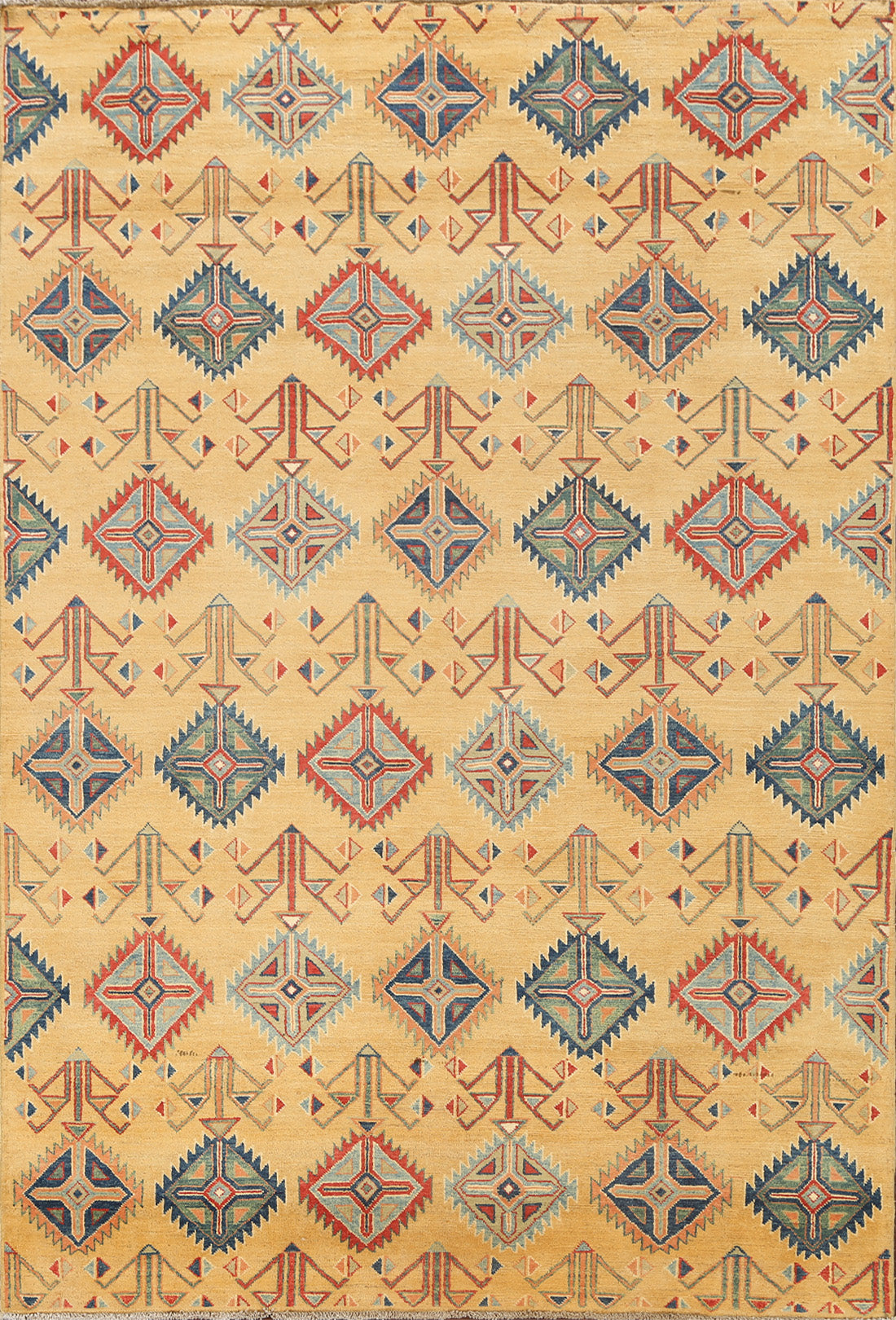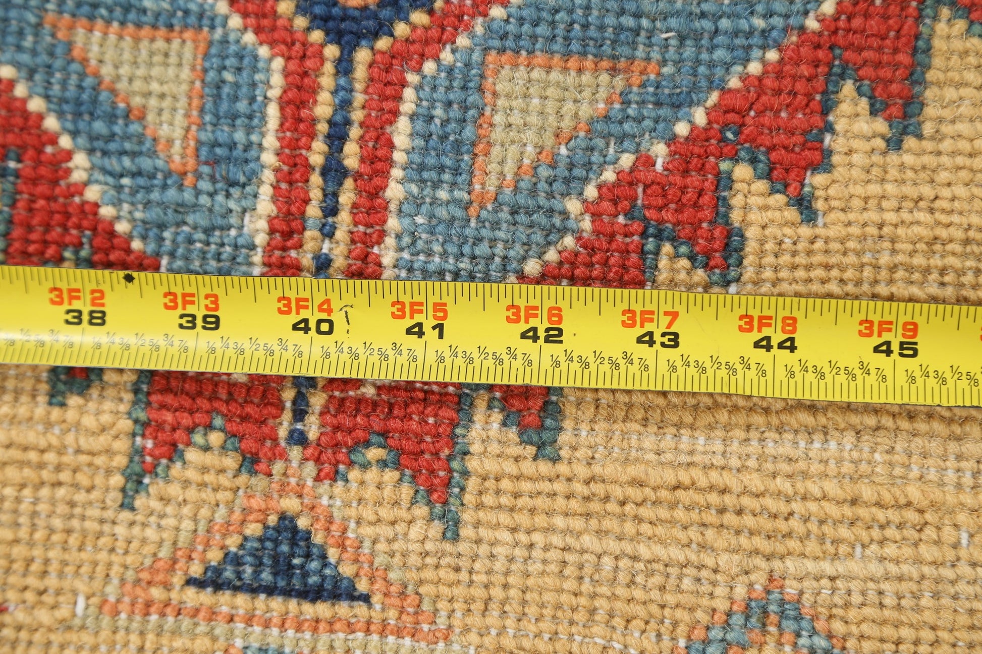 A Beautiful Genuine Pakistan Kazak rug is Hand Knotted by skillful weavers in Pakistan with 100% Wool Material. This rug is in New, First Quality condition. dimensions are 8' 7'' X 6' 1'' in foot and 262 X 185 in centimeter. the primary color is Yellow & Gold.