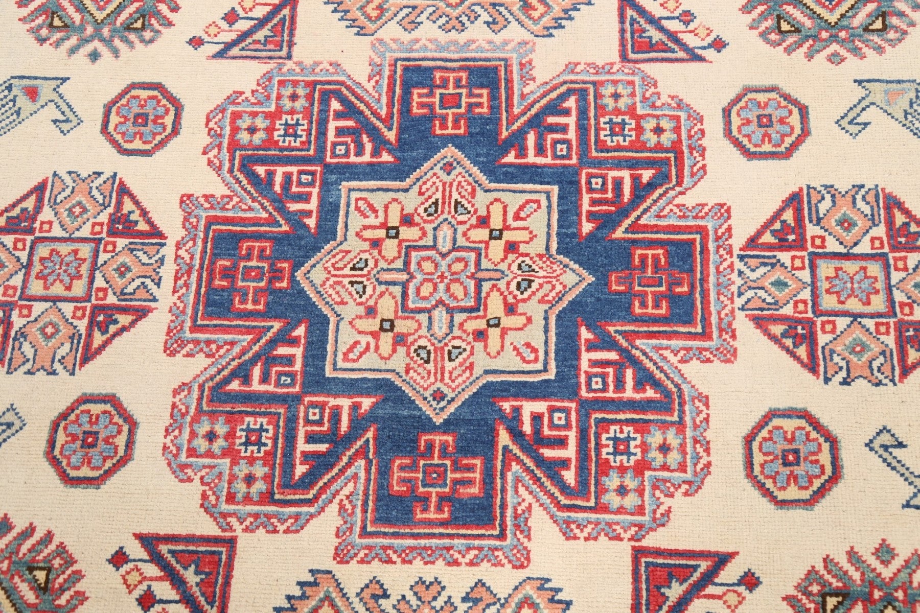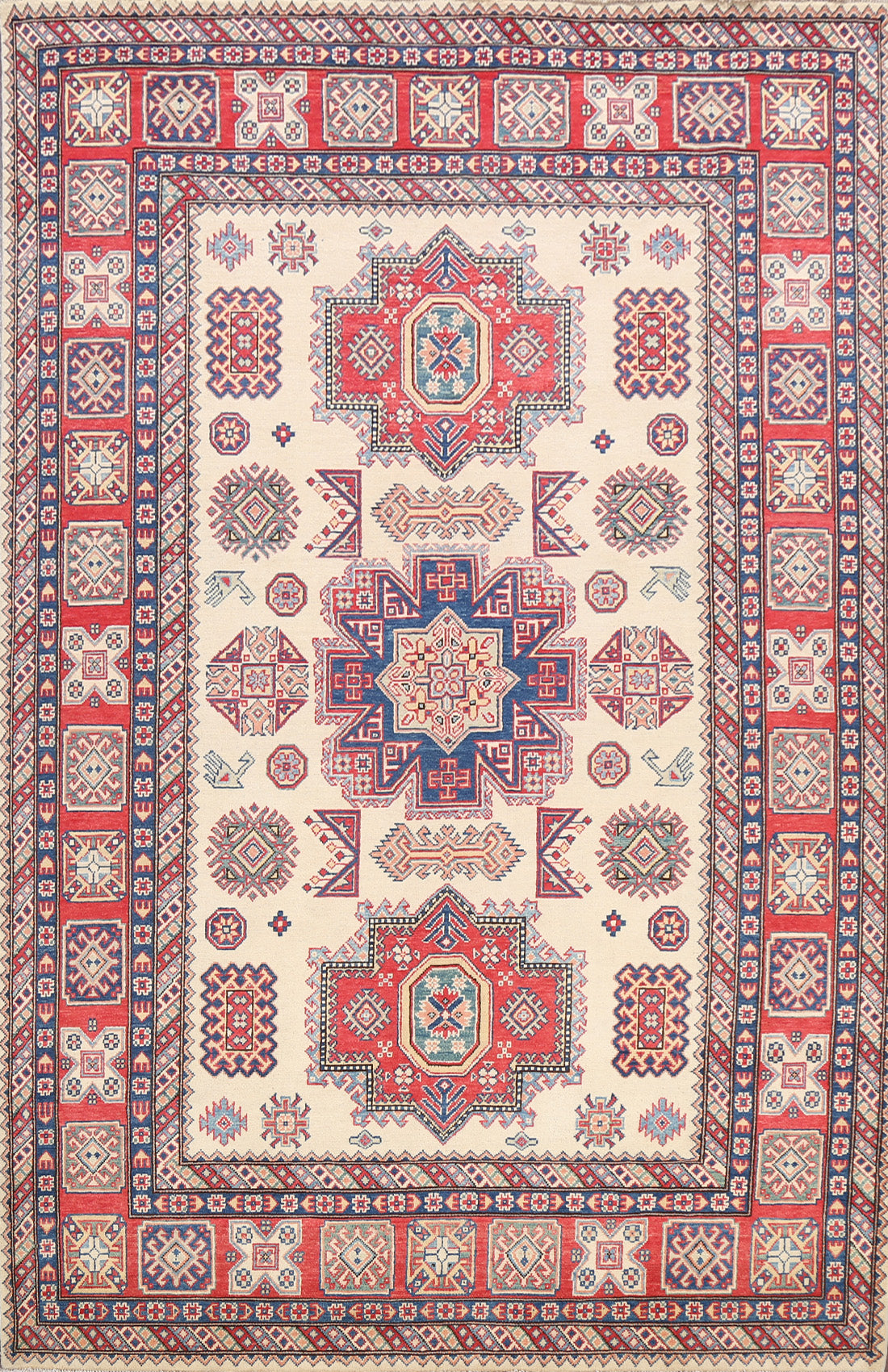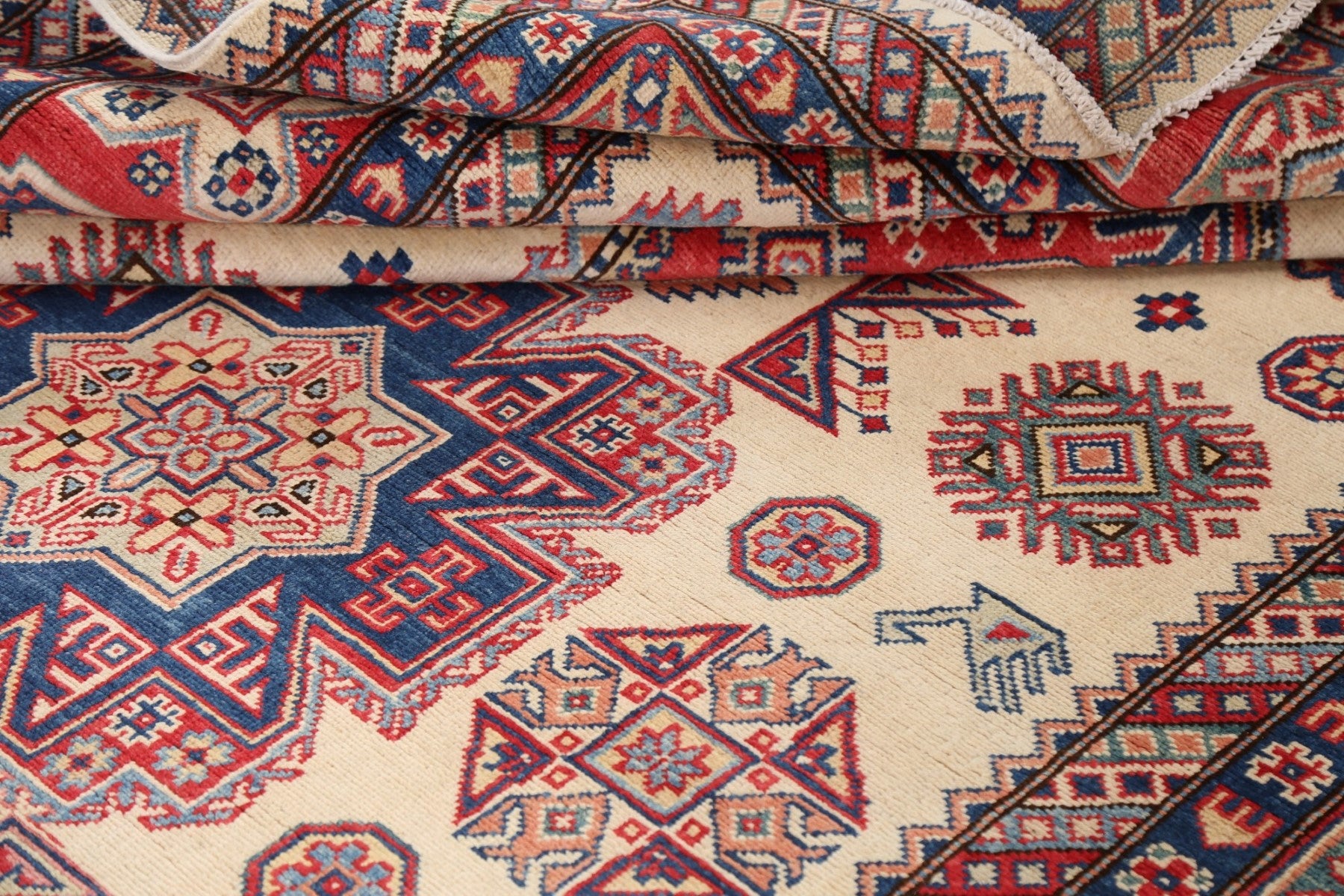 A Beautiful Genuine Pakistan Kazak rug is Hand Knotted by skillful weavers in Pakistan with 100% Wool Material. This rug is in New, First Quality condition. dimensions are 9' 10'' X 6' 7'' in foot and 300 X 201 in centimeter. the primary color is Beige & Ivories.