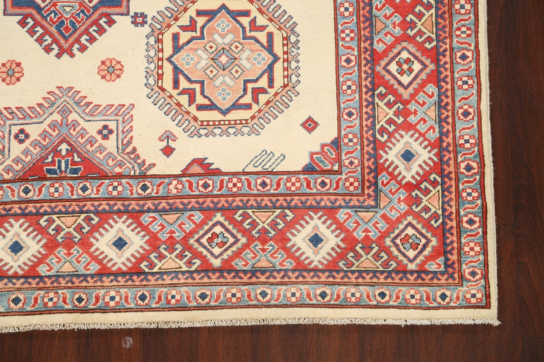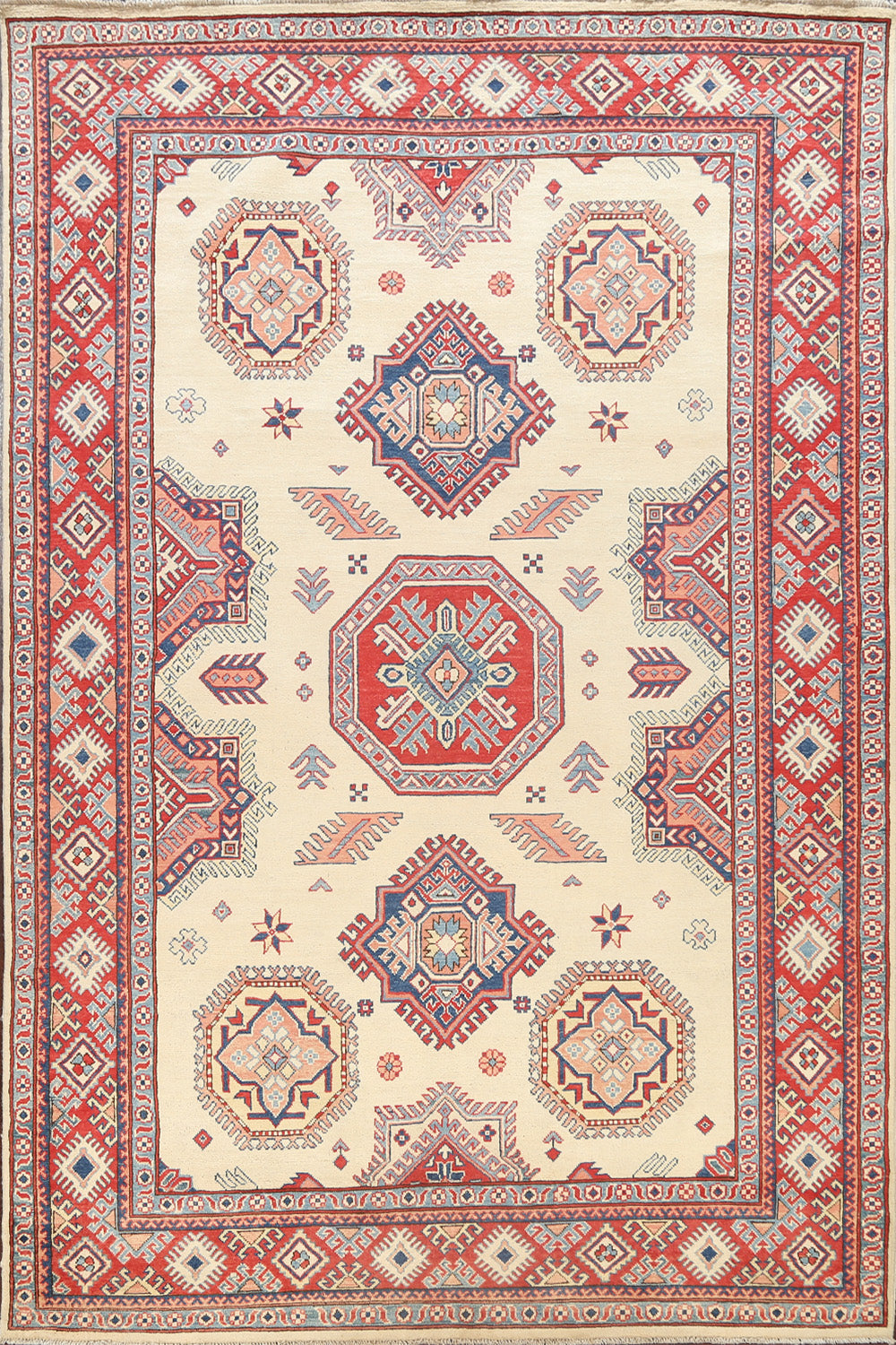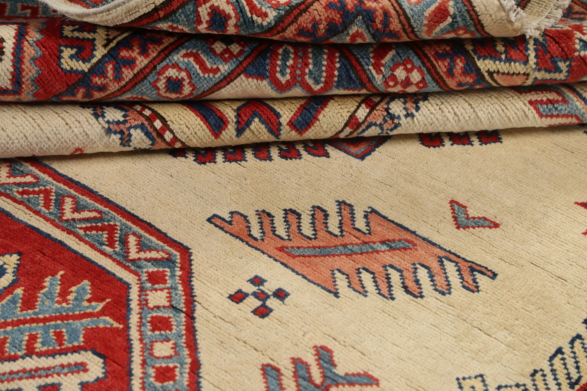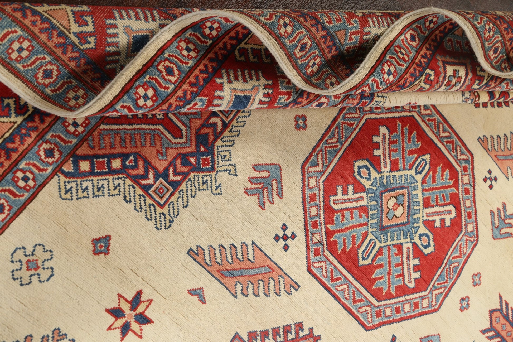 A Beautiful Genuine Pakistan Kazak rug is Hand Knotted by skillful weavers in Pakistan with 100% Wool Material. This rug is in New, First Quality condition. dimensions are 9' 10'' X 6' 7'' in foot and 300 X 201 in centimeter. the primary color is Beige & Ivories.
