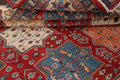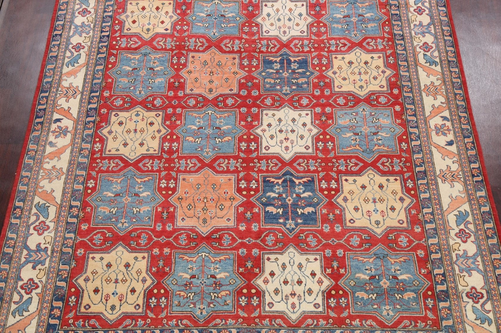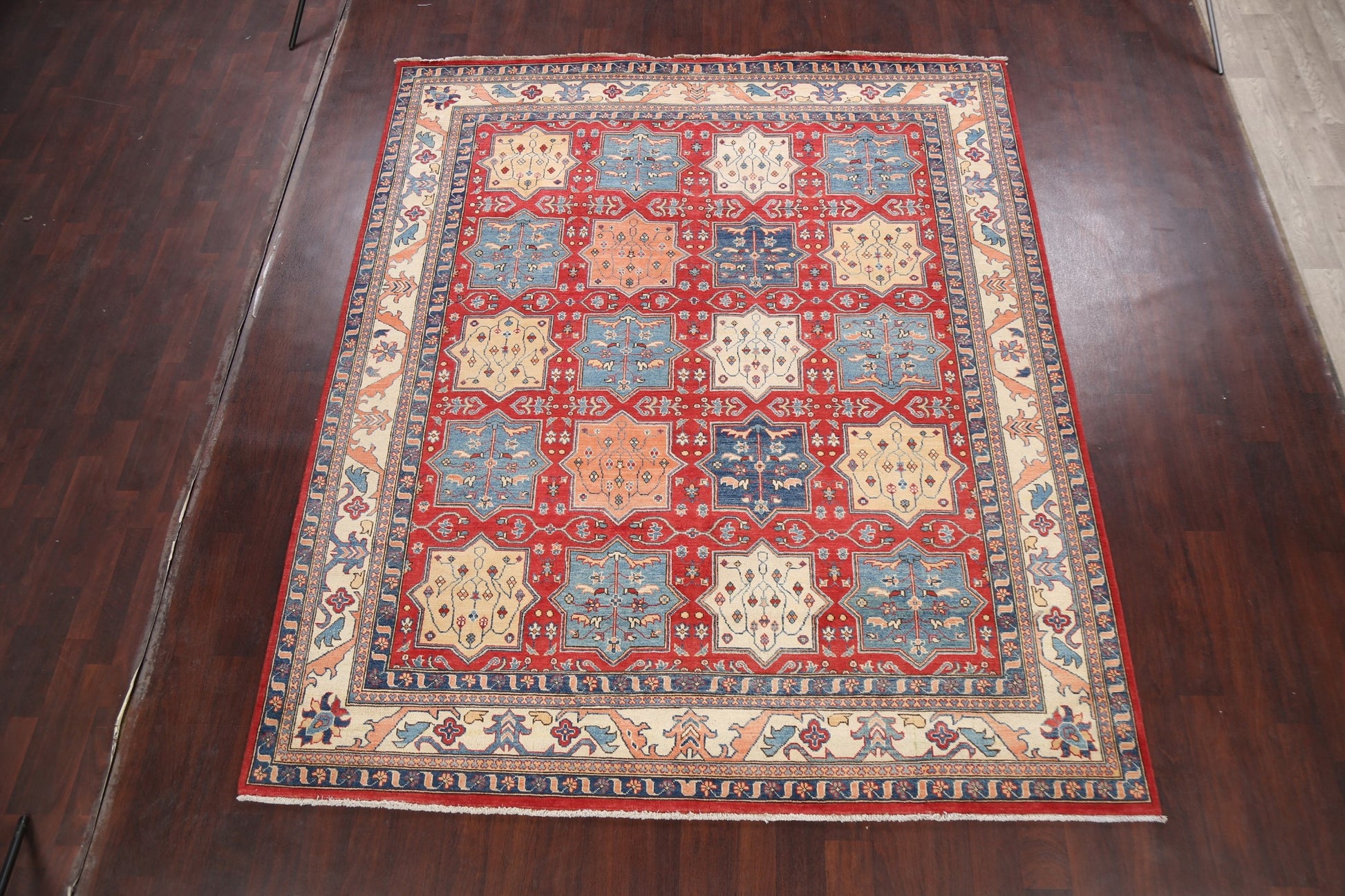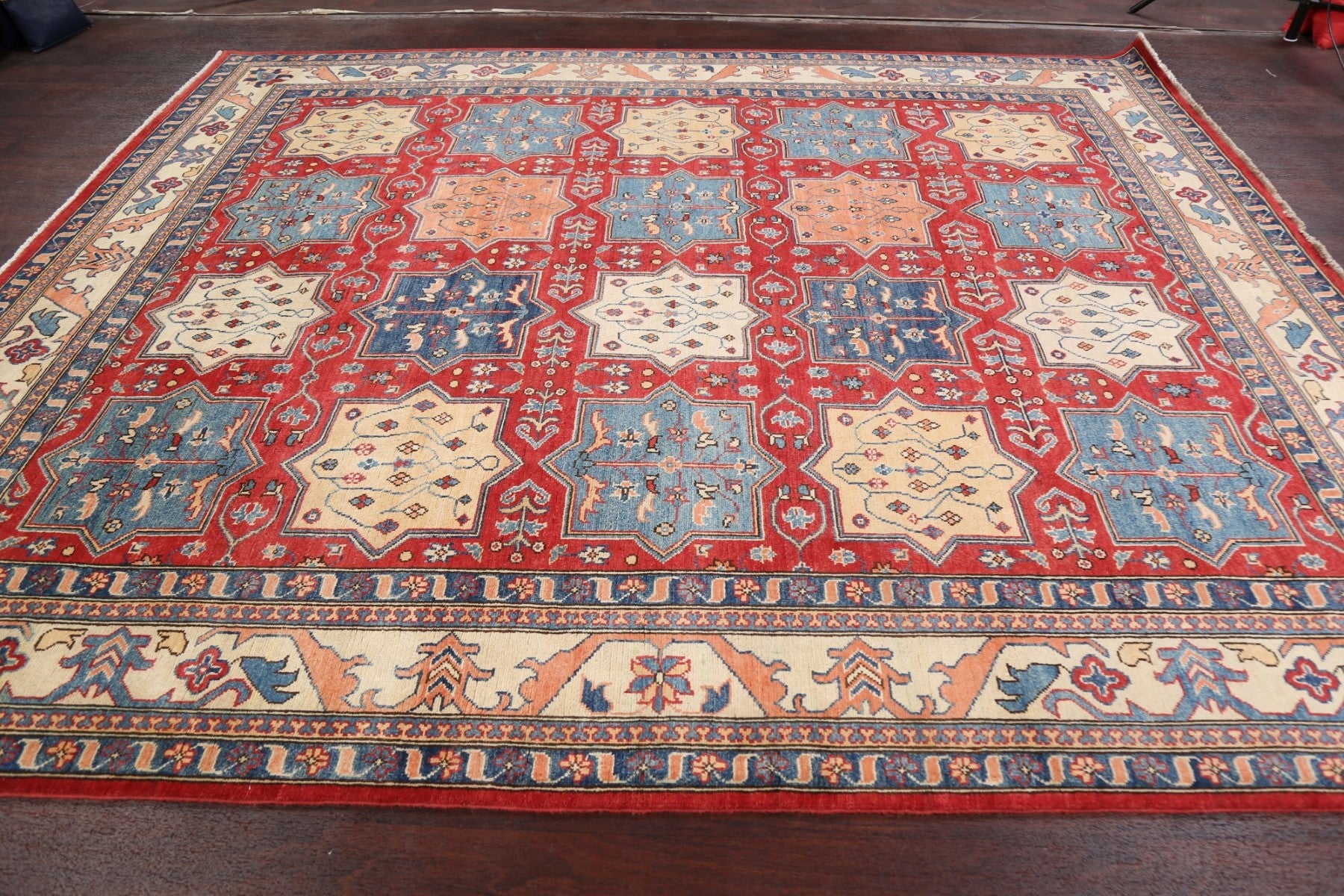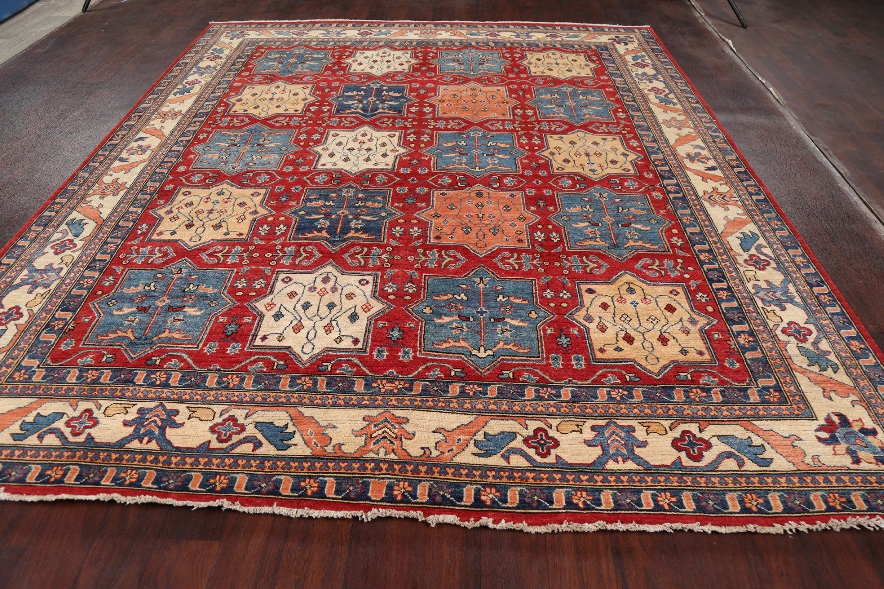 A Beautiful Genuine Pakistan Kazak rug is Hand Knotted by skillful weavers in Pakistan with 100% Wool Material. This rug is in New, First Quality condition. dimensions are 9' 8'' X 8' 1'' in foot and 295 X 246 in centimeter. the primary color is Red.
