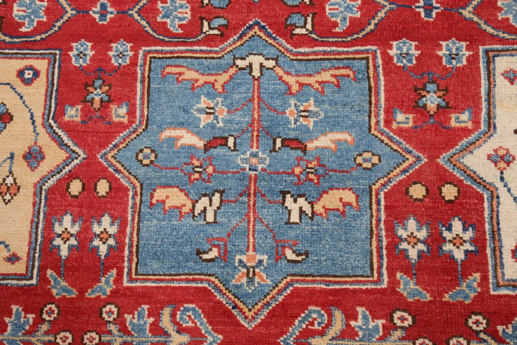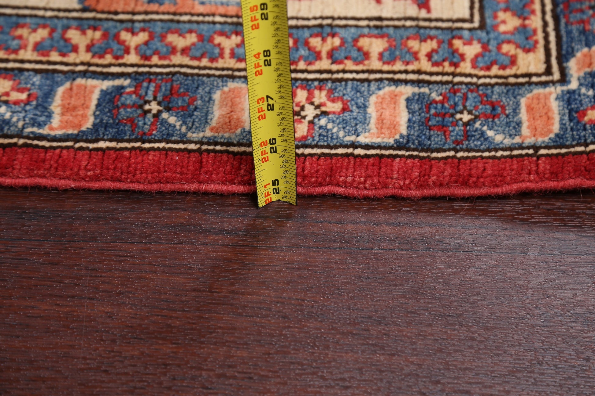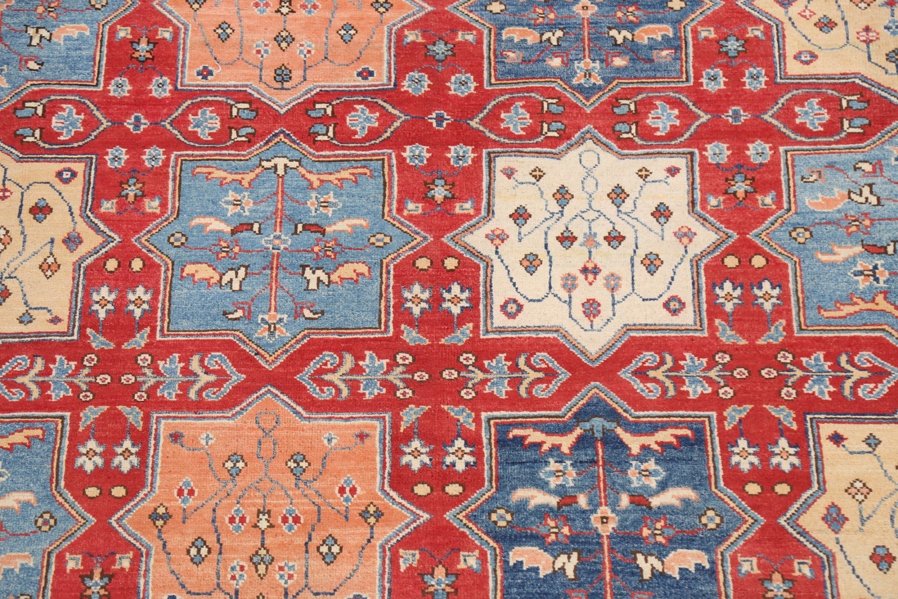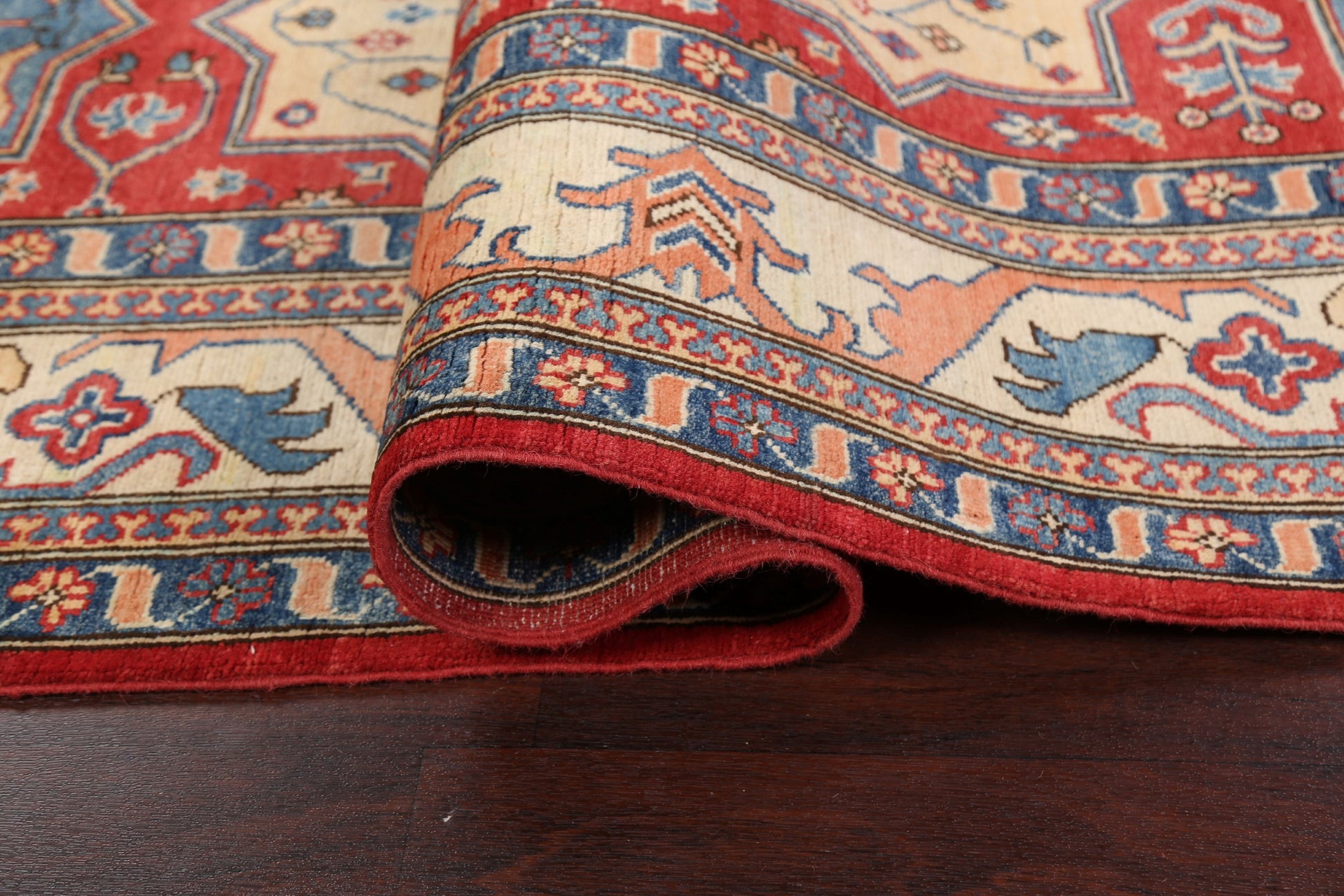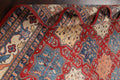 A Beautiful Genuine Pakistan Kazak rug is Hand Knotted by skillful weavers in Pakistan with 100% Wool Material. This rug is in New, First Quality condition. dimensions are 9' 8'' X 8' 1'' in foot and 295 X 246 in centimeter. the primary color is Red.
