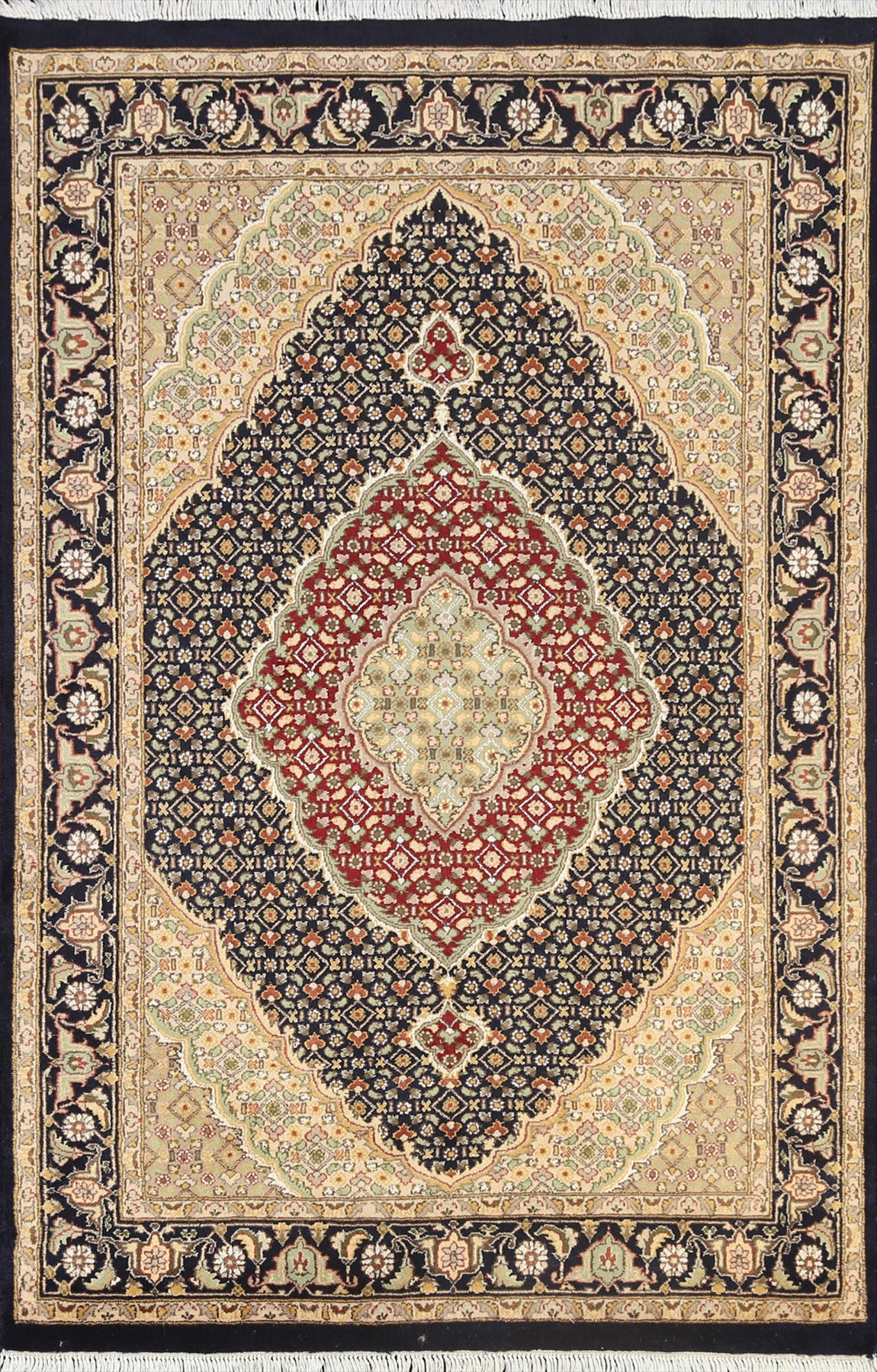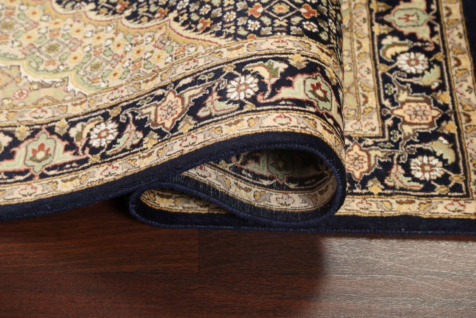 A Beautiful Genuine Pakistan Tabriz rug is Hand Knotted by skillful weavers in Pakistan with Wool & Silk Material. This rug is in New, First Quality condition. dimensions are 5' 11'' X 4' 0'' in foot and 180 X 122 in centimeter. the primary color is Navy Blue & Blues.