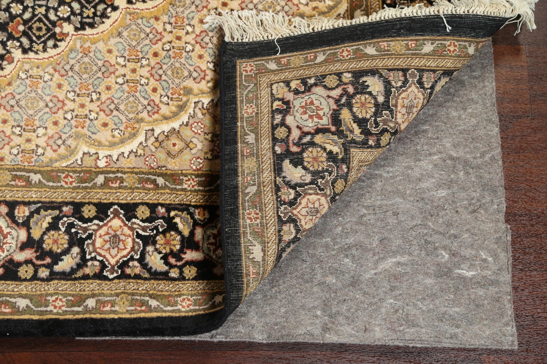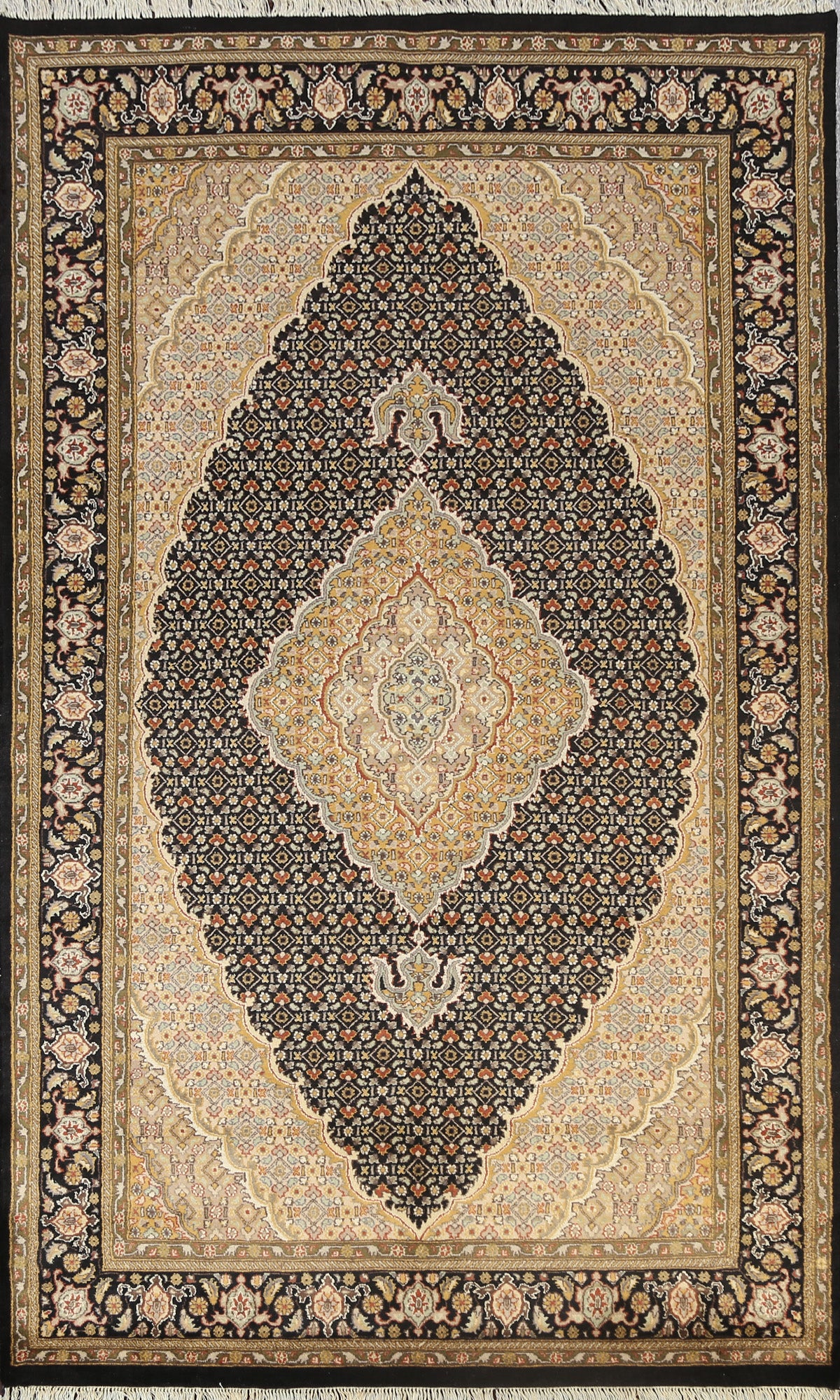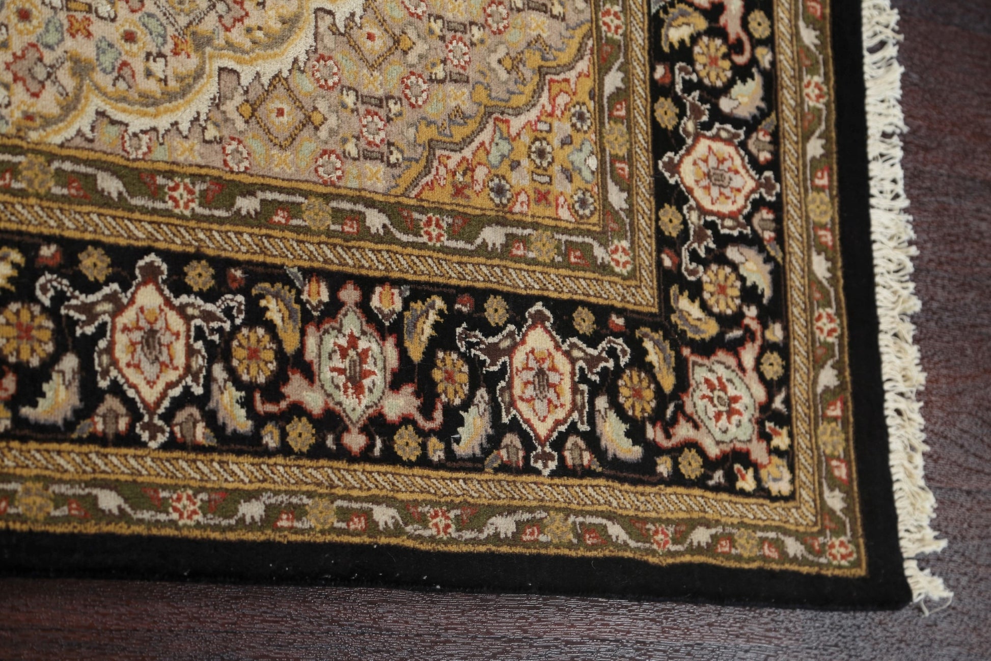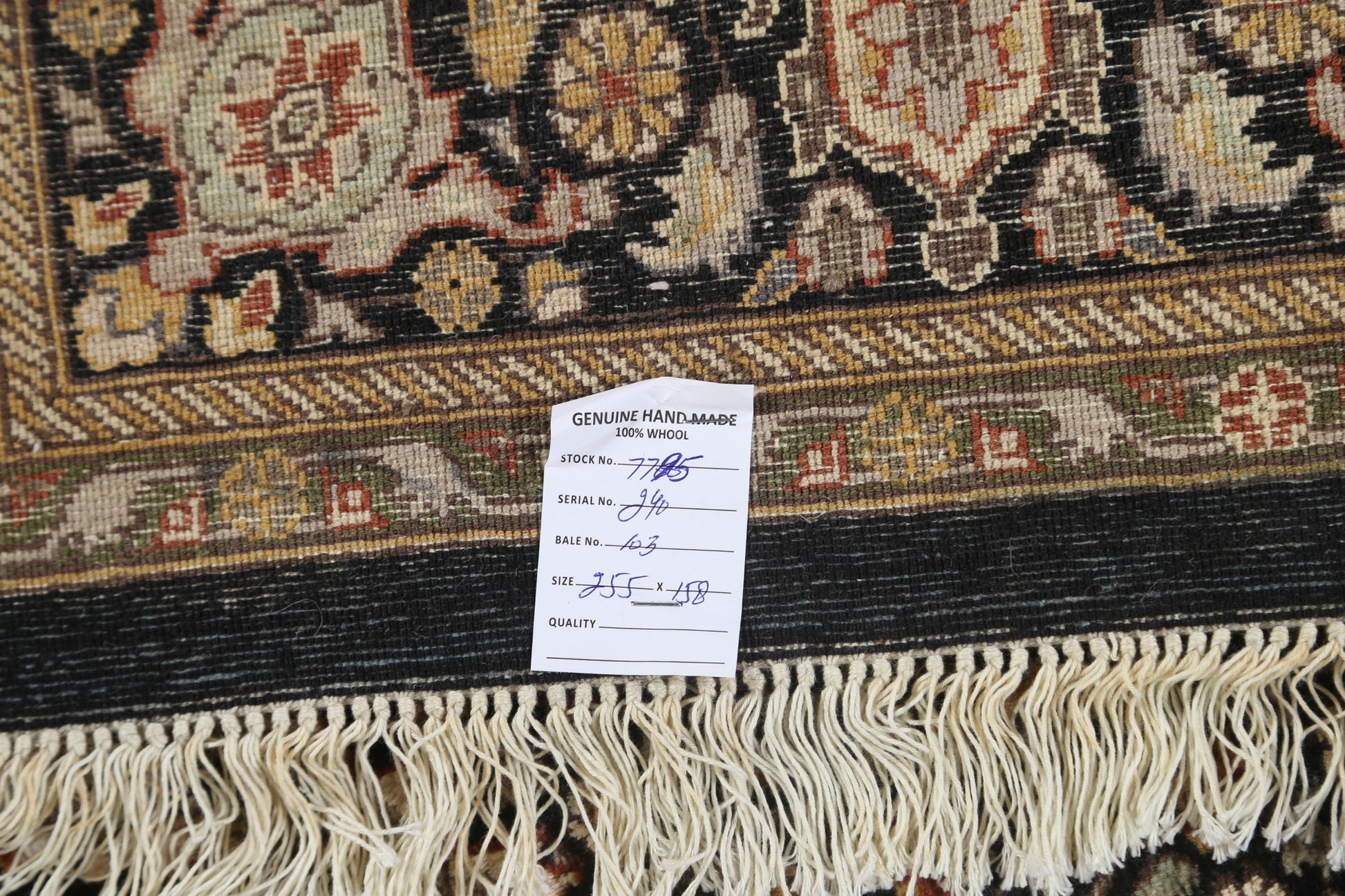 A Beautiful Genuine Pakistan Tabriz rug is Hand Knotted by skillful weavers in Pakistan with Wool & Silk Material. This rug is in New, First Quality condition. dimensions are 8' 5'' X 5' 2'' in foot and 257 X 157 in centimeter. the primary color is Black.