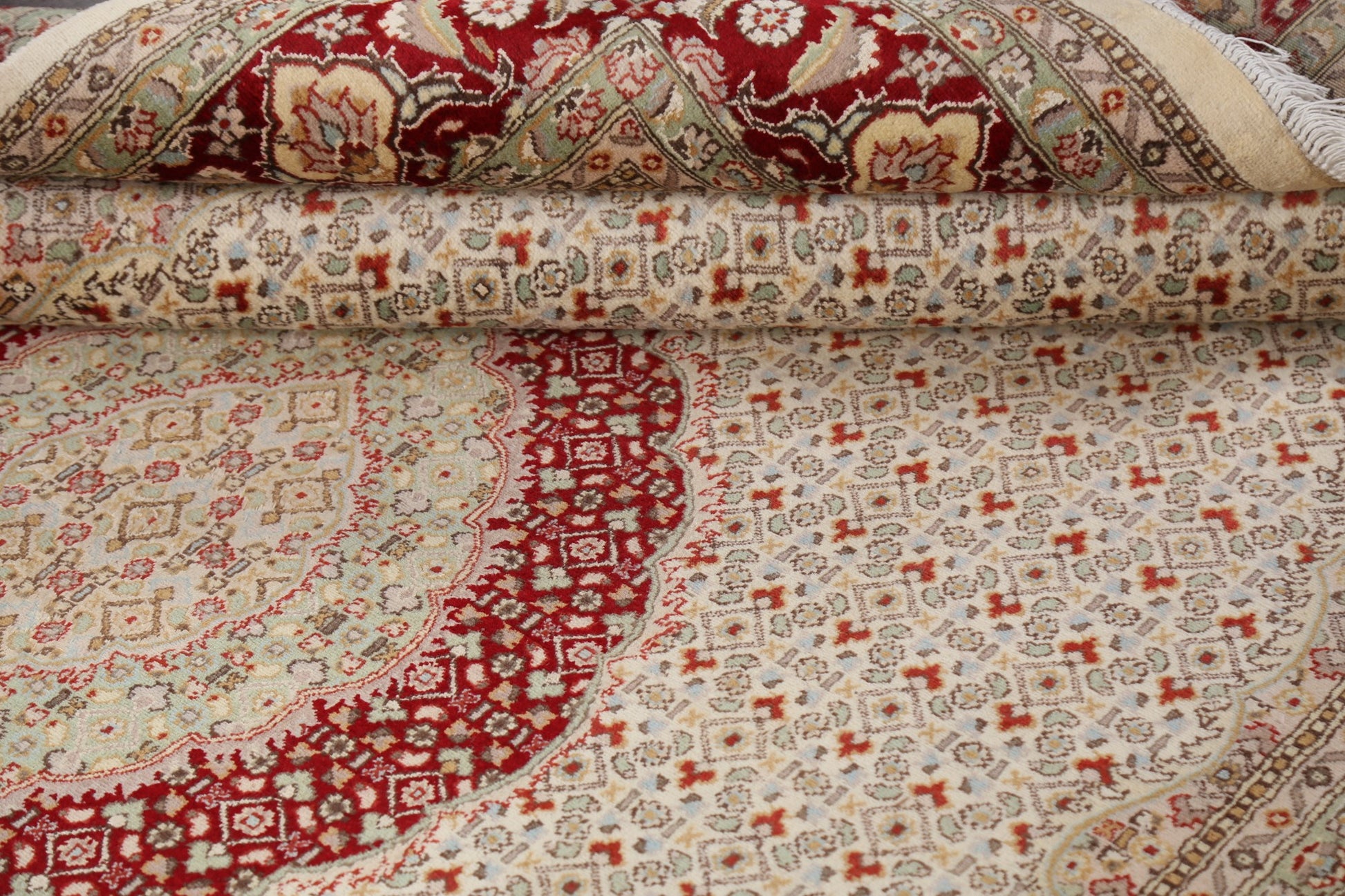 A Beautiful Genuine Pakistan Tabriz rug is Hand Knotted by skillful weavers in Pakistan with 100% Wool Material. This rug is in New, First Quality condition. dimensions are 9' 8'' X 6' 1'' in foot and 295 X 185 in centimeter. the primary color is Beige & Ivories.