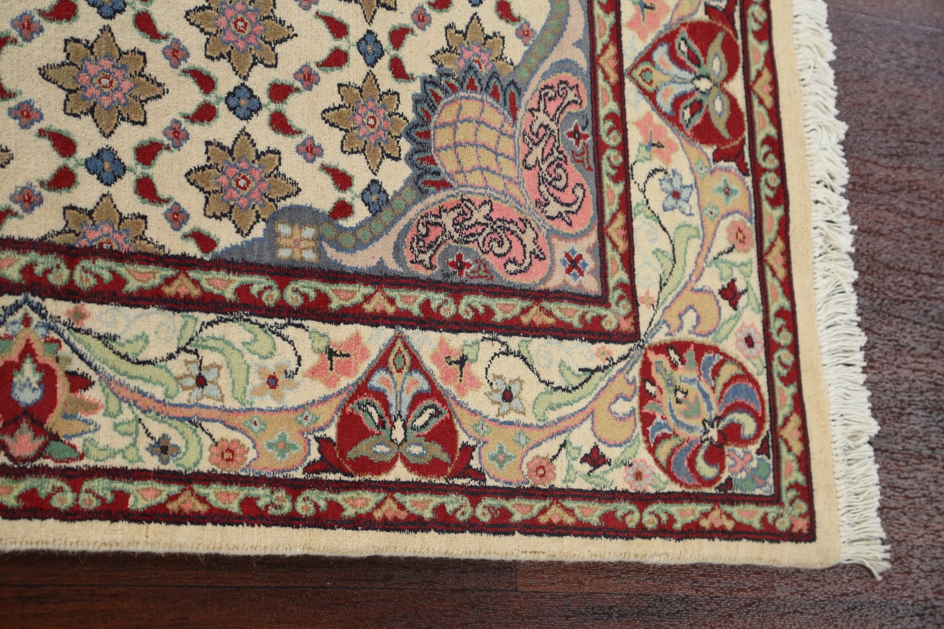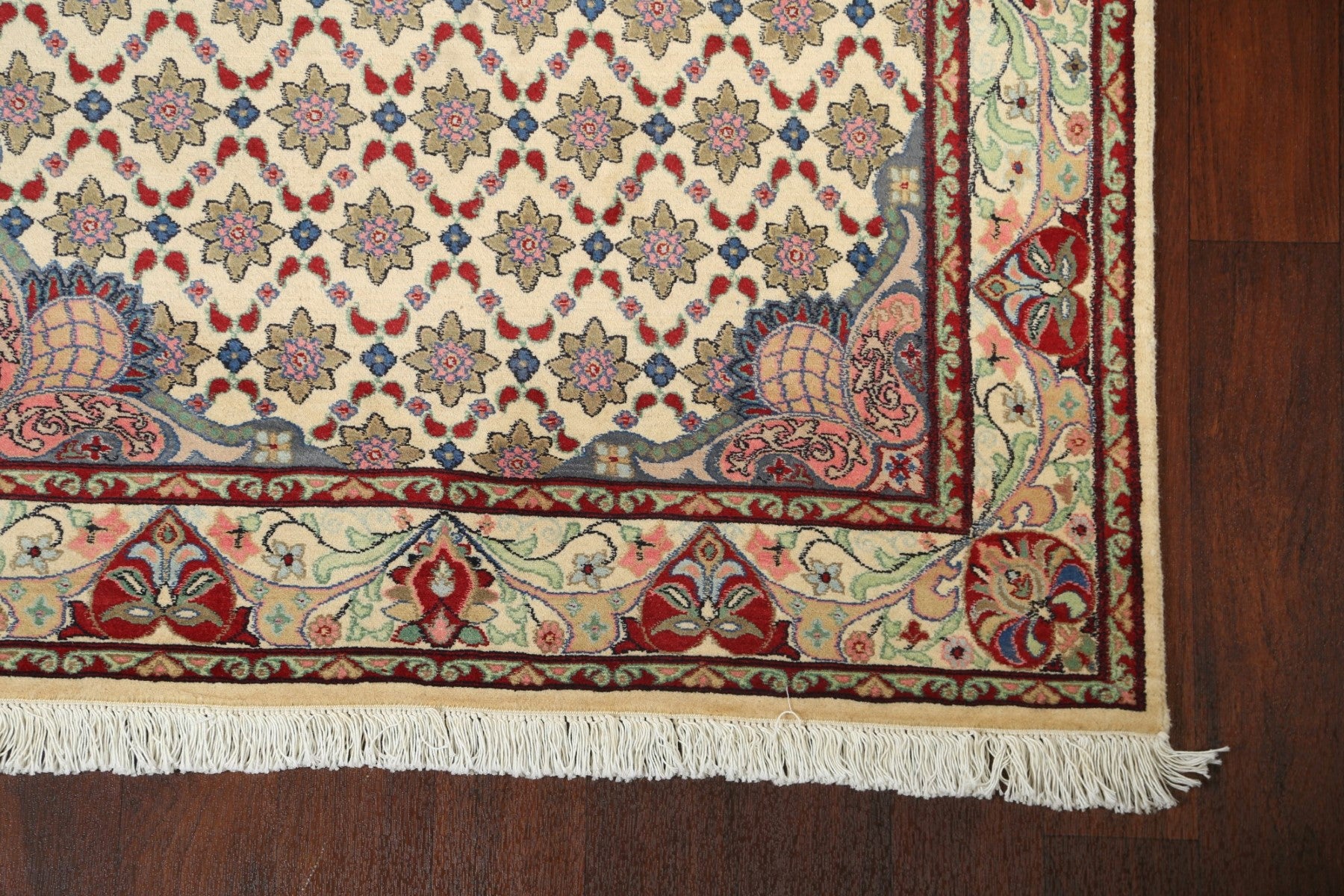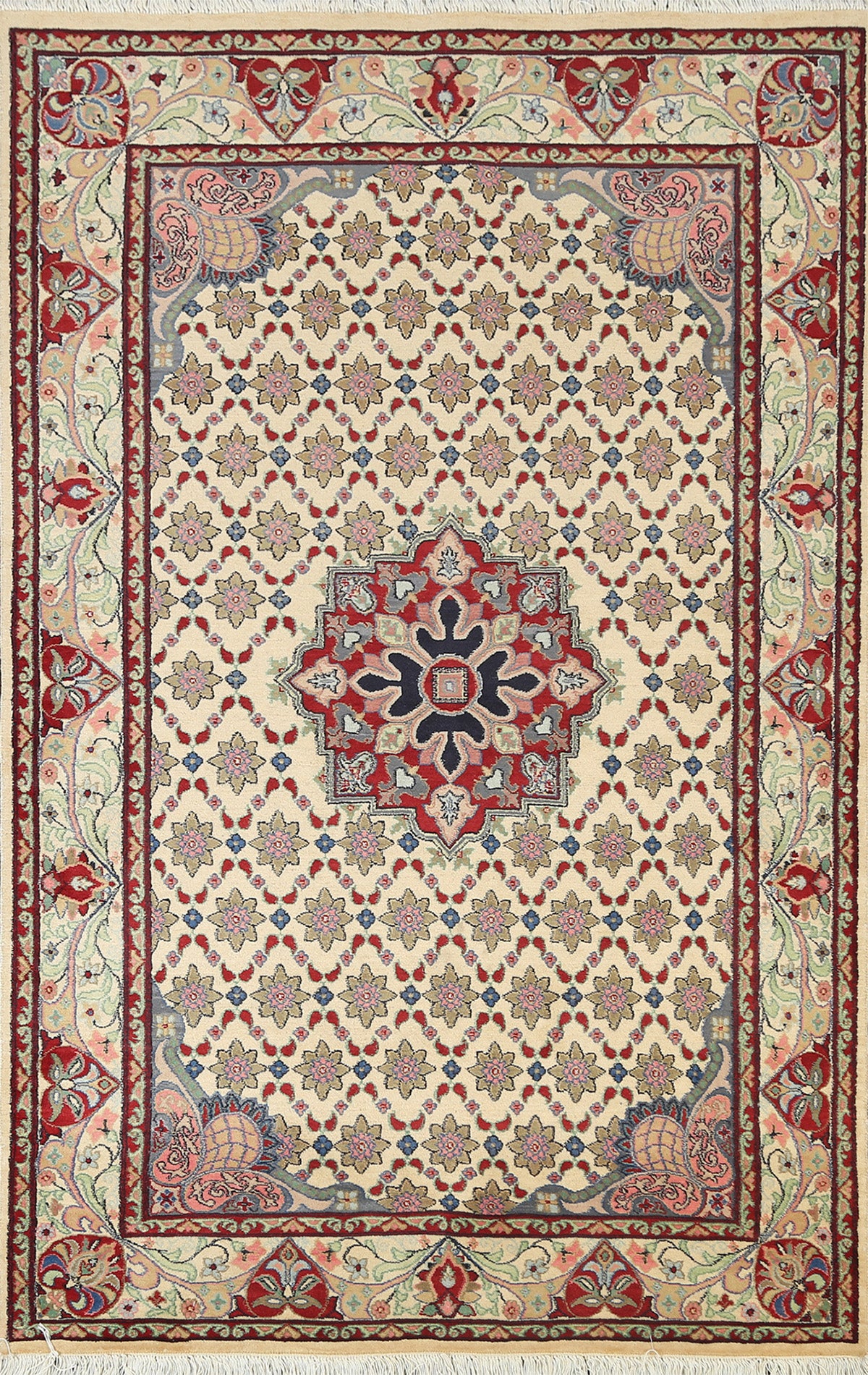 A Beautiful Genuine Pakistan Tabriz rug is Hand Knotted by skillful weavers in Pakistan with 100% Wool Material. This rug is in New, First Quality condition. dimensions are 6' 2'' X 4' 0'' in foot and 188 X 122 in centimeter. the primary color is Beige & Ivories.