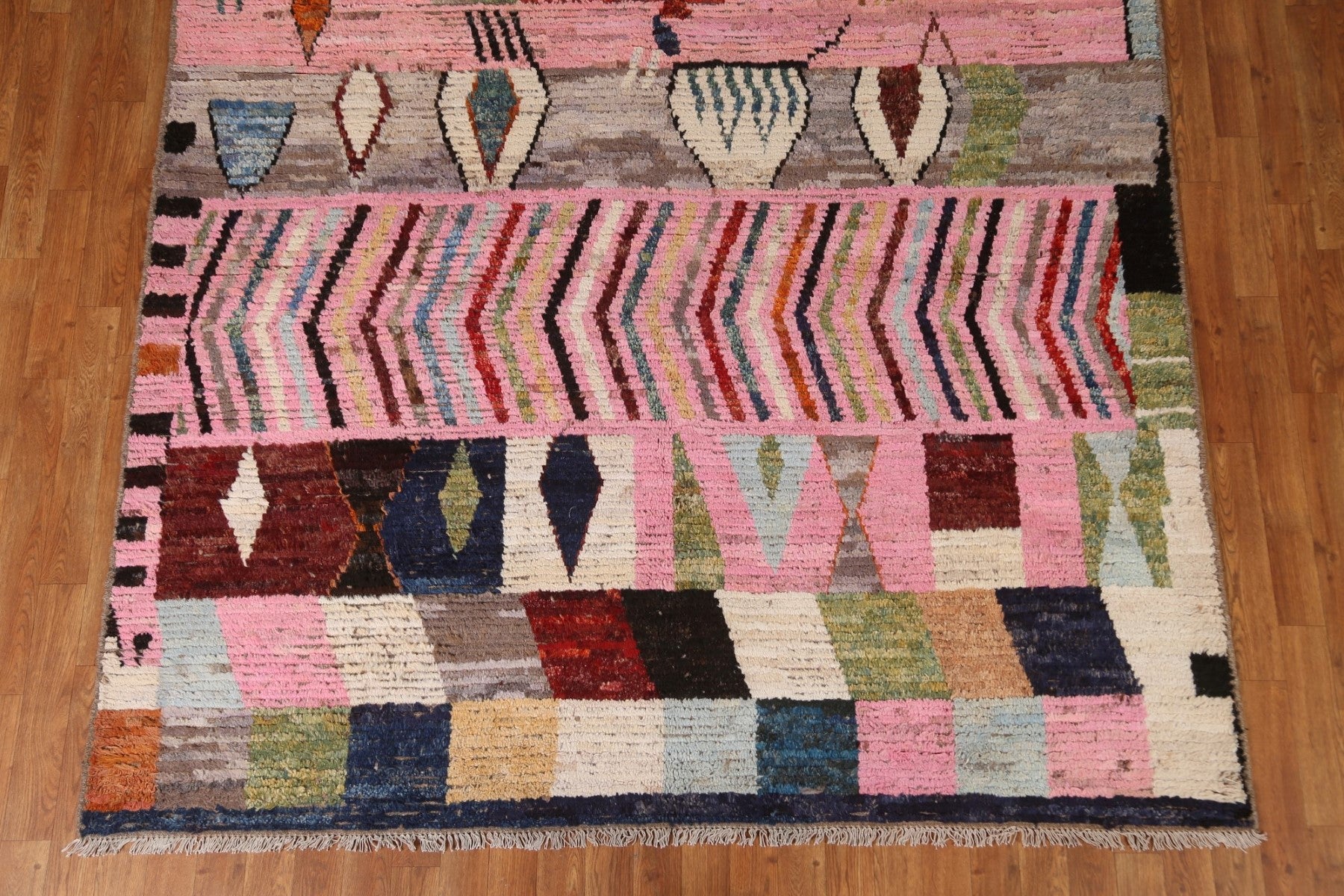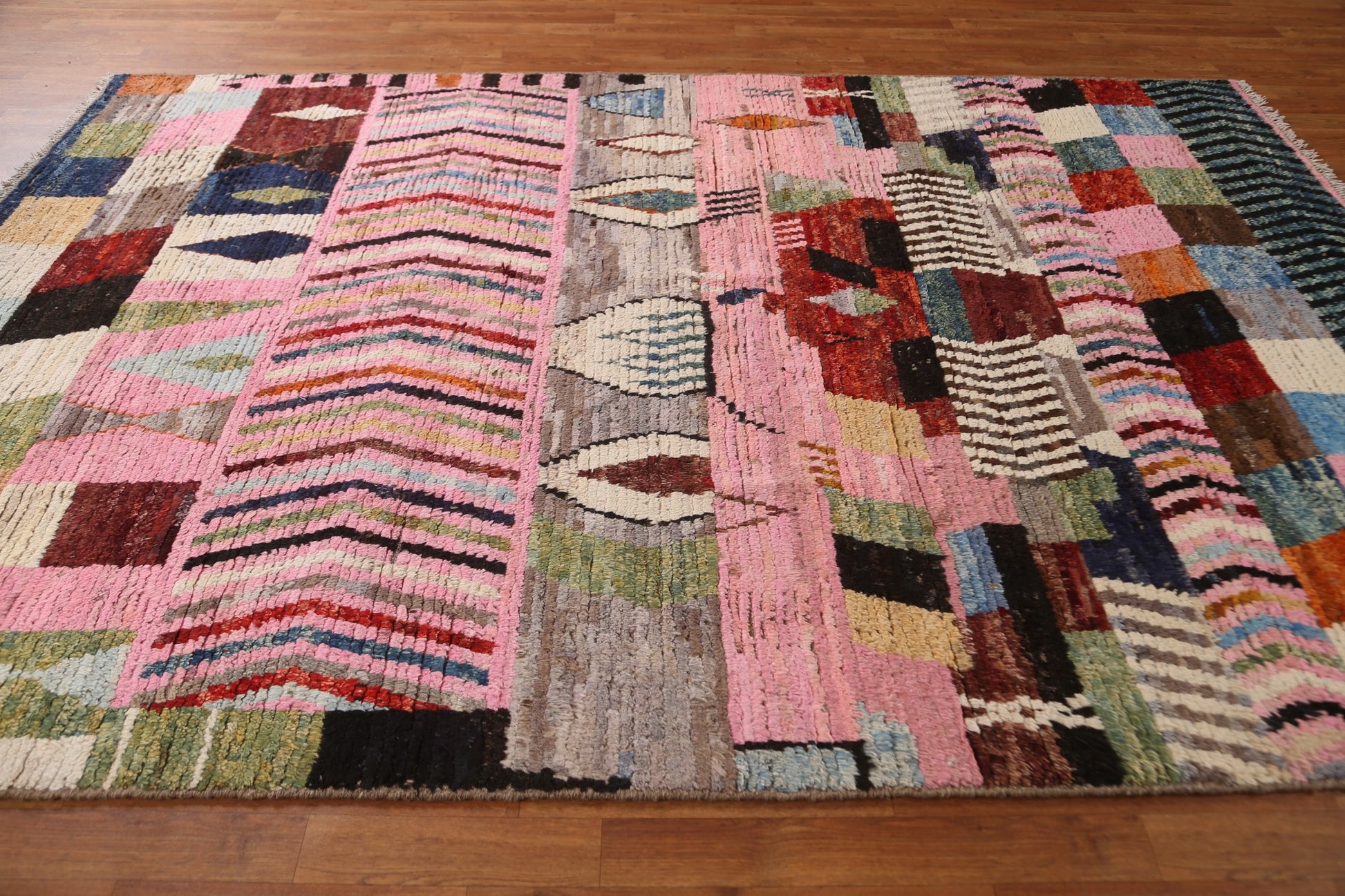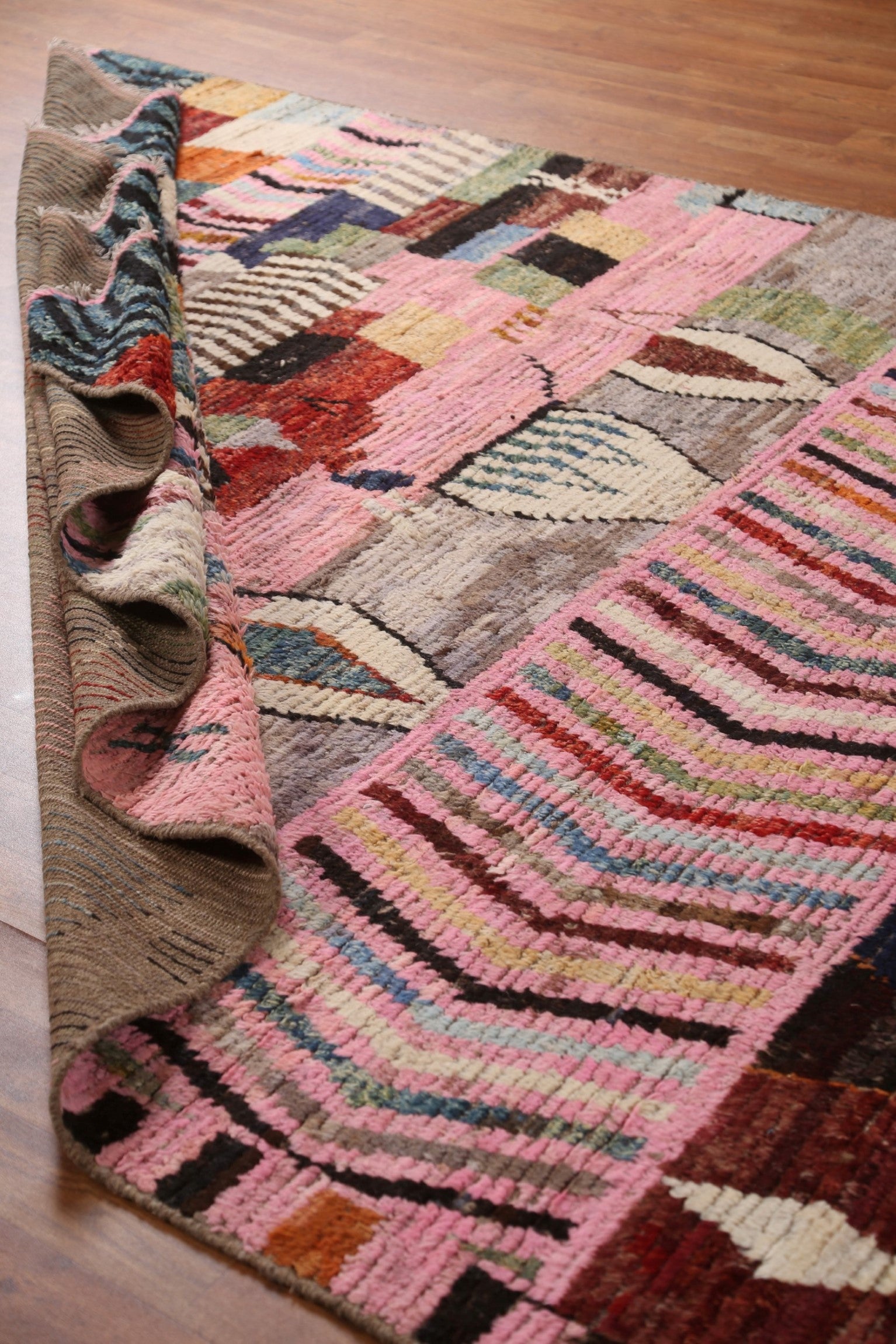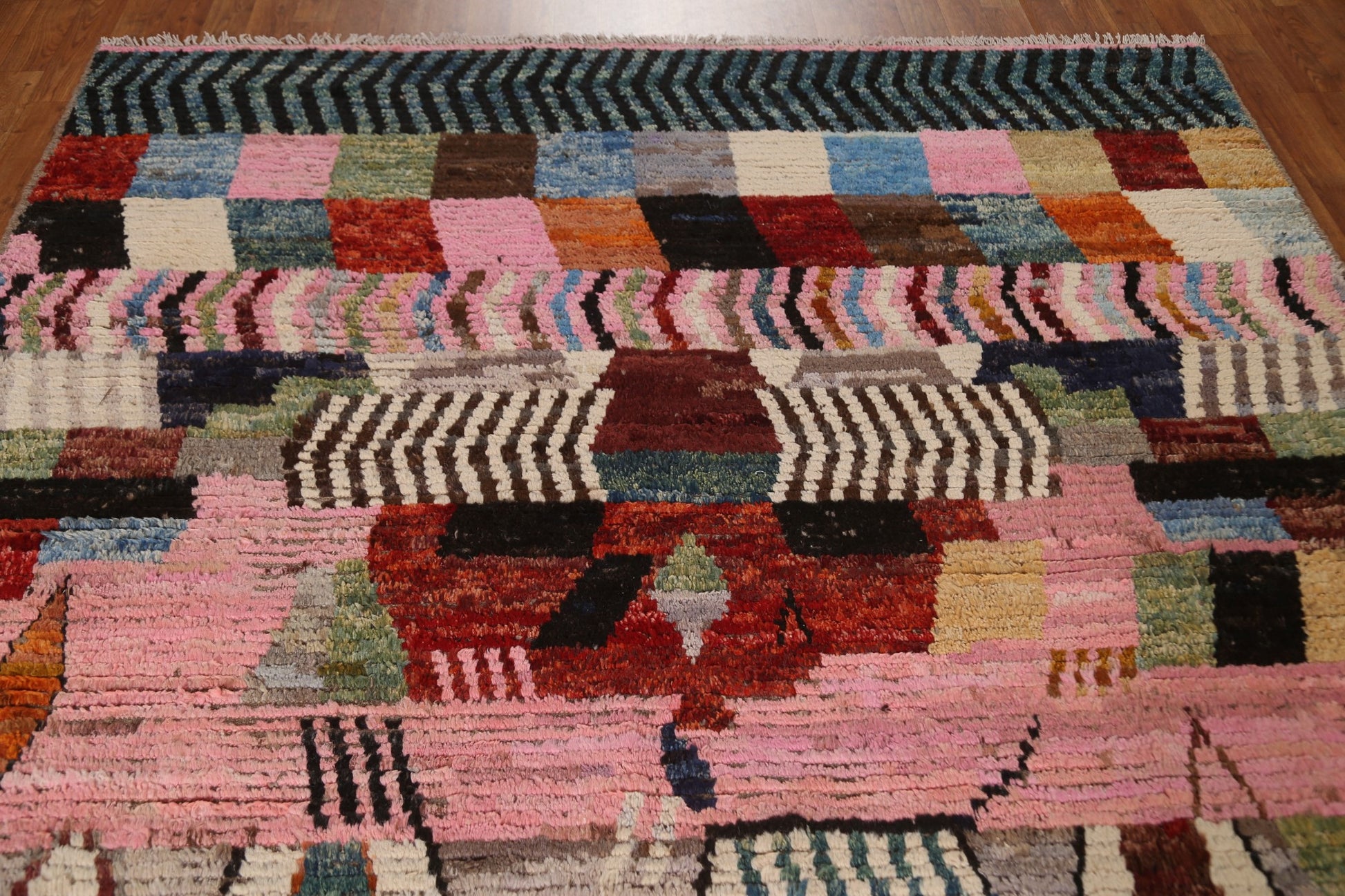 A Beautiful Genuine Pakistan Moroccan rug is Hand Knotted by skillful weavers in Pakistan with 100% Wool Material. This rug is in condition. dimensions are 9' 11'' X 6' 8'' in foot and 302 X 203 in centimeter. the primary color is Pink.