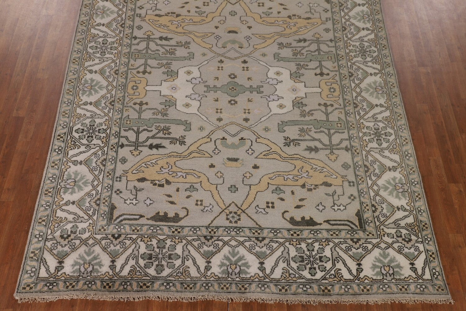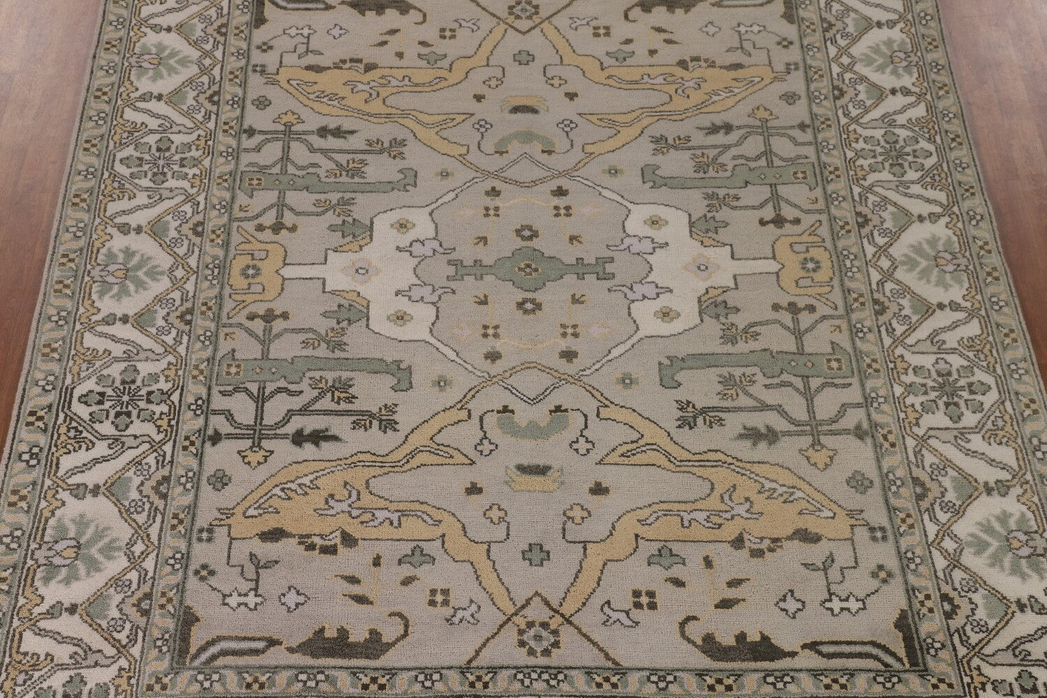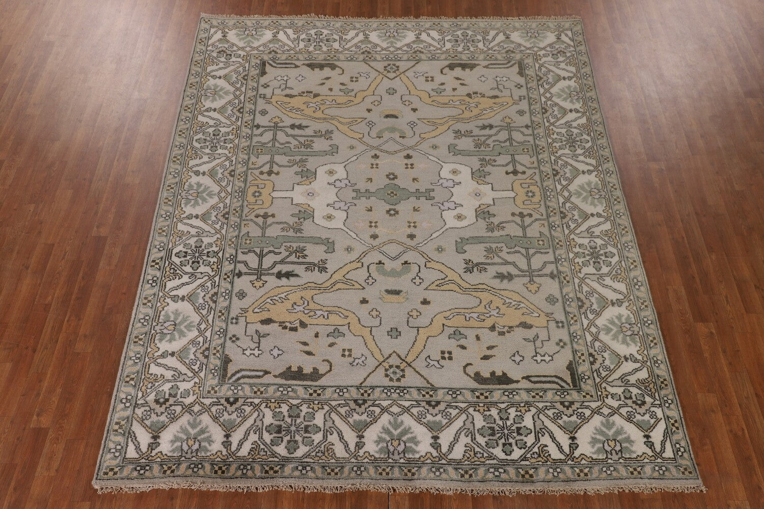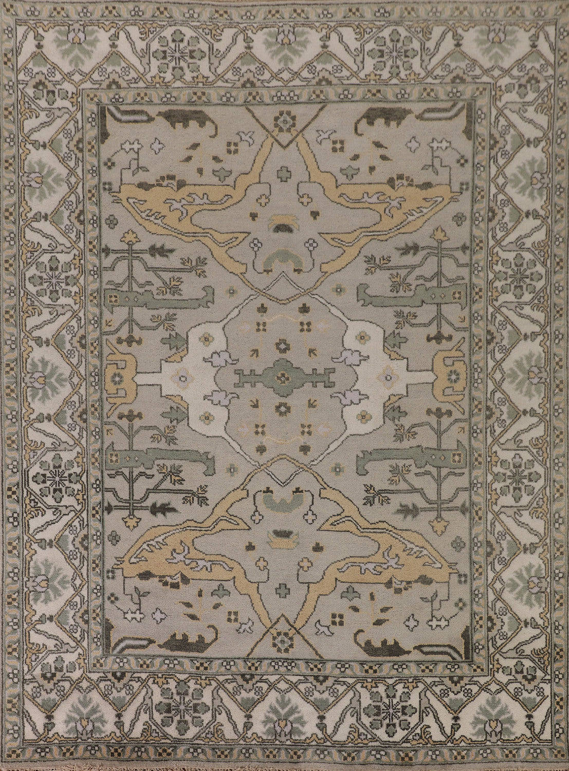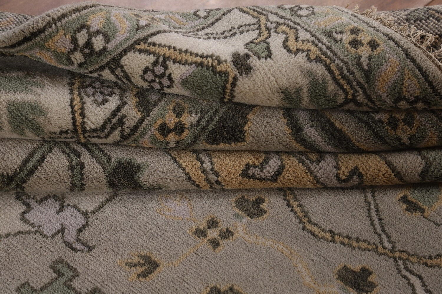 A Beautiful Genuine India Oushak rug is Hand Knotted by skillful weavers in India with 100% Wool Material. This rug is in New, First Quality condition. dimensions are 9' 9'' X 8' 0'' in foot and 297 X 244 in centimeter. the primary color is Beige & Ivories.