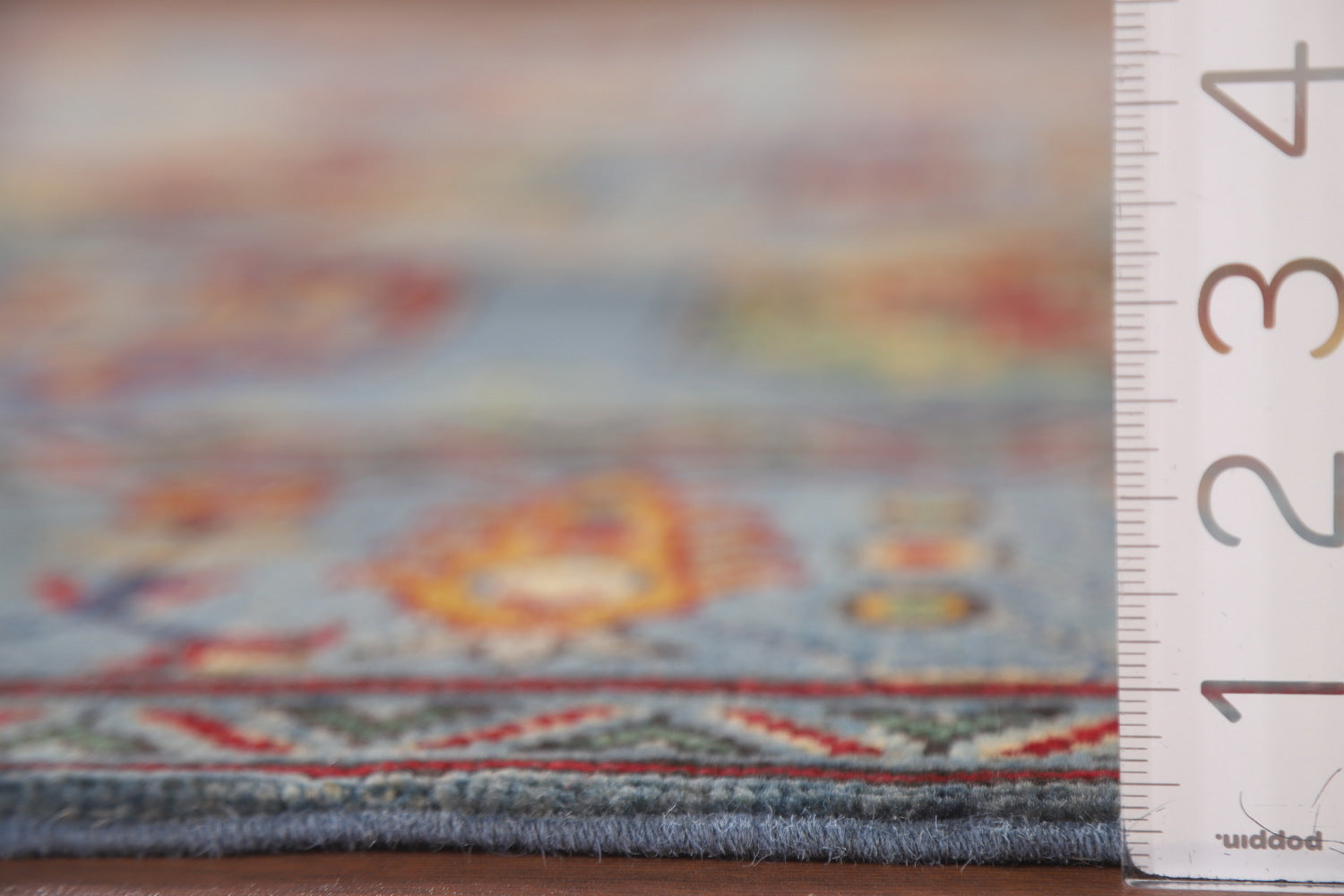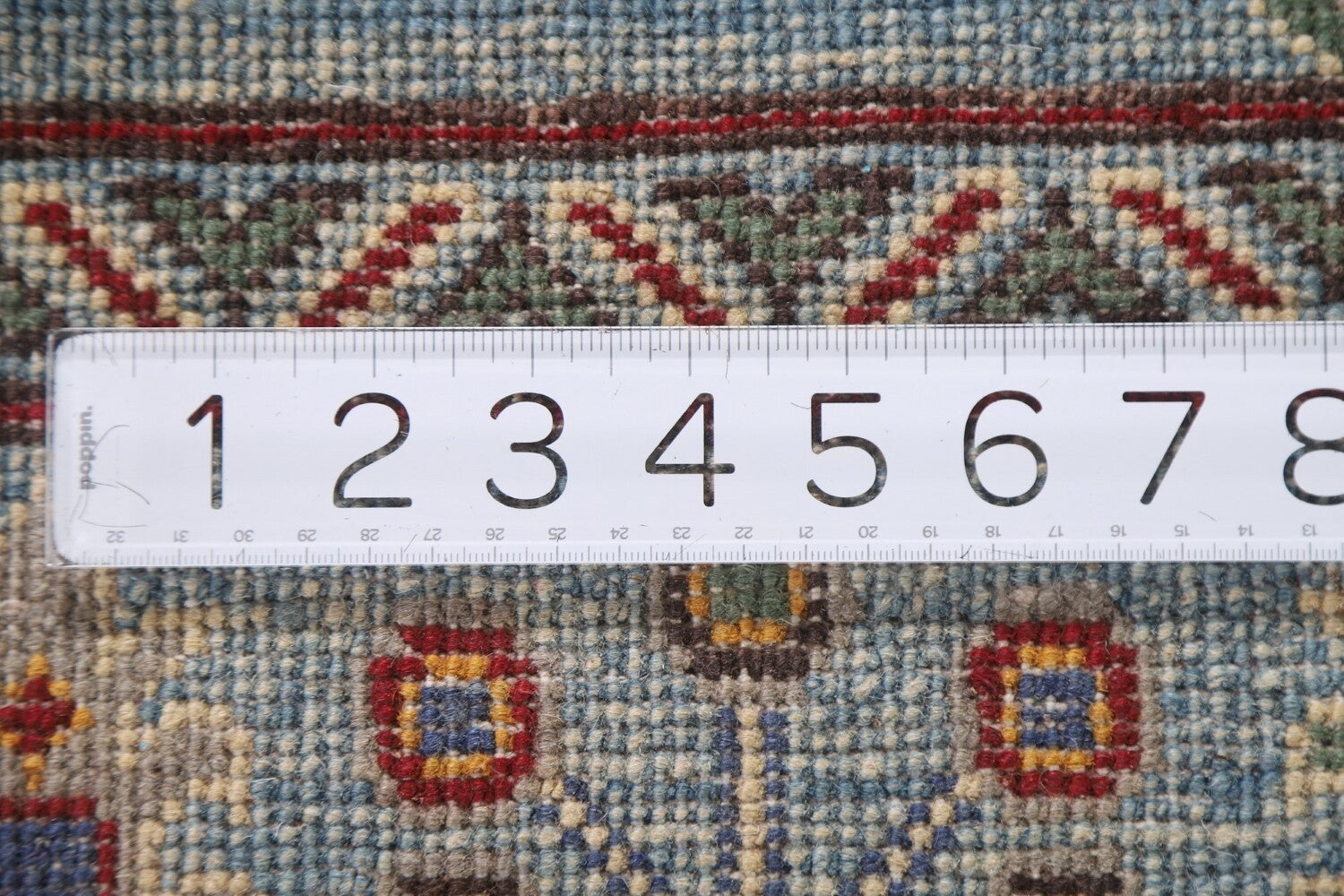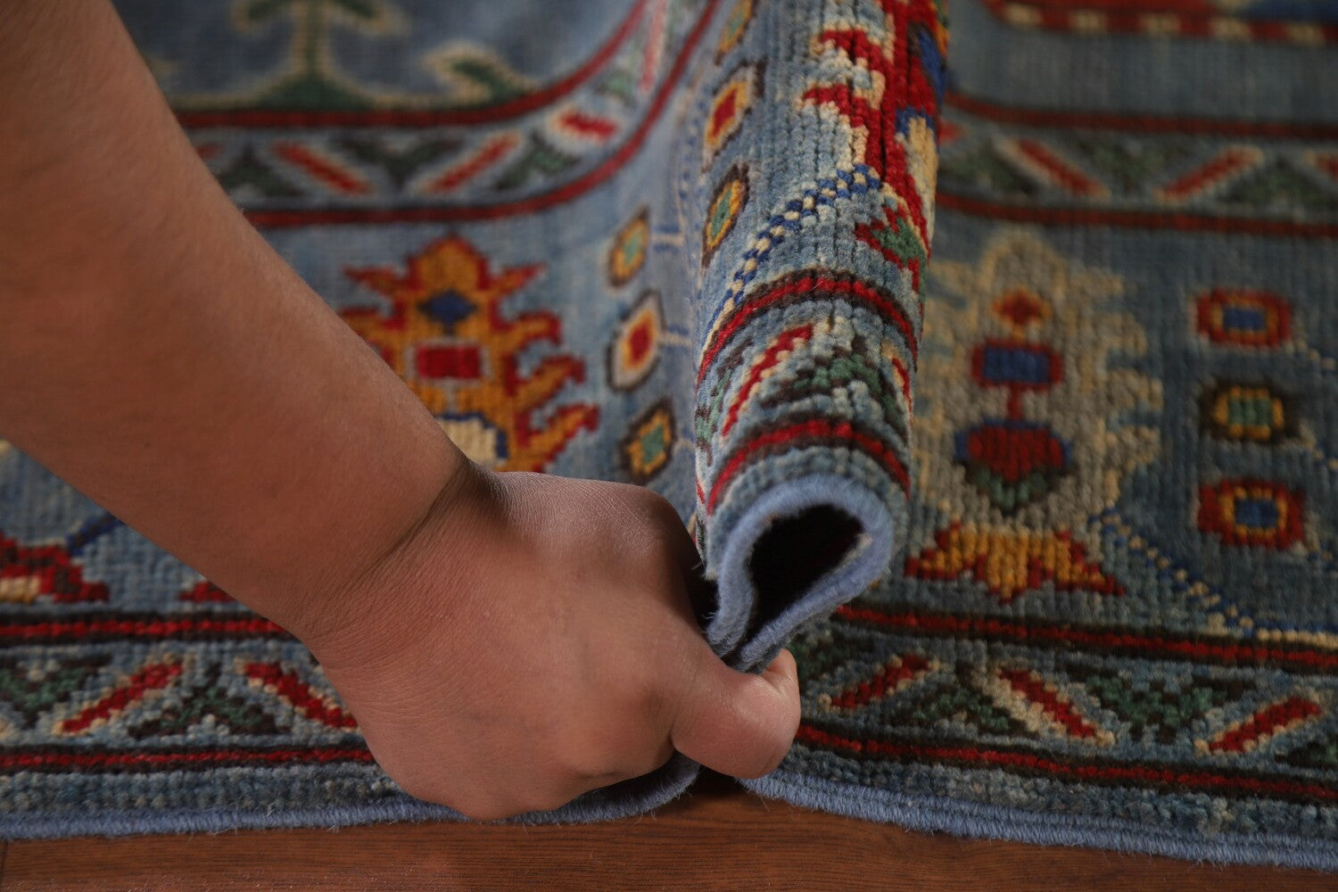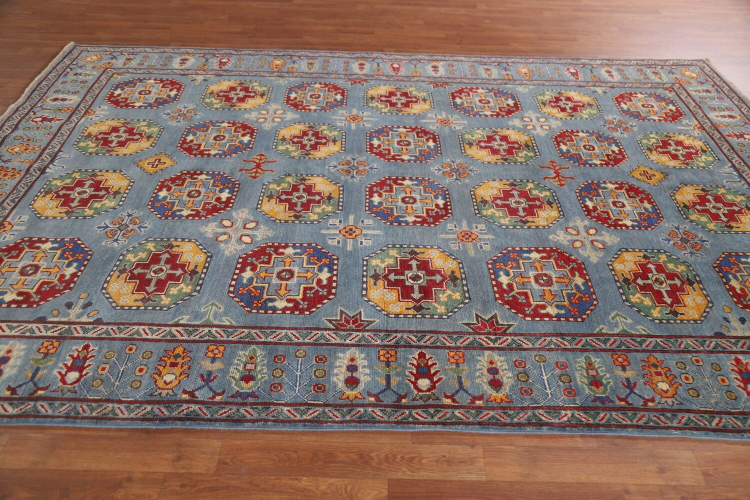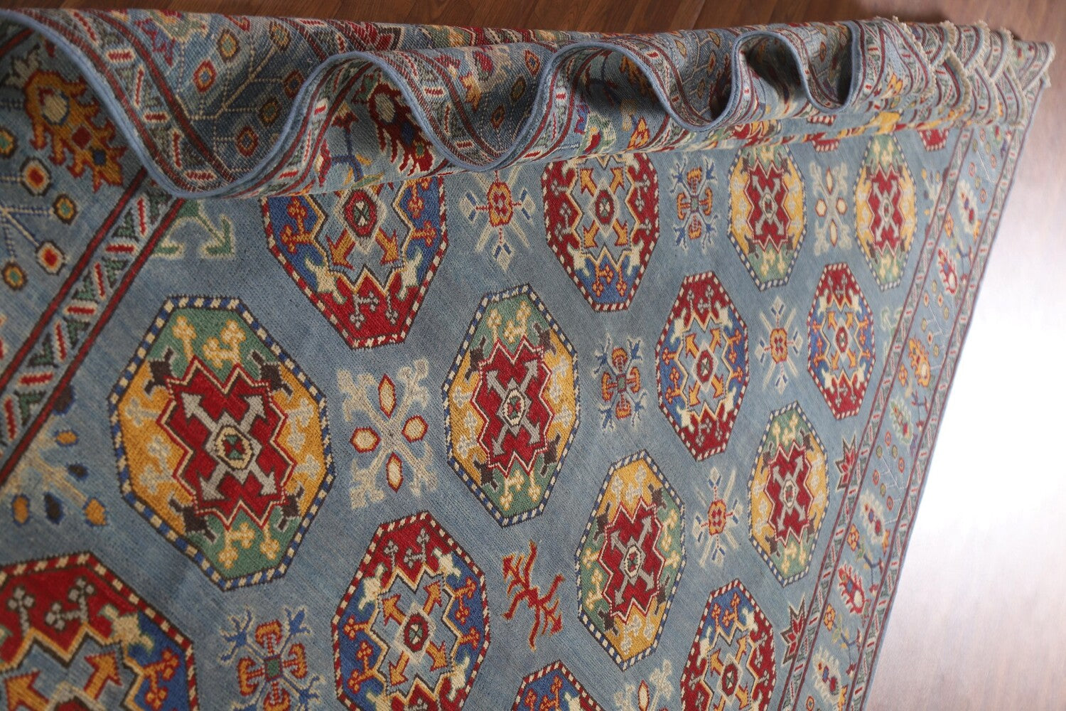 A Beautiful Genuine Pakistan Kazak rug is Hand Knotted by skillful weavers in Pakistan with 100% Wool Material. This rug is in New, First Quality condition. dimensions are 9' 8'' X 6' 9'' in foot and 295 X 206 in centimeter. the primary color is Navy Blue & Blues.
