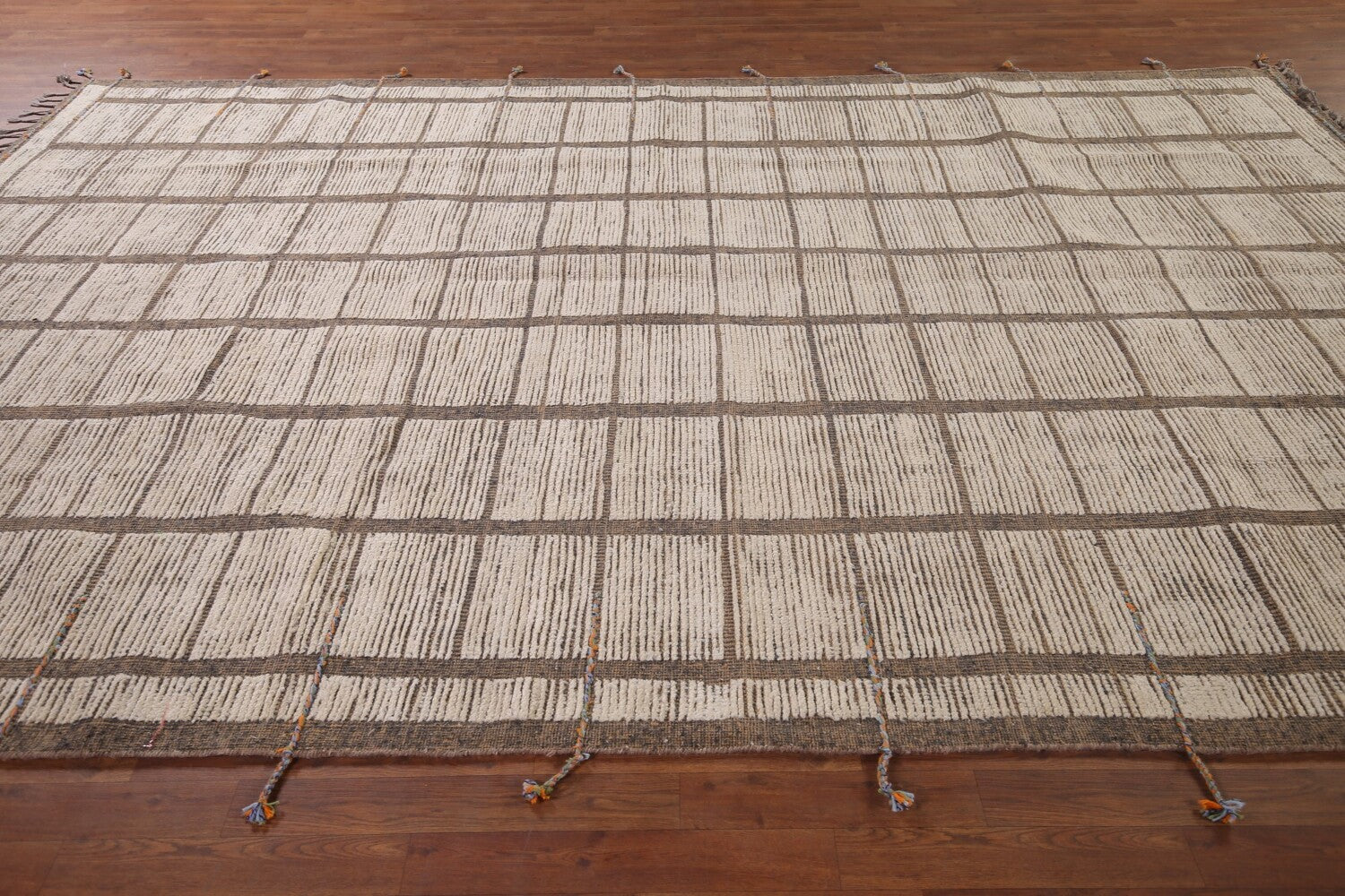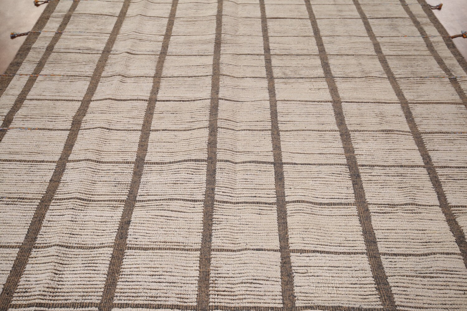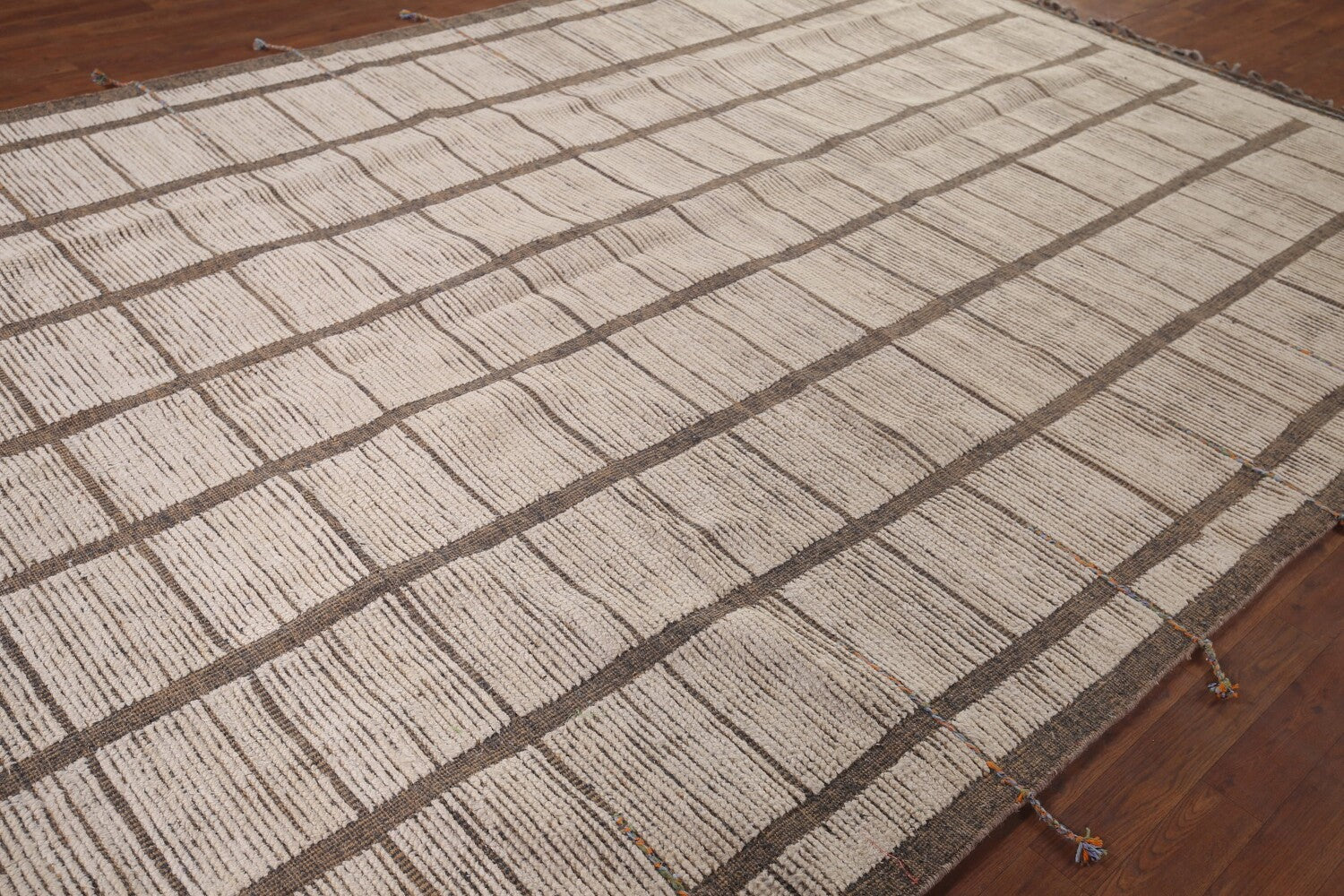 A Beautiful Genuine Pakistan Moroccan rug is Hand Knotted by skillful weavers in Pakistan with 100% Wool Material. This rug is in New, First Quality condition. dimensions are 12' 3'' X 8' 0'' in foot and 373 X 244 in centimeter. the primary color is Beige & Ivories.