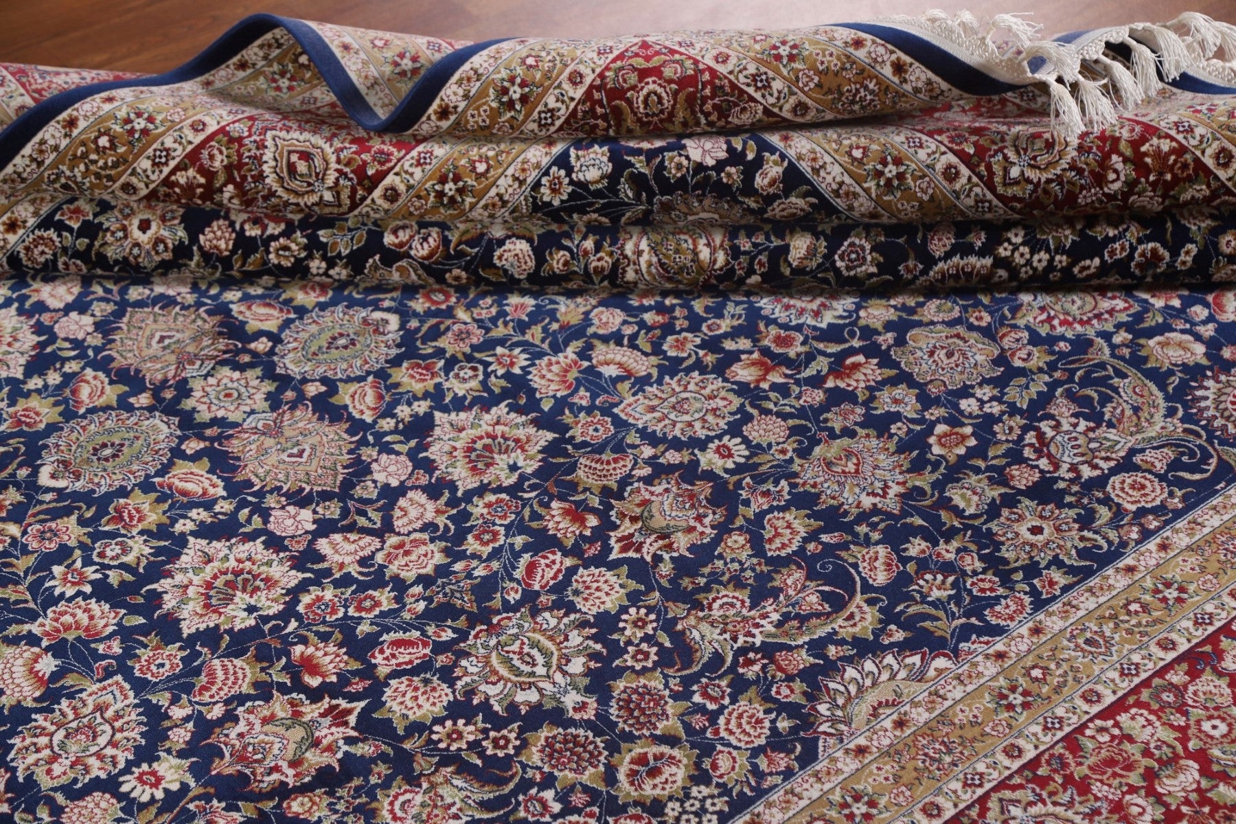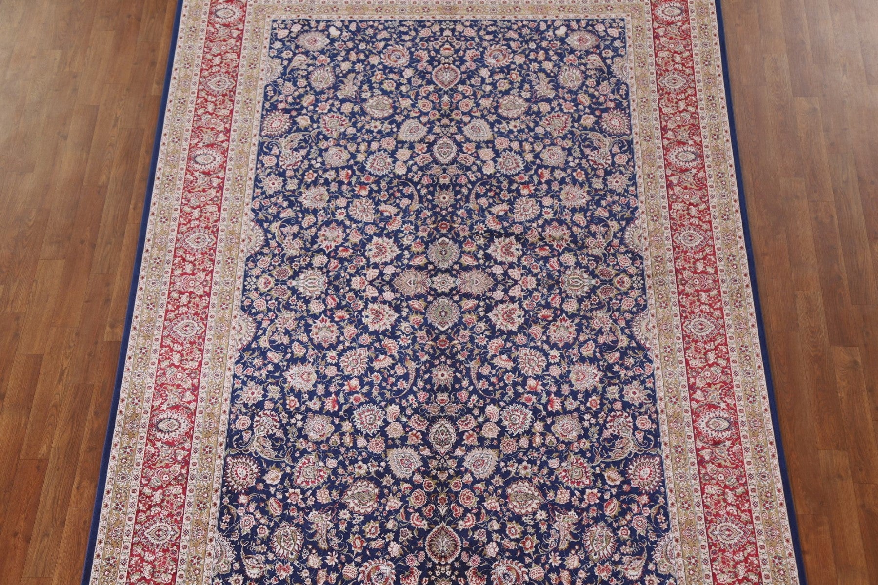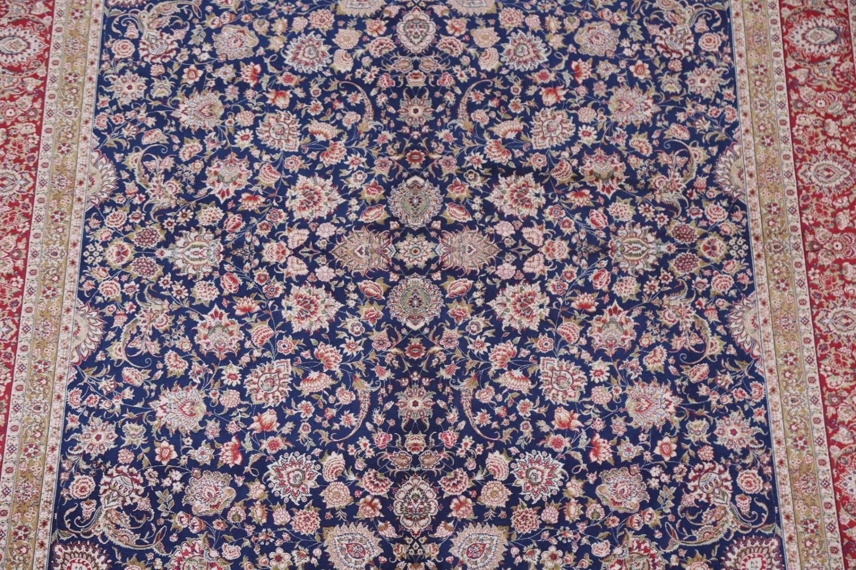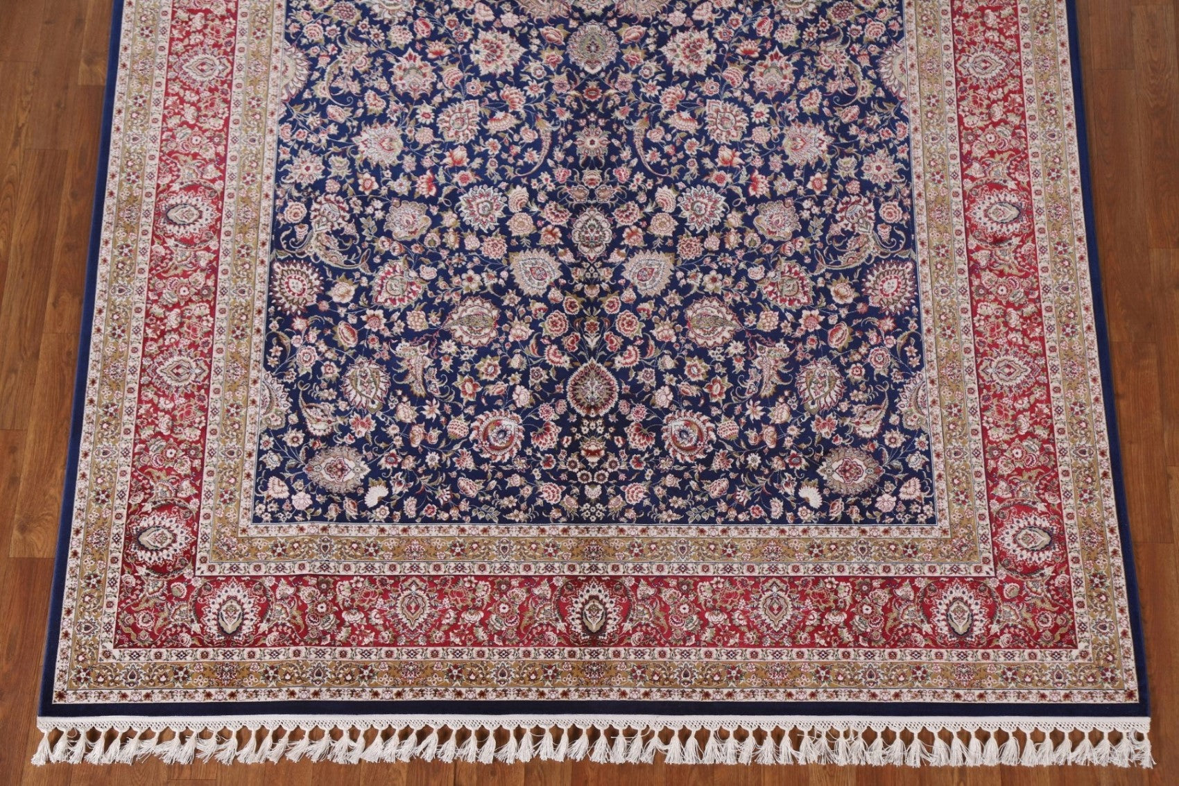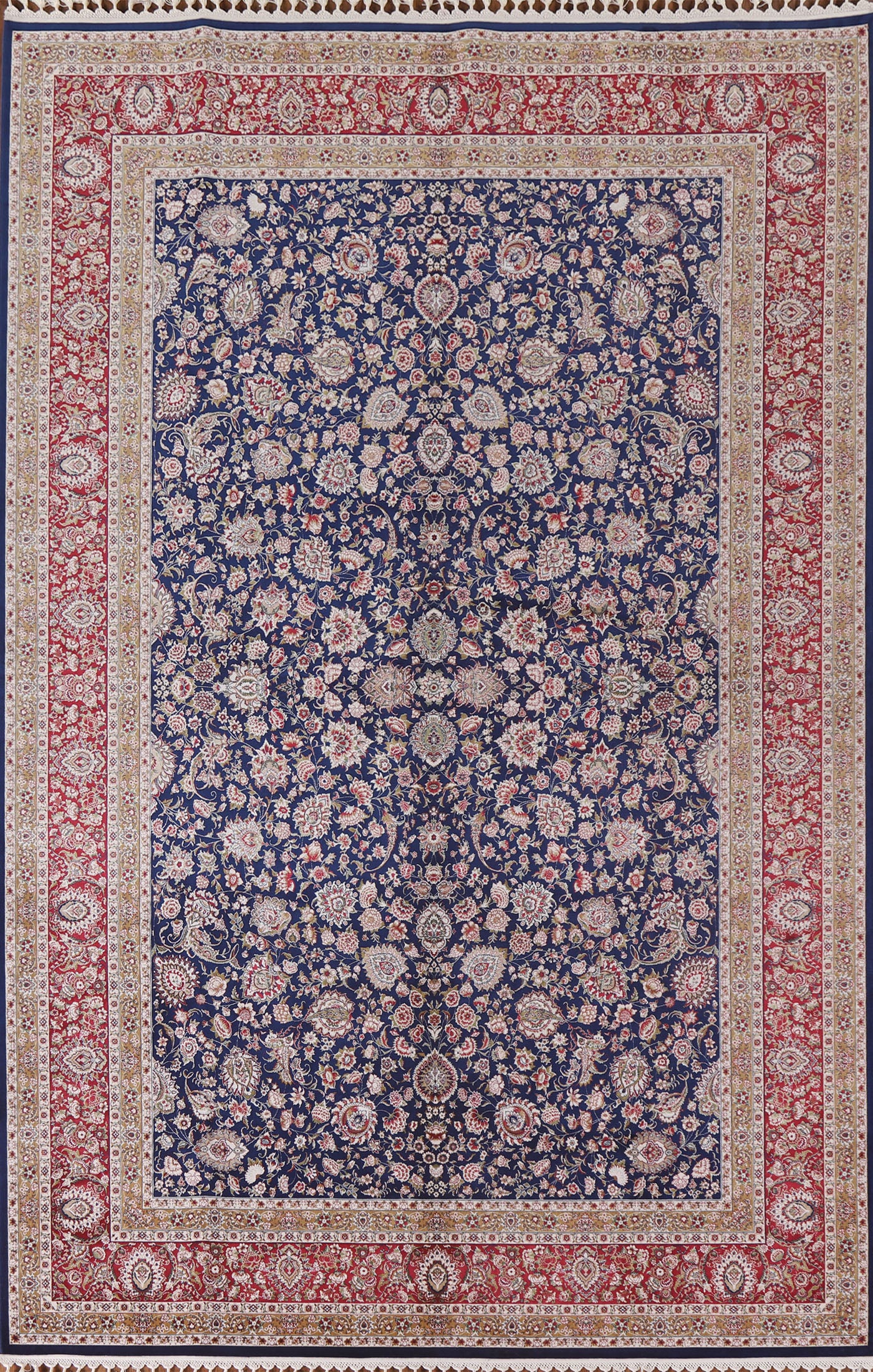 A Beautiful Genuine Turkey Tabriz rug is Machine Made by skillful weavers in Turkey with 90% Silk - 10% Polyester Material. This rug is in condition. dimensions are 9' 11'' X 6' 6'' in foot and 302 X 198 in centimeter. the primary color is Navy Blue & Blues.