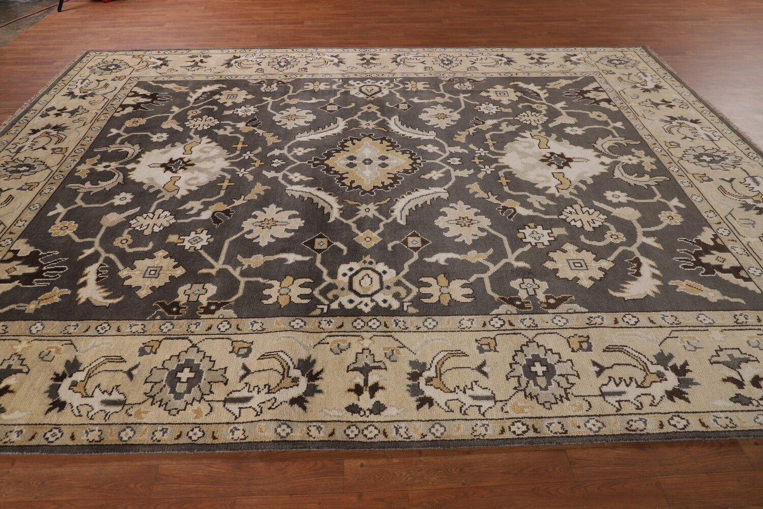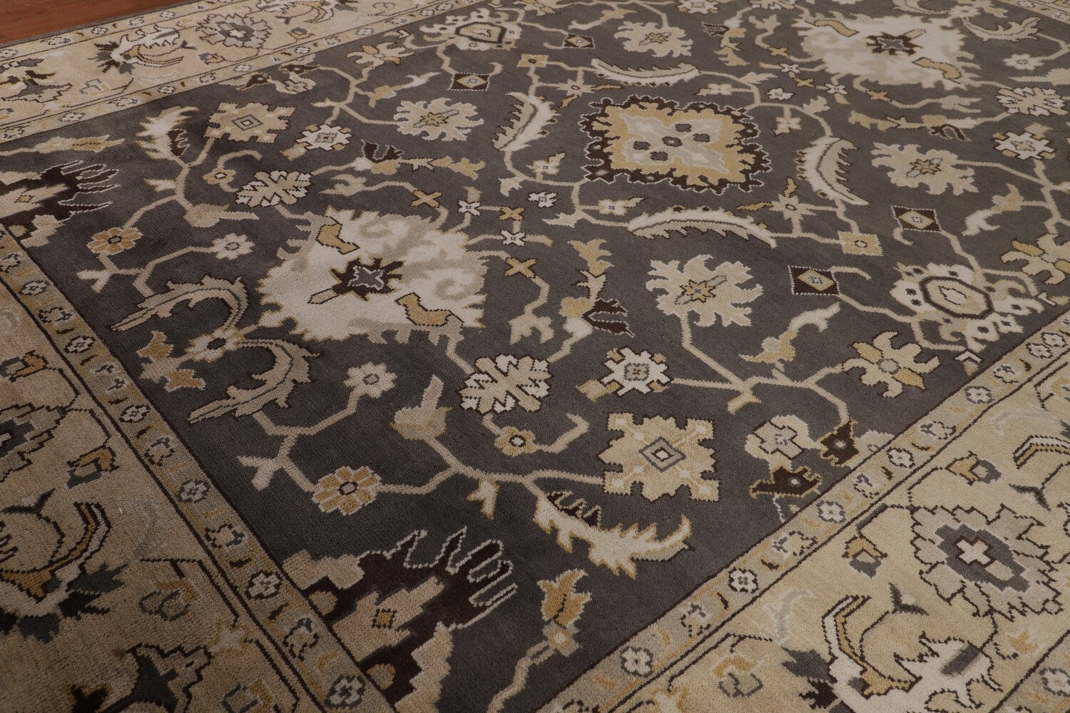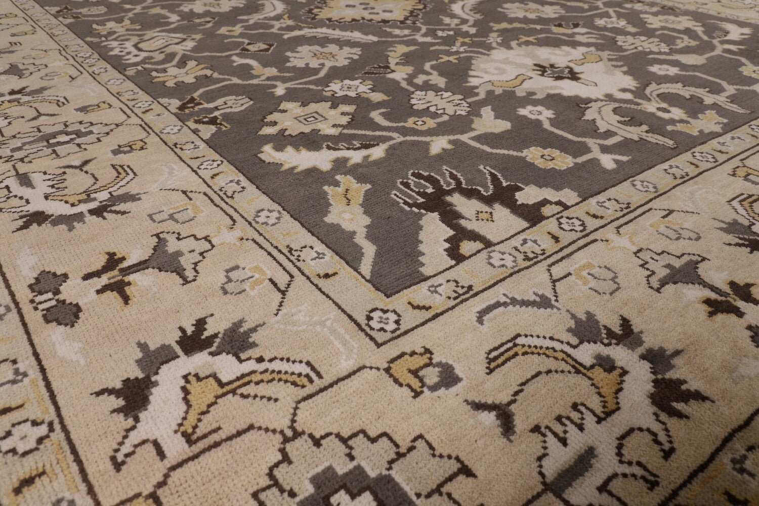 A Beautiful Genuine India Oushak rug is Hand Knotted by skillful weavers in India with 100% Wool Material. This rug is in New, First Quality condition. dimensions are 11' 7'' X 9' 3'' in foot and 353 X 282 in centimeter. the primary color is Greys & Charcoal.