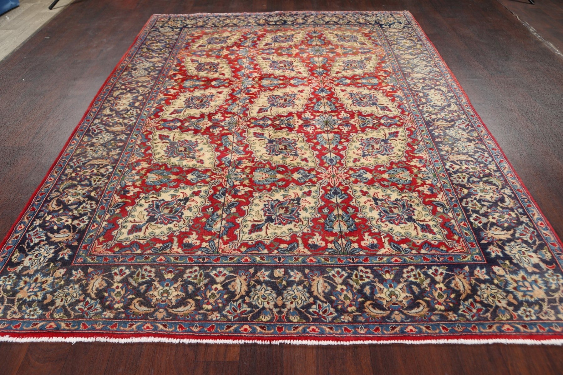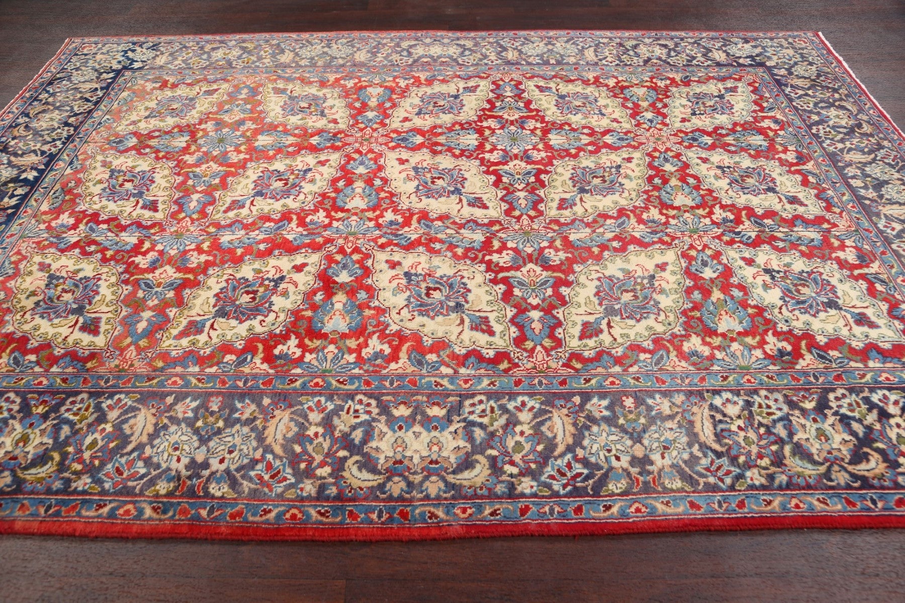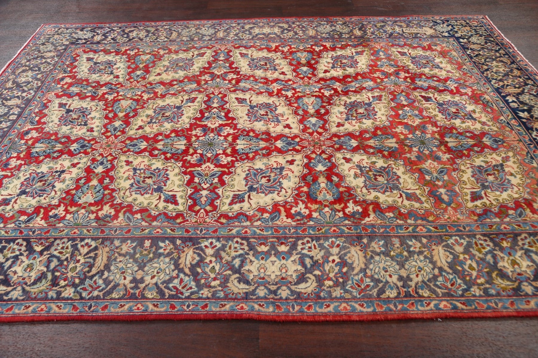 A Beautiful Genuine Persia ( Persia ) Isfahan rug is Hand Knotted by skillful weavers in Persia ( Persia ) with 100% Wool Material. This rug is in Very Good (Low Pile-Abrash) condition. dimensions are 9' 4'' X 6' 9'' in foot and 284 X 206 in centimeter. the primary color is Red.