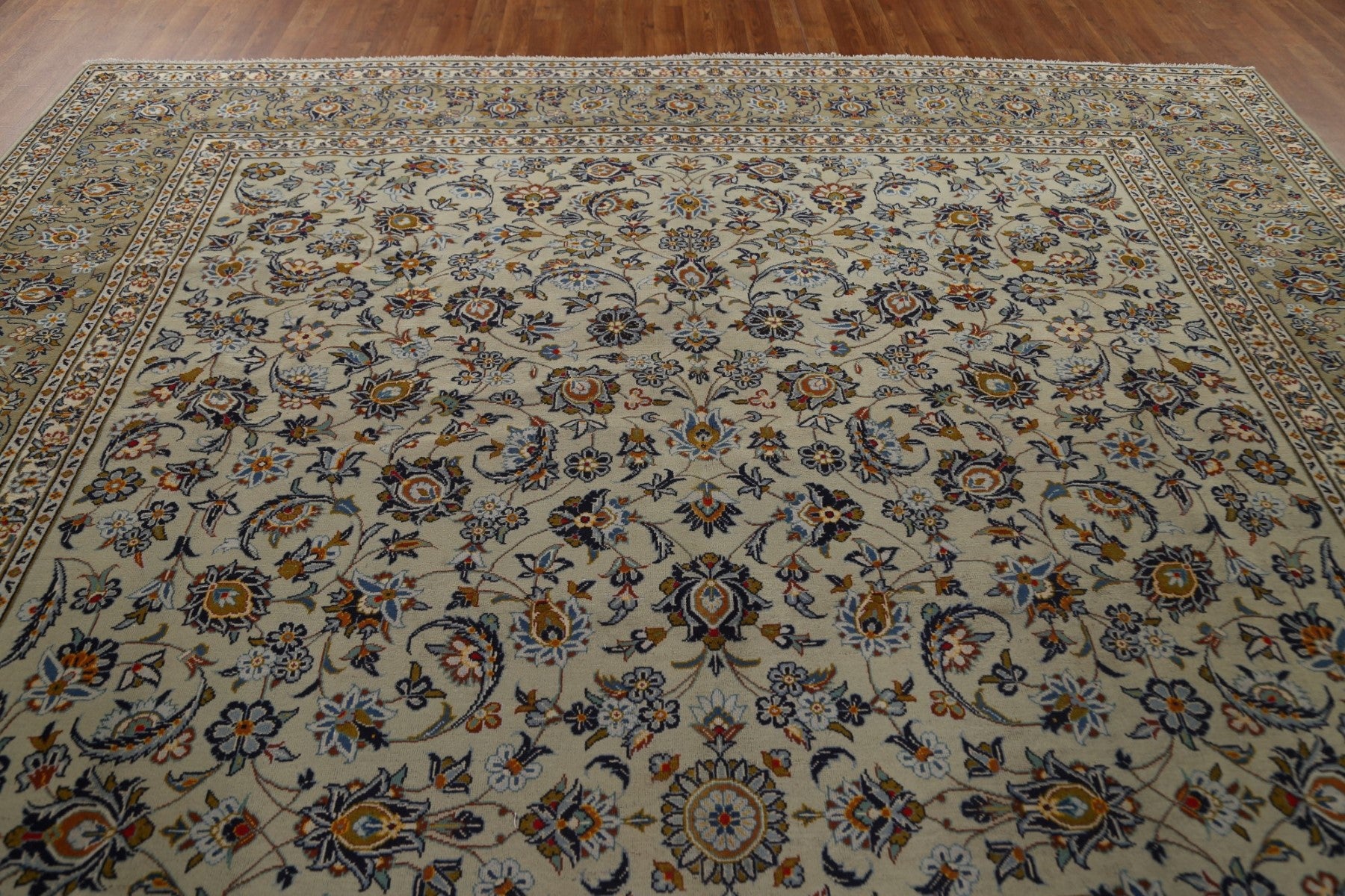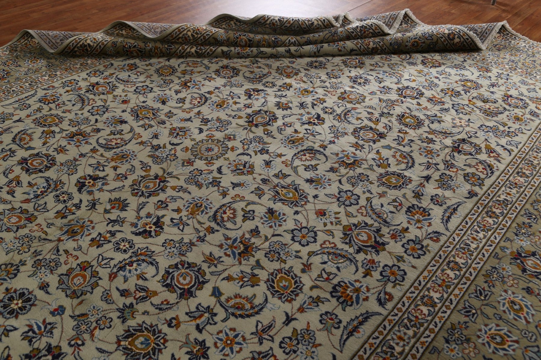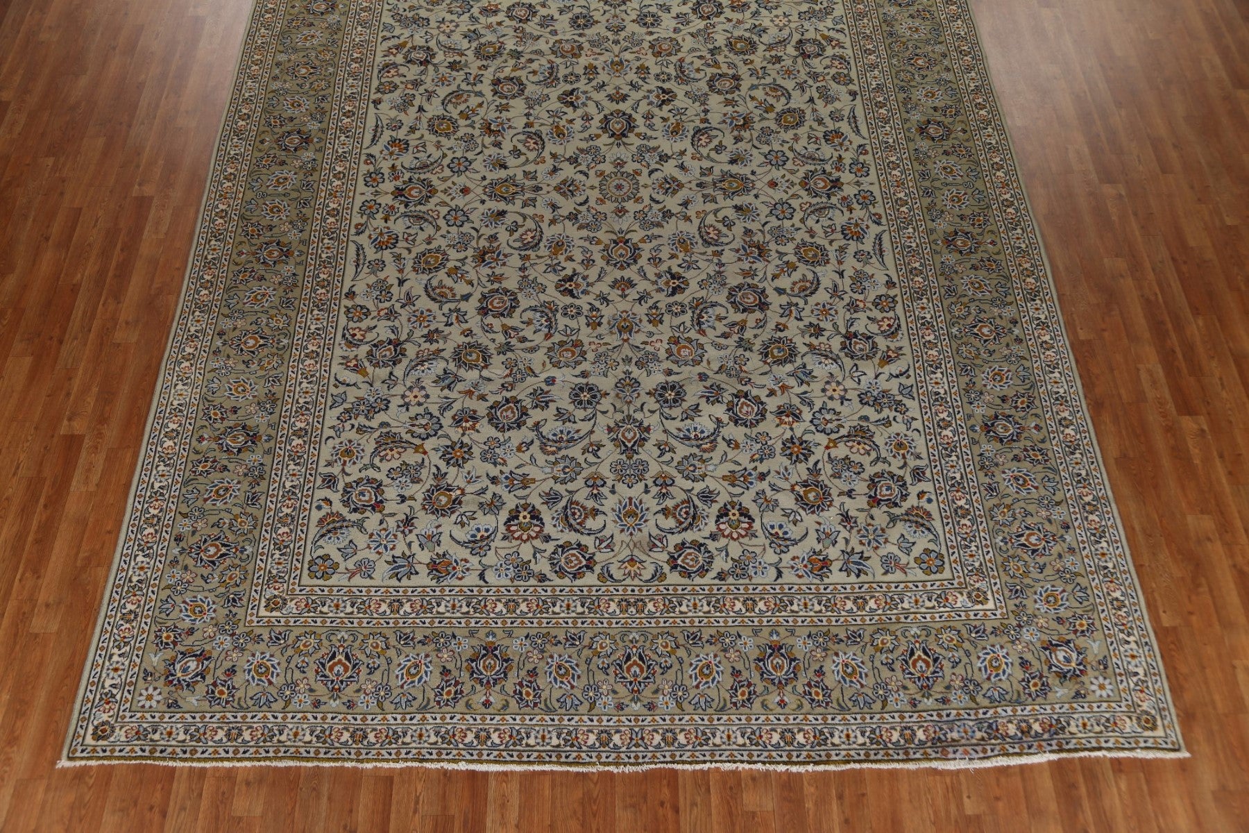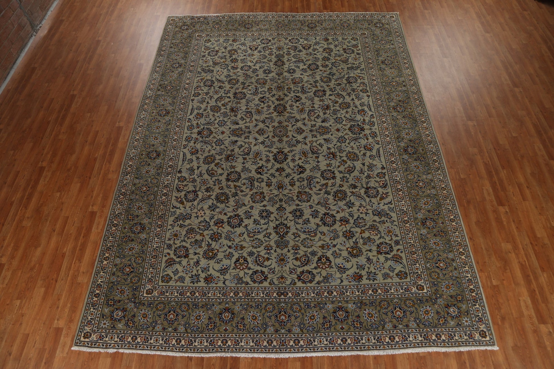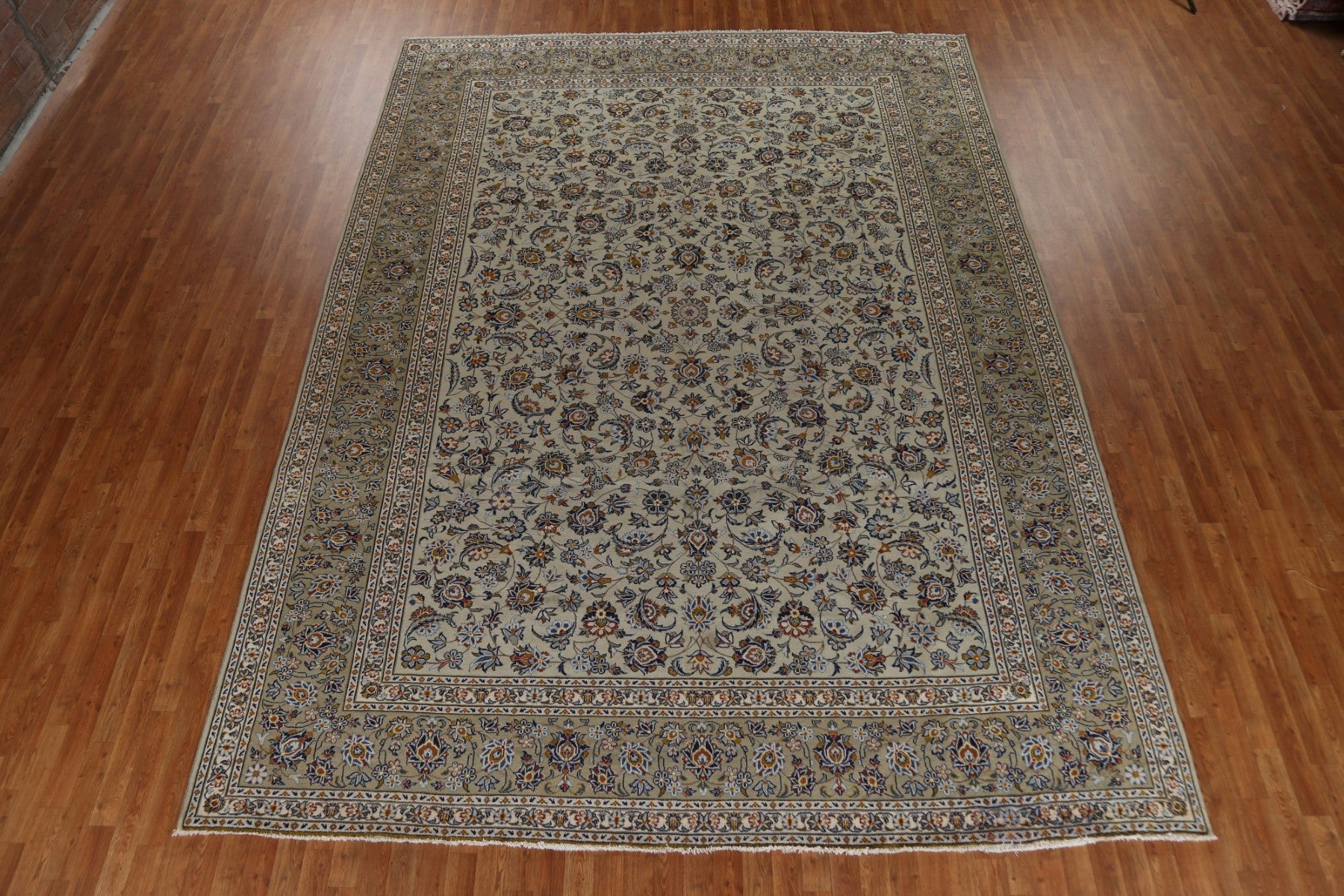 A Beautiful Genuine Persia ( Persia ) Kashan rug is Hand Knotted by skillful weavers in Persia ( Persia ) with 100% Wool Material. This rug is in Very Good condition. dimensions are 13' 5'' X 10' 1'' in foot and 409 X 307 in centimeter. the primary color is Green.