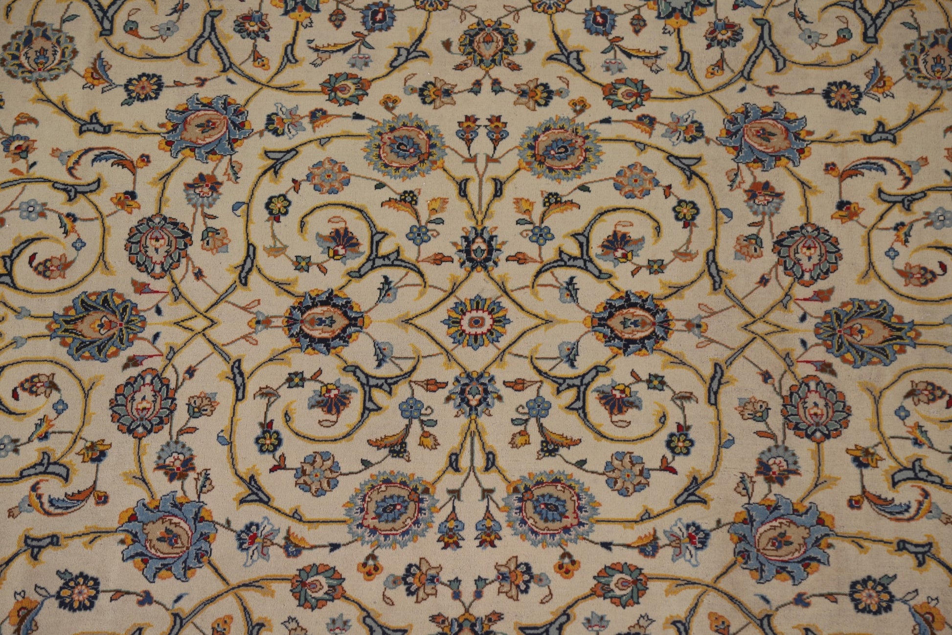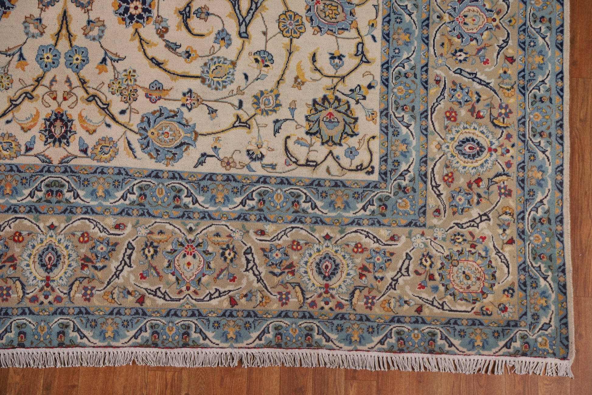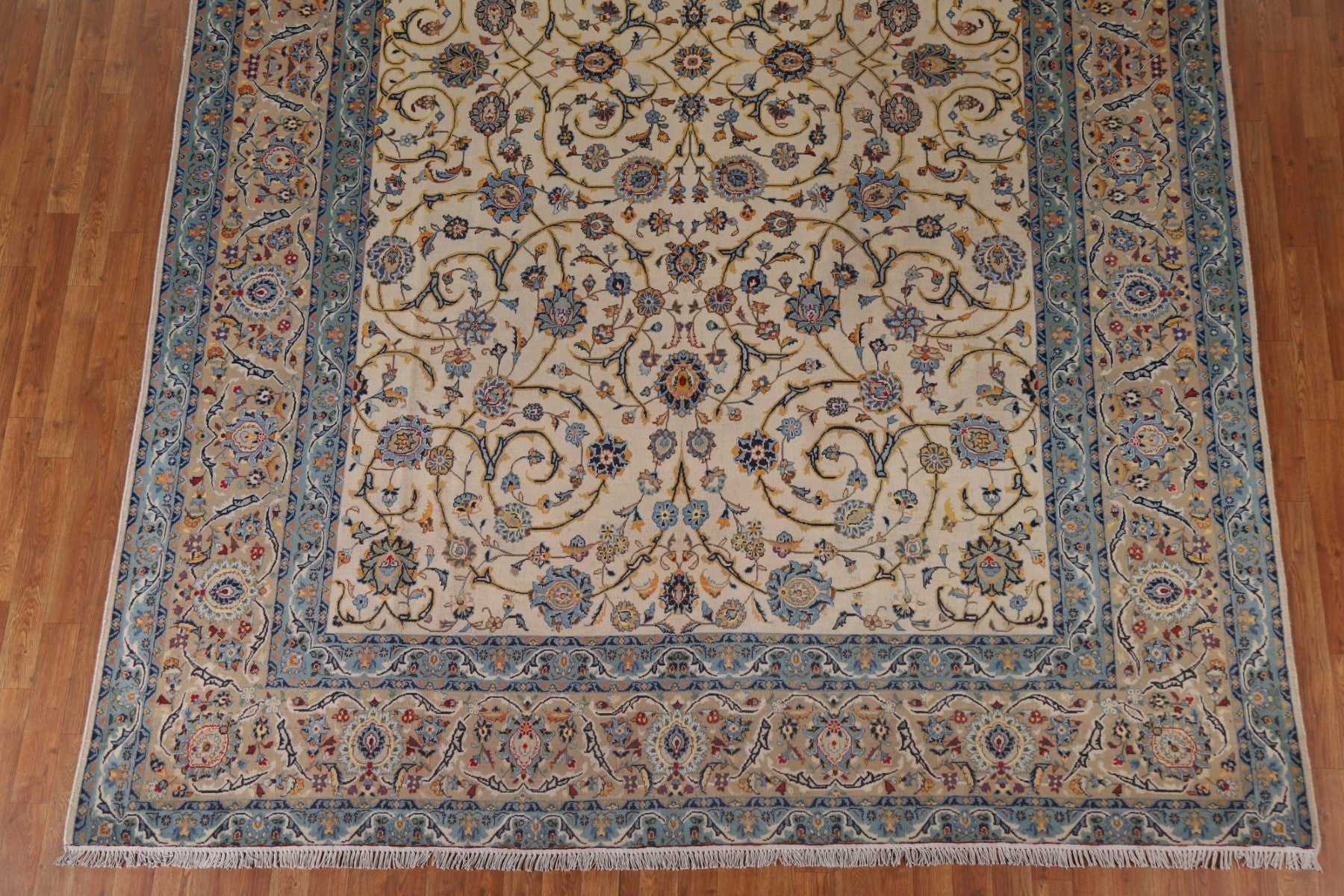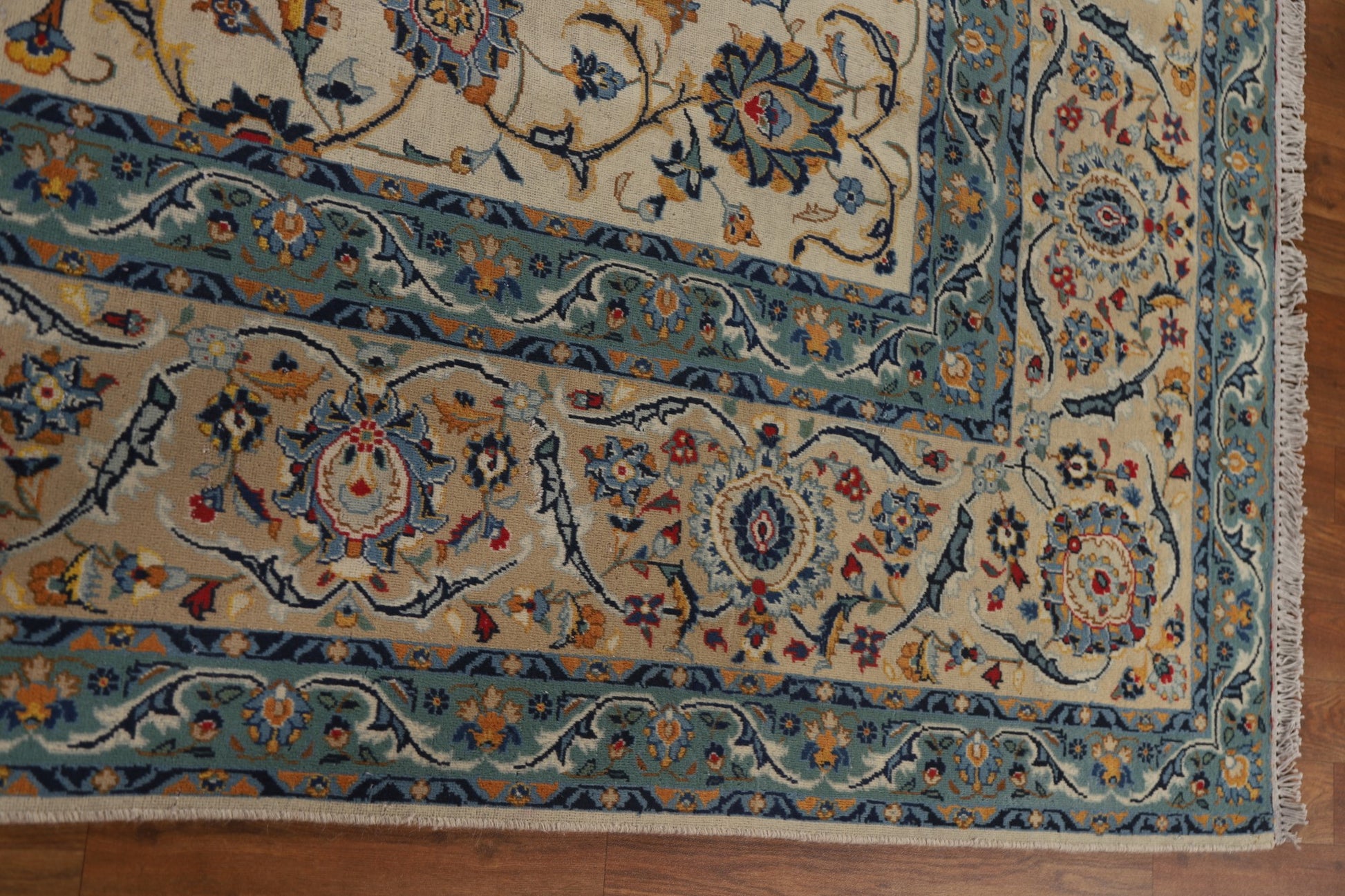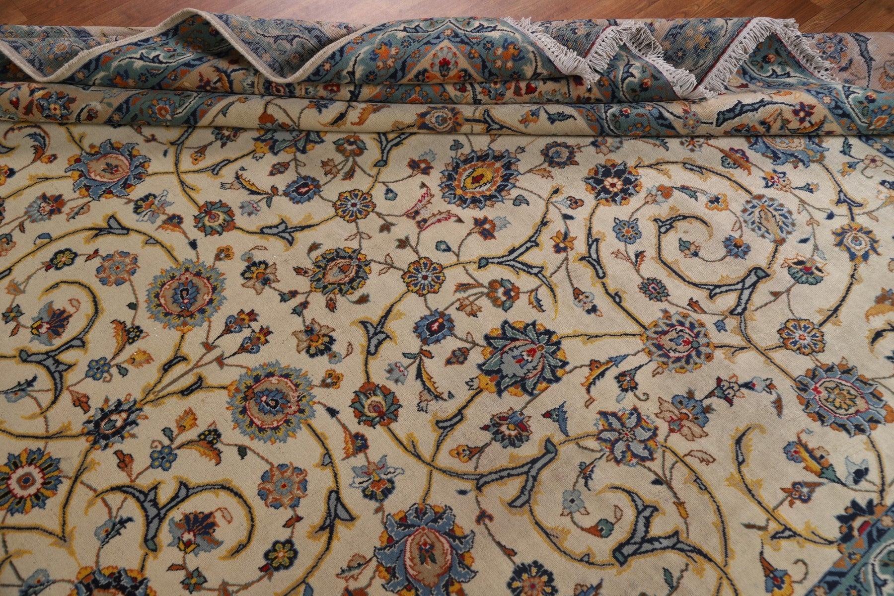A Beautiful Genuine Persia ( Persia ) Kashan rug is Hand Knotted by skillful weavers in Persia ( Persia ) with 100% Wool Material. This rug is in Very Good (Evenly Low Pile) condition. dimensions are 13' 0'' X 8' 10'' in foot and 396 X 269 in centimeter. the primary color is Beige & Ivories.