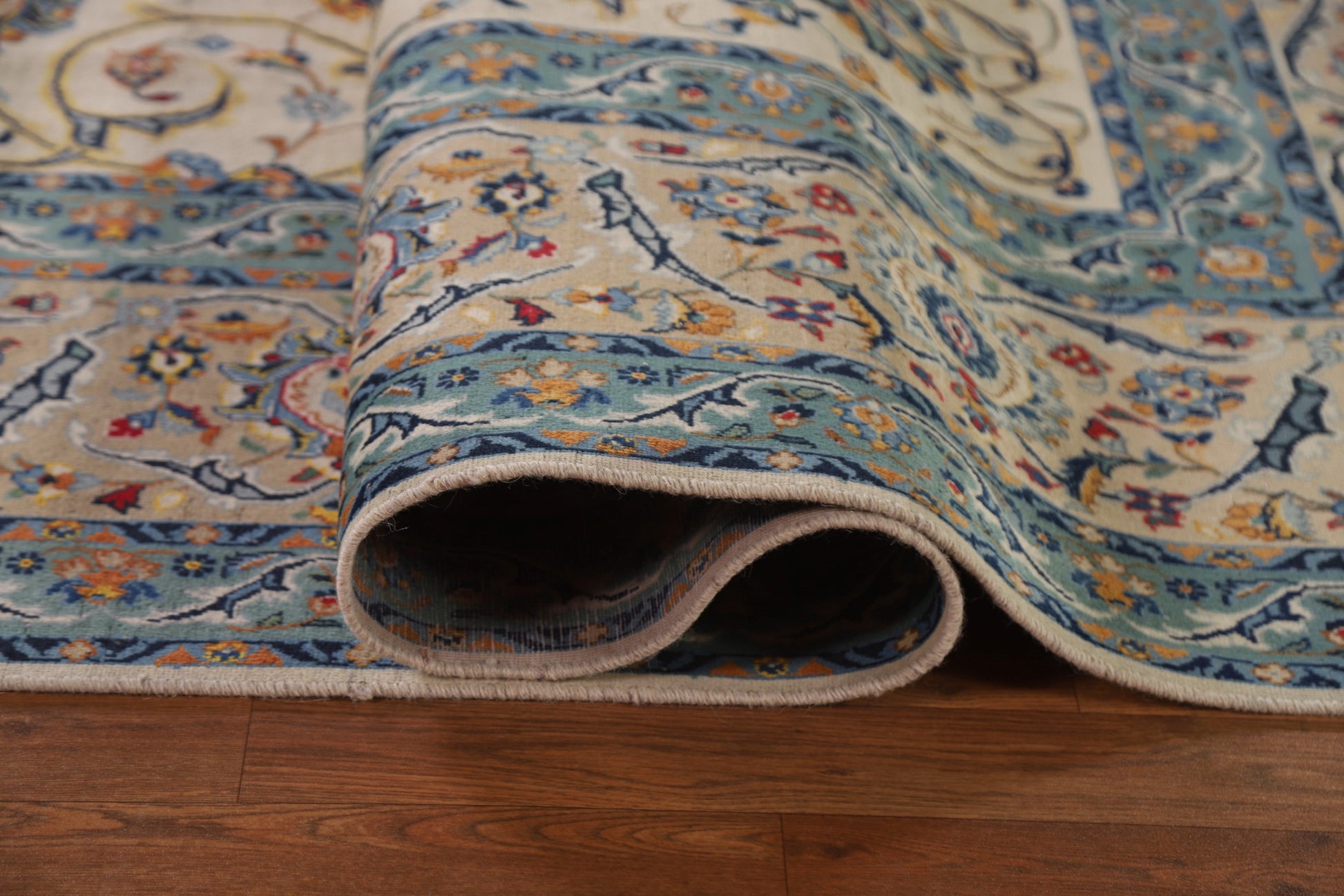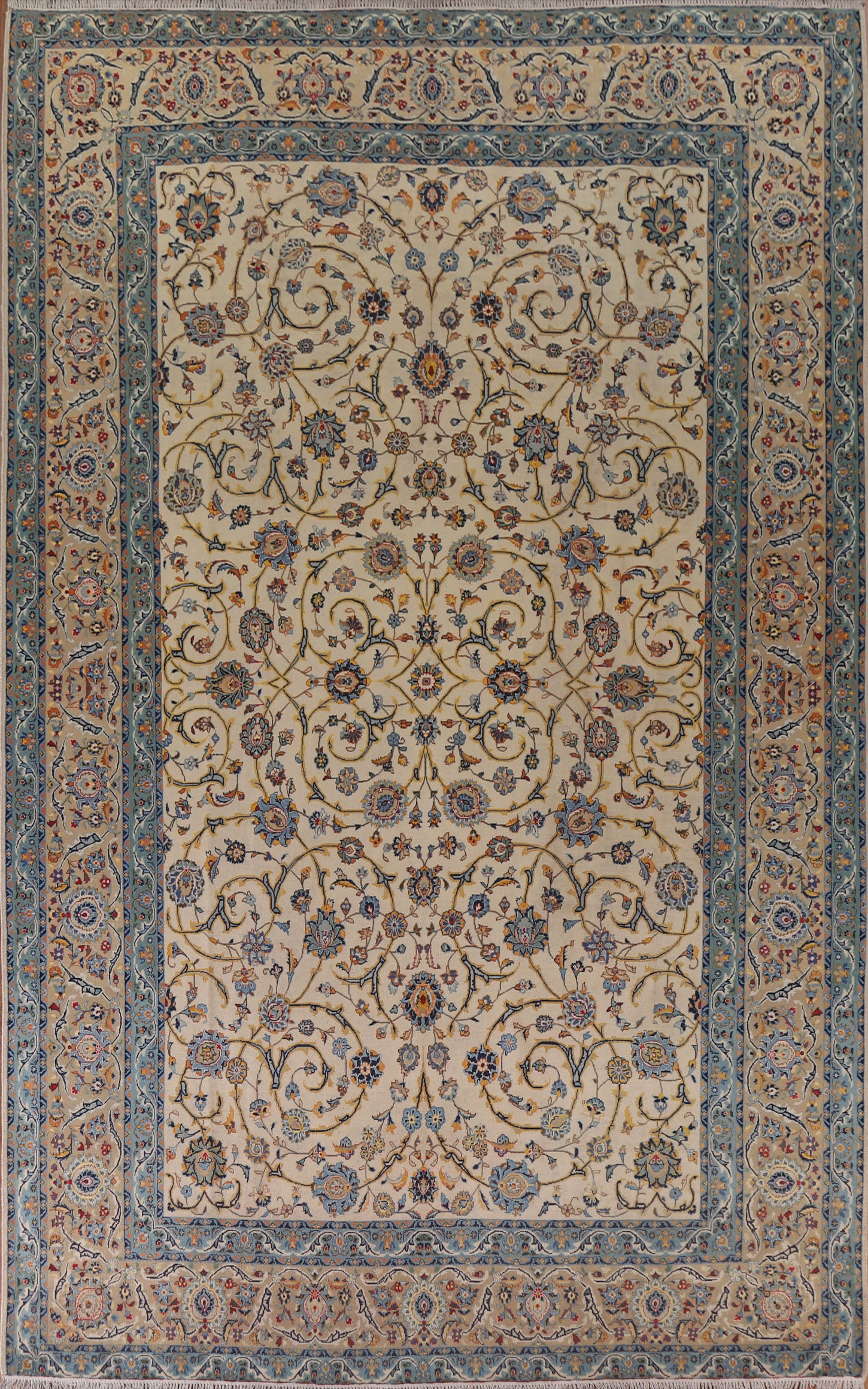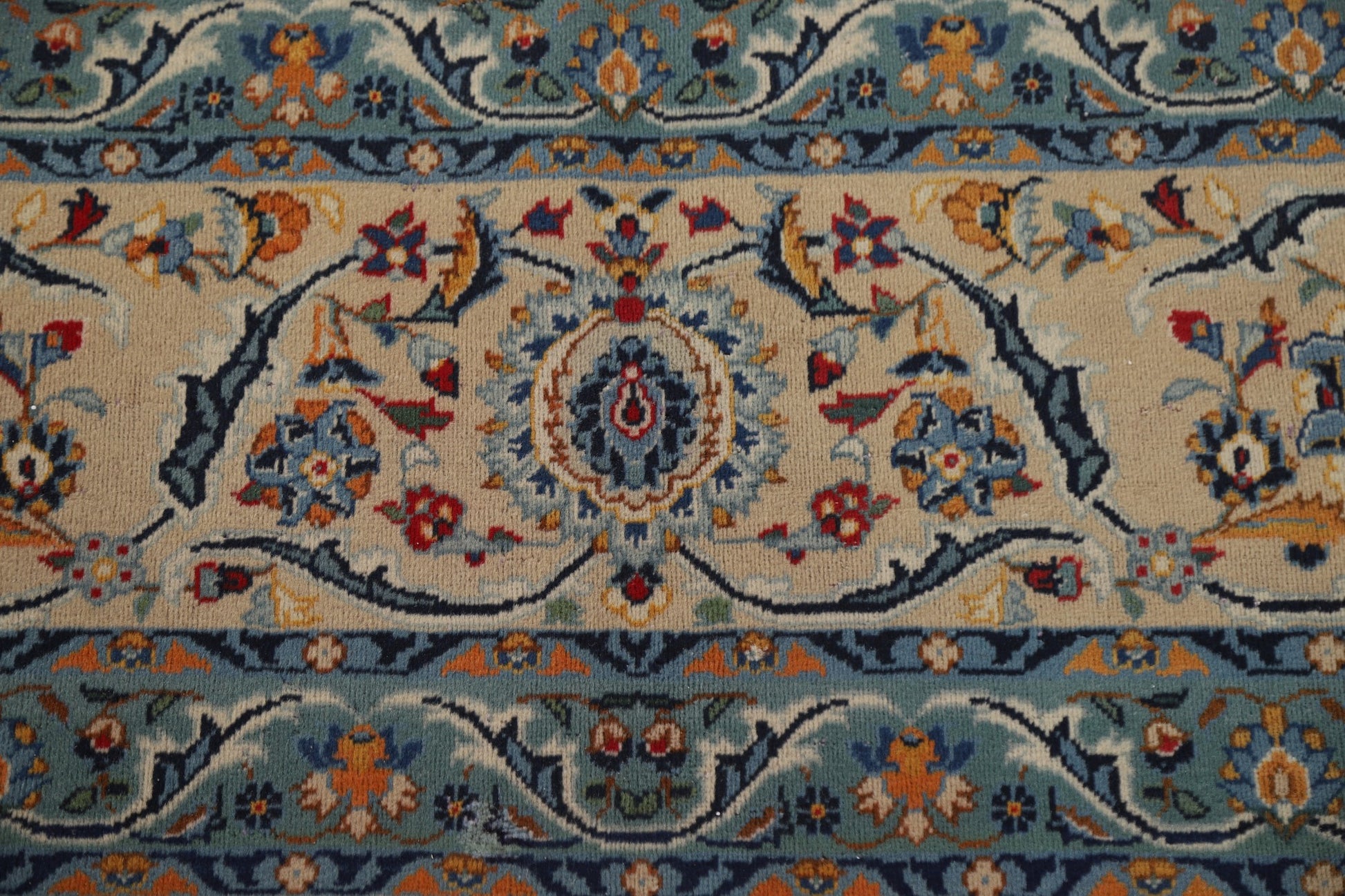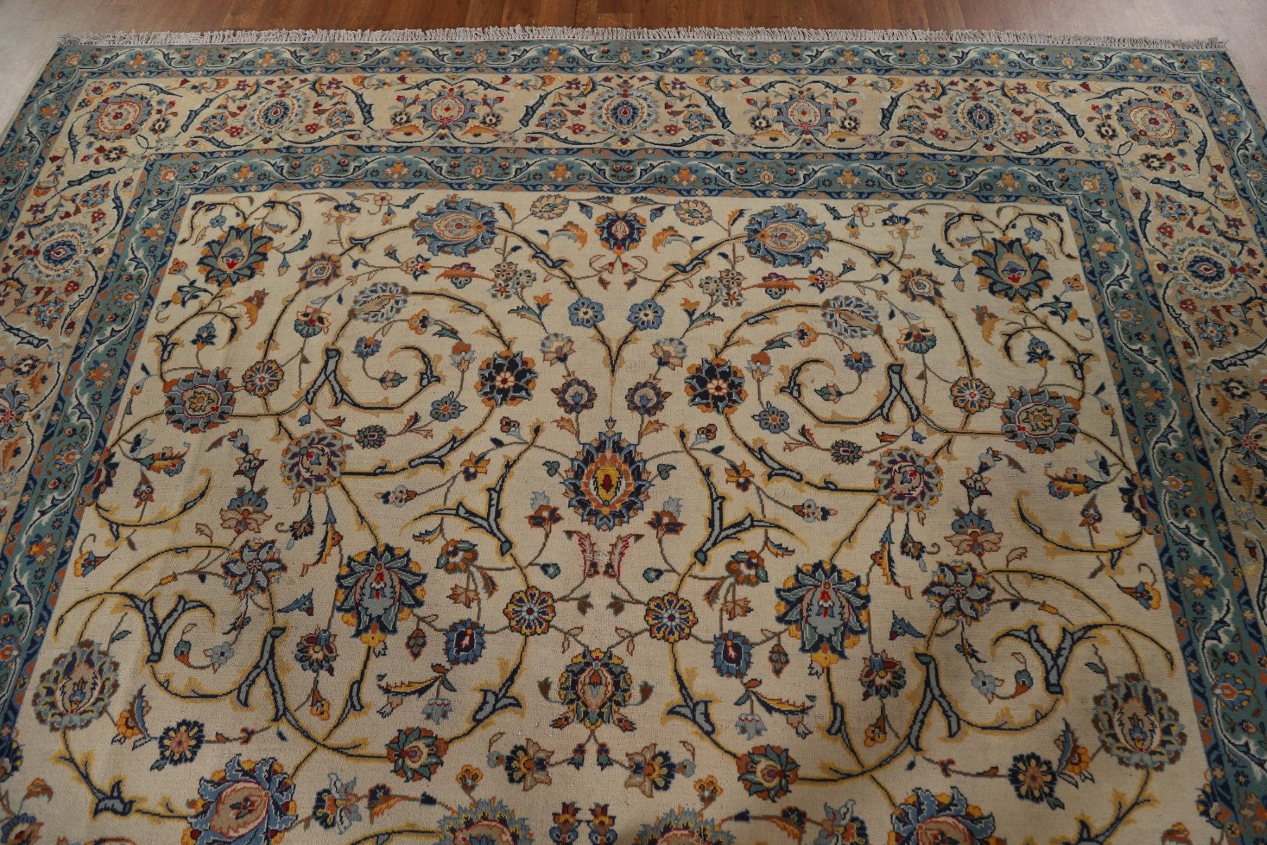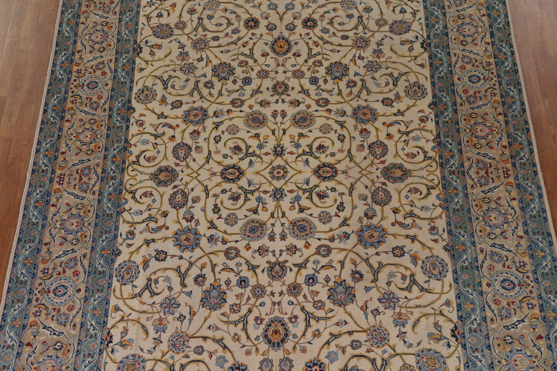 A Beautiful Genuine Persia ( Persia ) Kashan rug is Hand Knotted by skillful weavers in Persia ( Persia ) with 100% Wool Material. This rug is in Very Good (Evenly Low Pile) condition. dimensions are 13' 0'' X 8' 10'' in foot and 396 X 269 in centimeter. the primary color is Beige & Ivories.