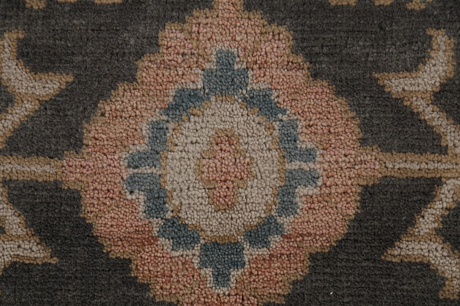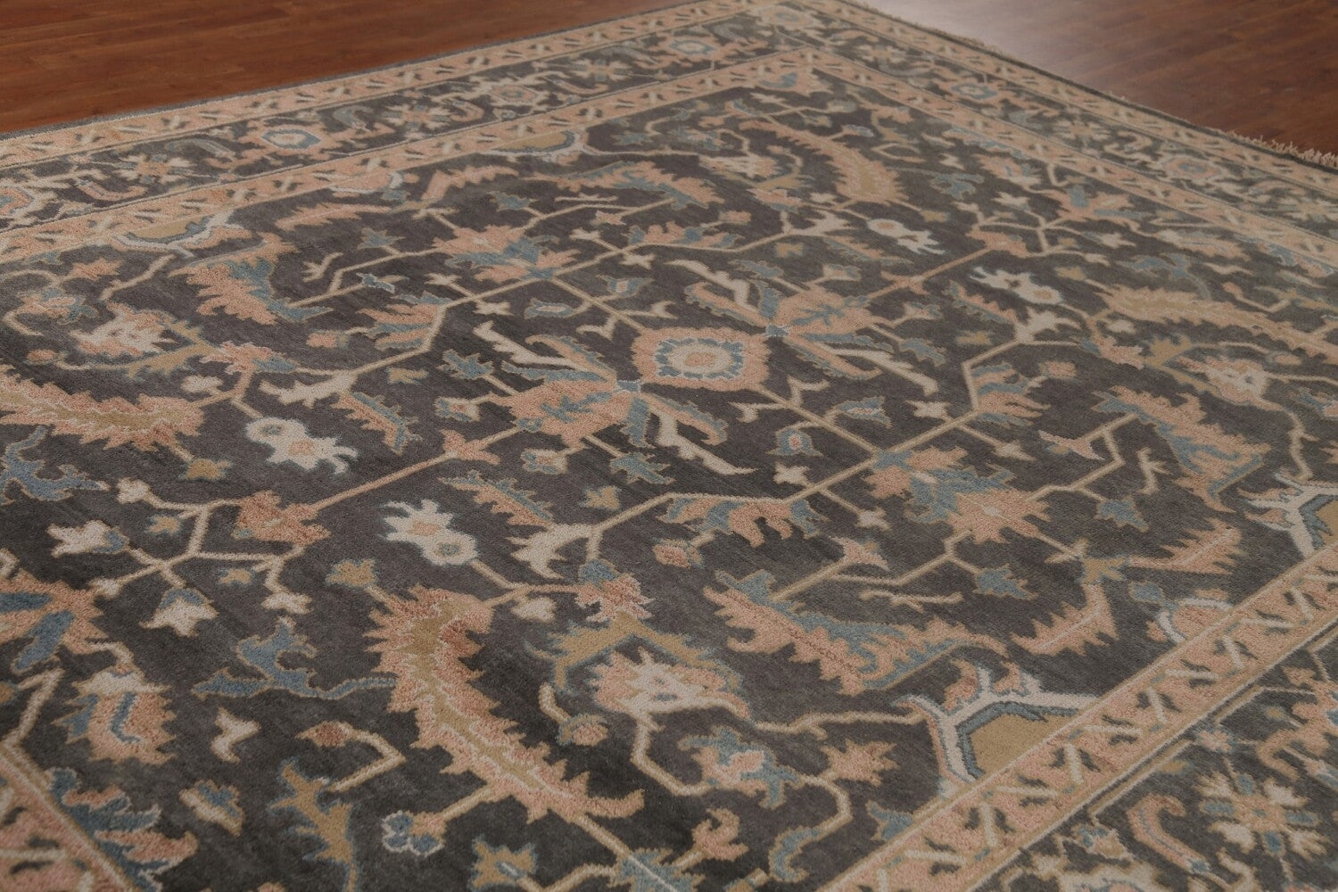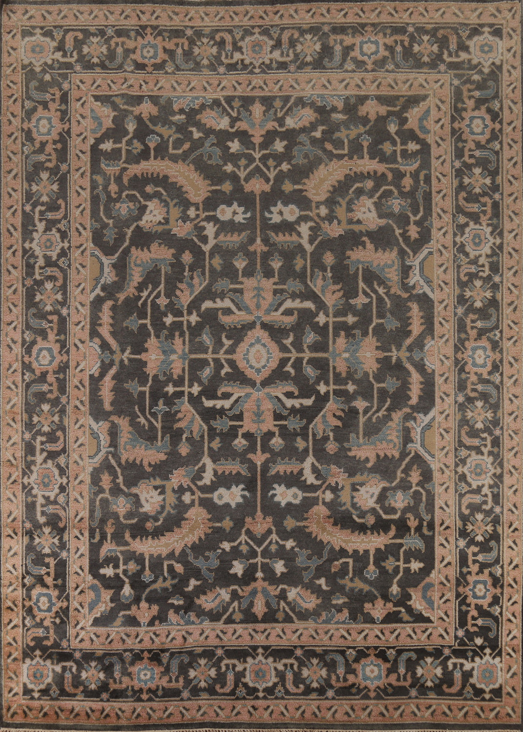 A Beautiful Genuine India Oushak rug is Hand Knotted by skillful weavers in India with 100% Wool Material. This rug is in New, First Quality condition. dimensions are 11' 8'' X 9' 1'' in foot and 356 X 277 in centimeter. the primary color is Greys & Charcoal.