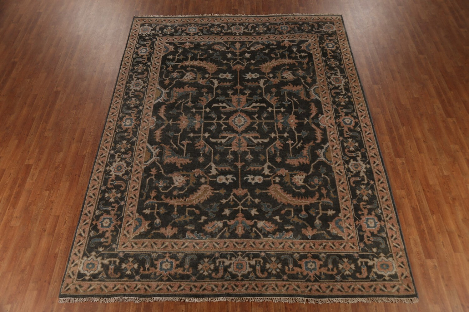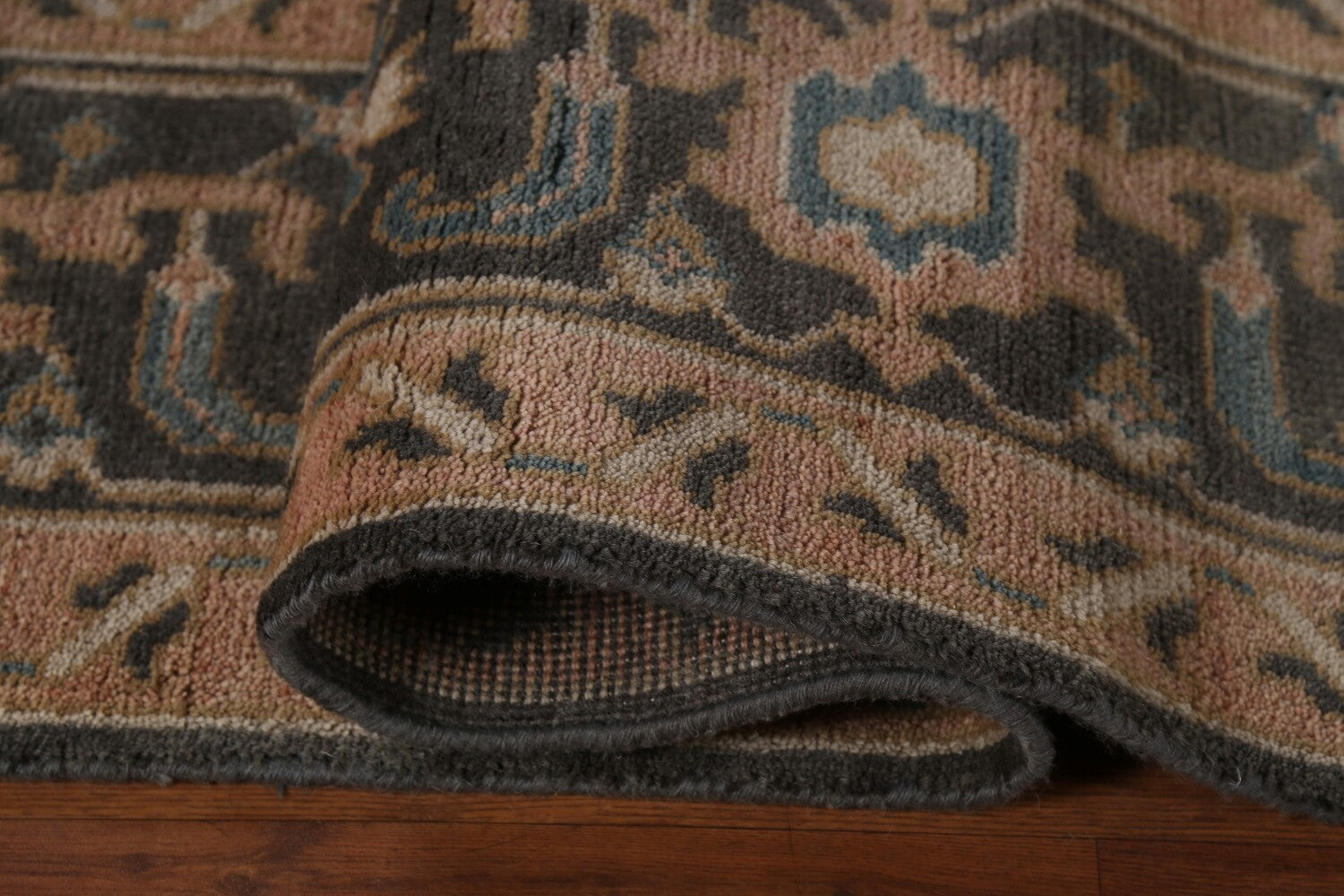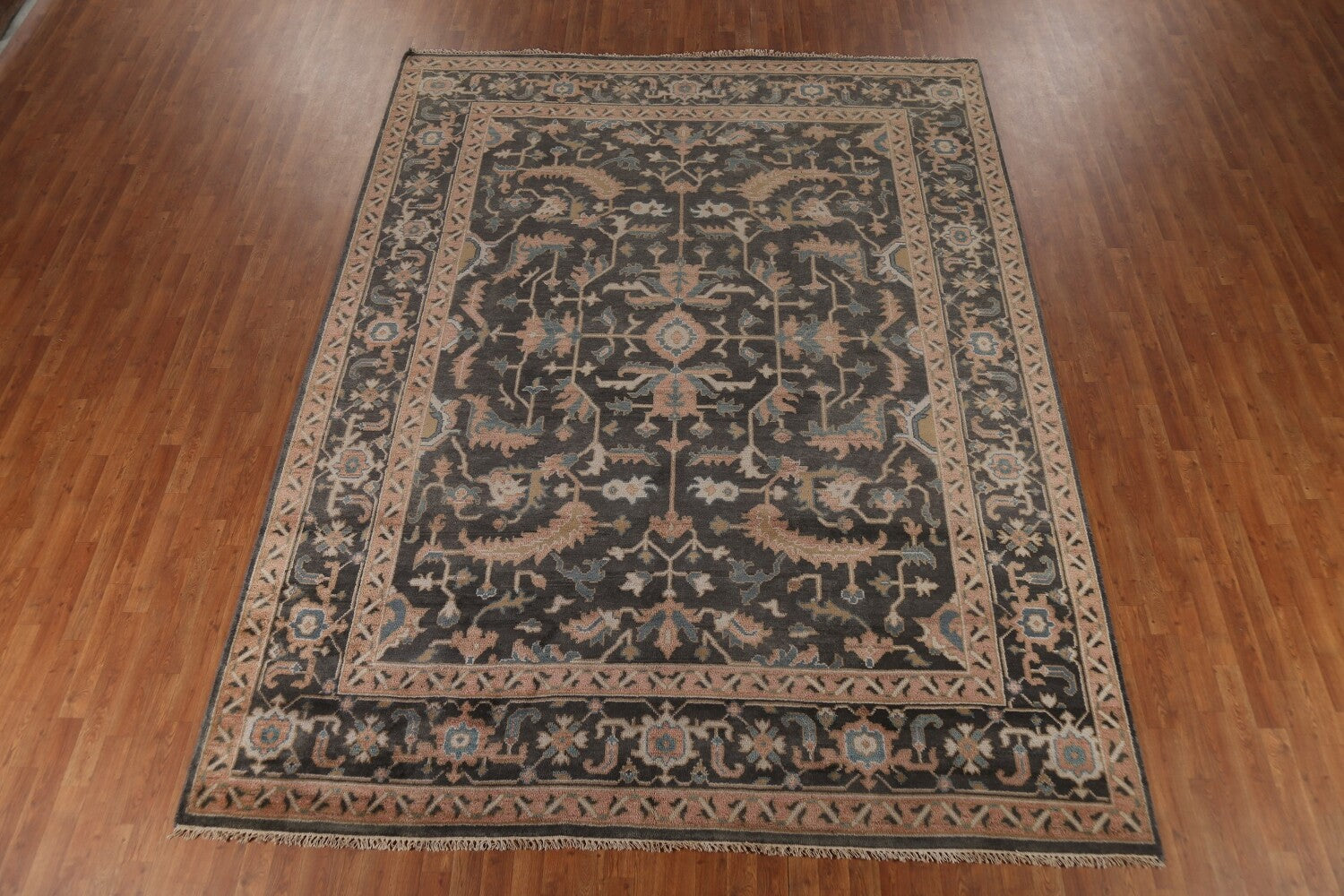 A Beautiful Genuine India Oushak rug is Hand Knotted by skillful weavers in India with 100% Wool Material. This rug is in New, First Quality condition. dimensions are 11' 8'' X 9' 1'' in foot and 356 X 277 in centimeter. the primary color is Greys & Charcoal.