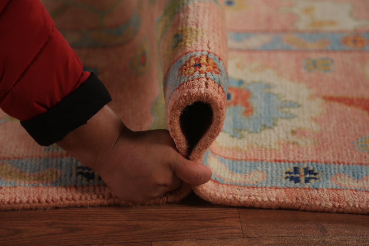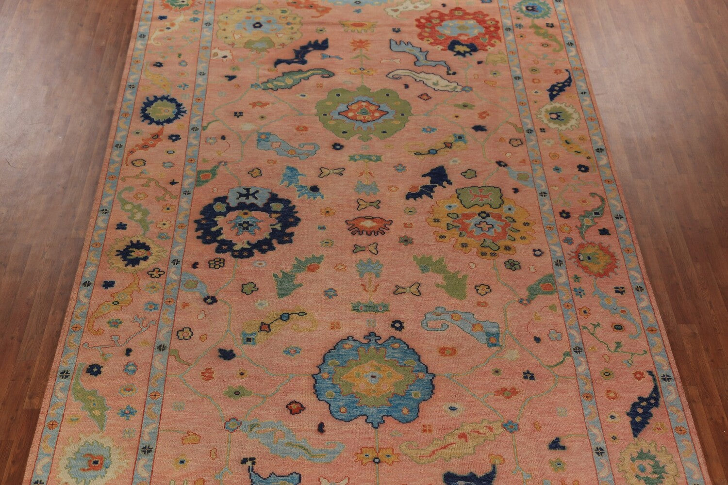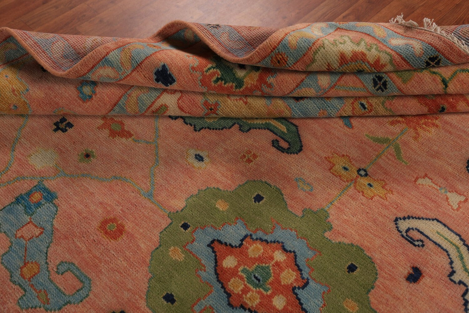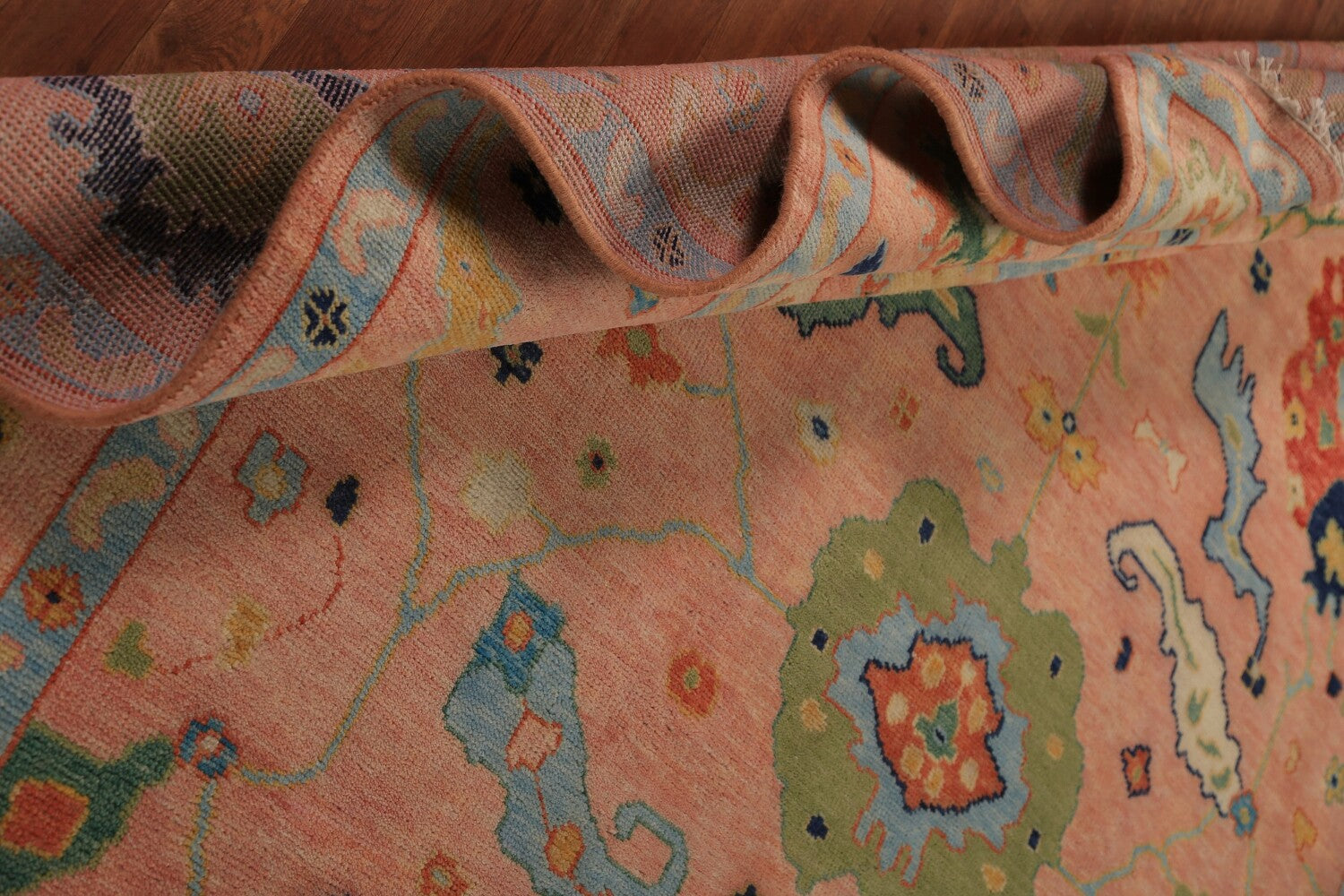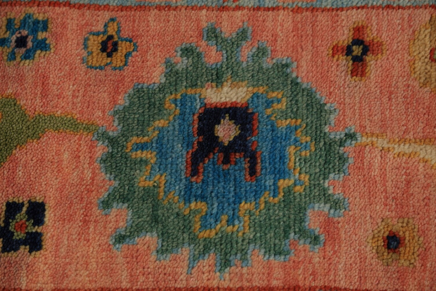 A Beautiful Genuine India Oushak rug is Hand Knotted by skillful weavers in India with 100% Wool Material. This rug is in New, First Quality condition. dimensions are 18' 0'' X 9' 0'' in foot and 549 X 274 in centimeter. the primary color is Coral.