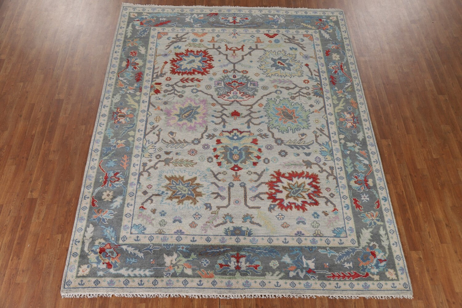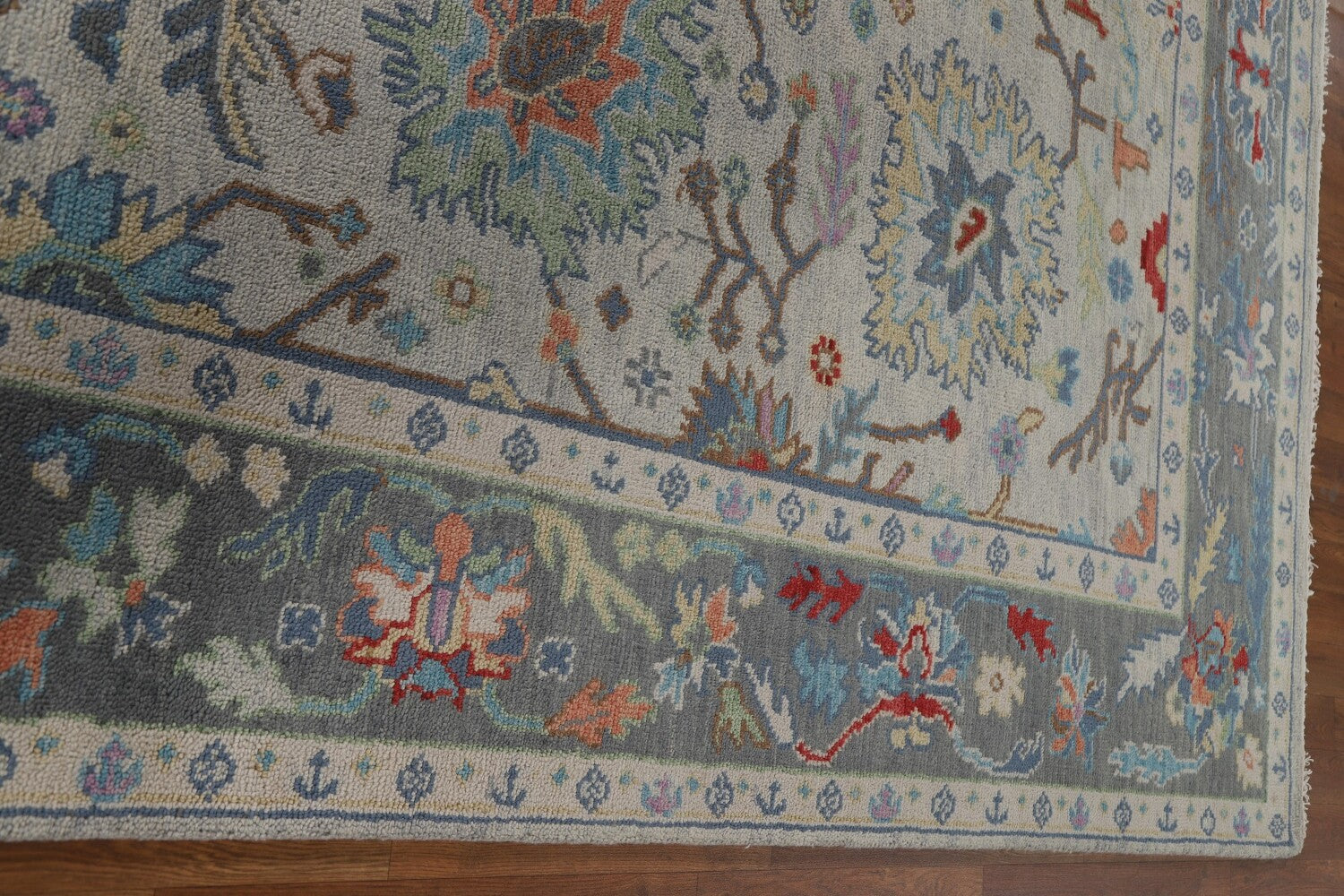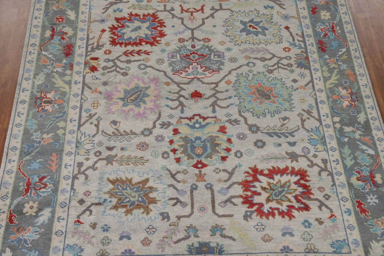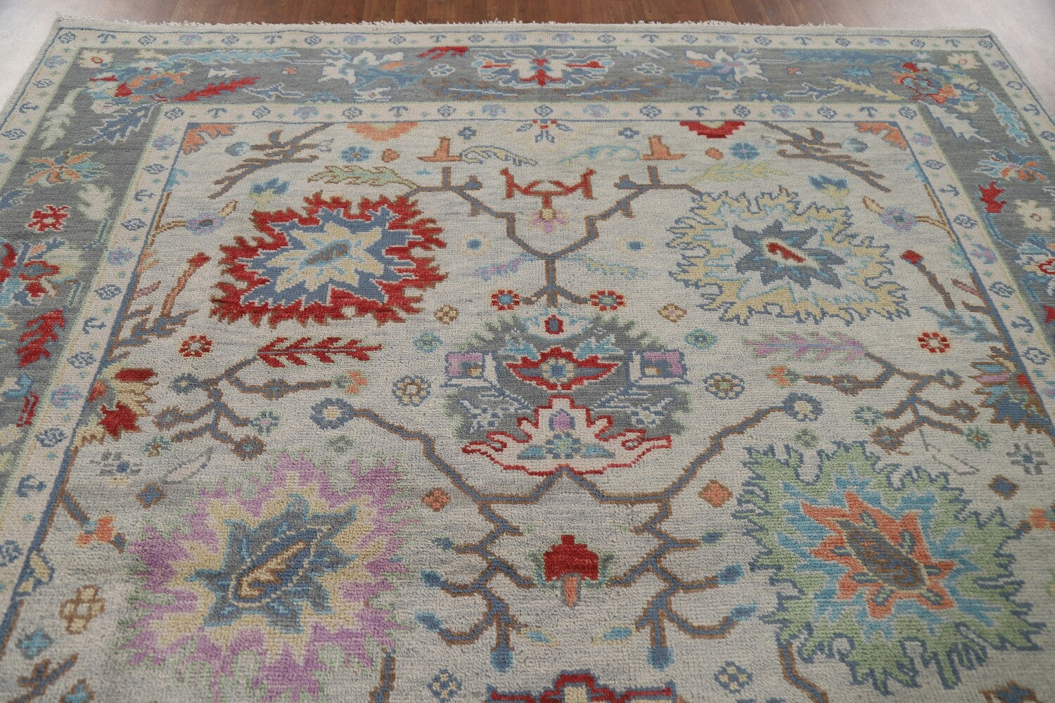 A Beautiful Genuine India Oushak rug is Hand Knotted by skillful weavers in India with 100% Wool Material. This rug is in New, First Quality condition. dimensions are 9' 11'' X 8' 0'' in foot and 302 X 244 in centimeter. the primary color is Greys & Charcoal.