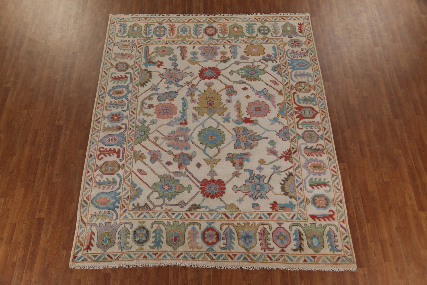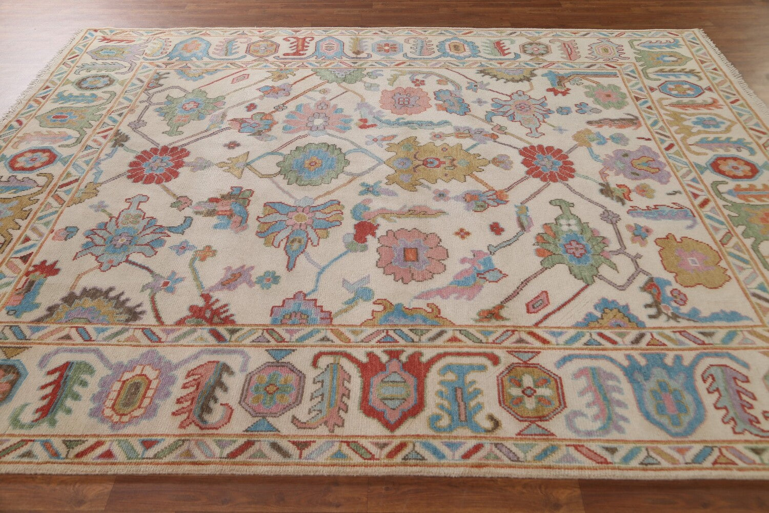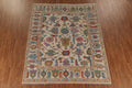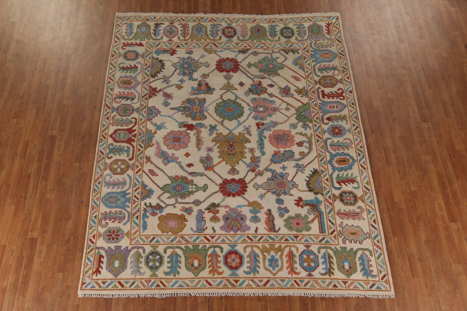 A Beautiful Genuine India Oushak rug is Hand Knotted by skillful weavers in India with 100% Wool Material. This rug is in New, First Quality condition. dimensions are 9' 10'' X 8' 2'' in foot and 300 X 249 in centimeter. the primary color is Beige & Ivories.