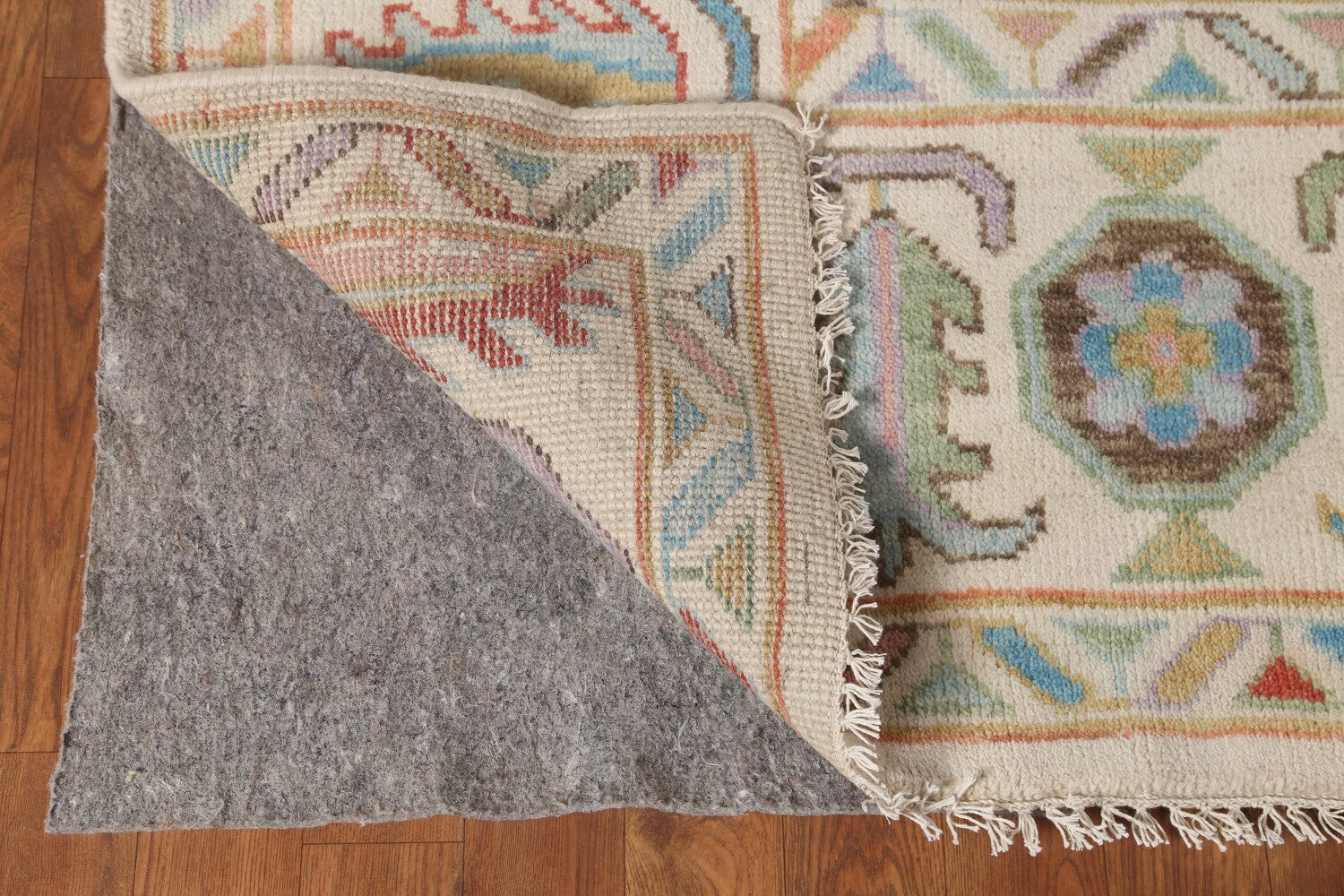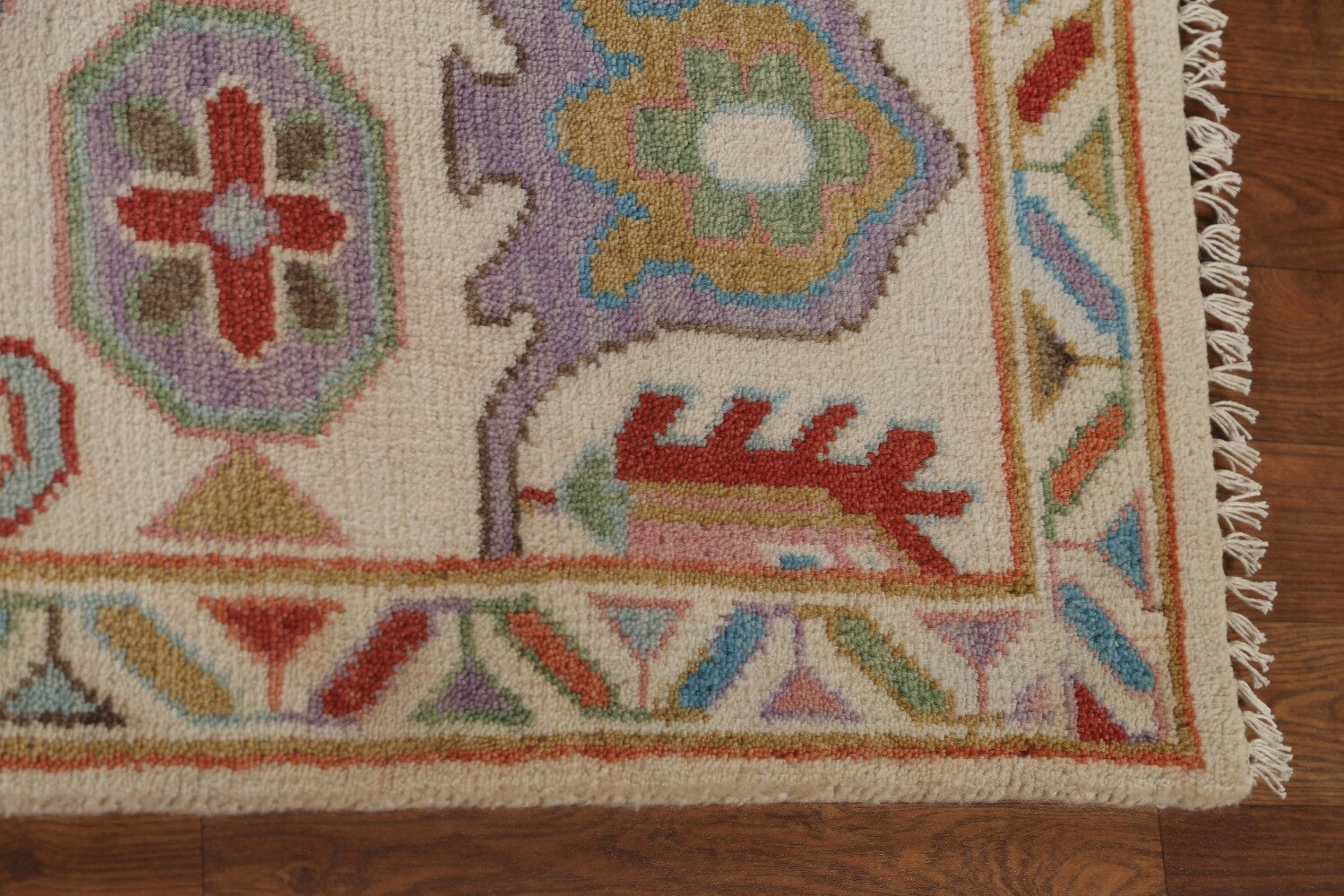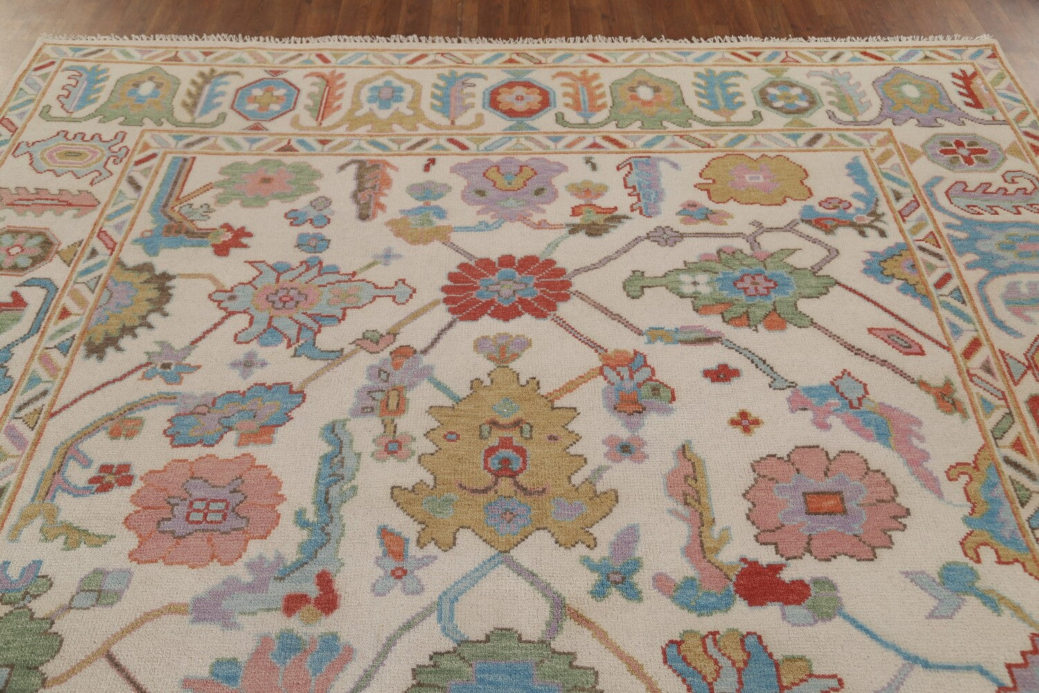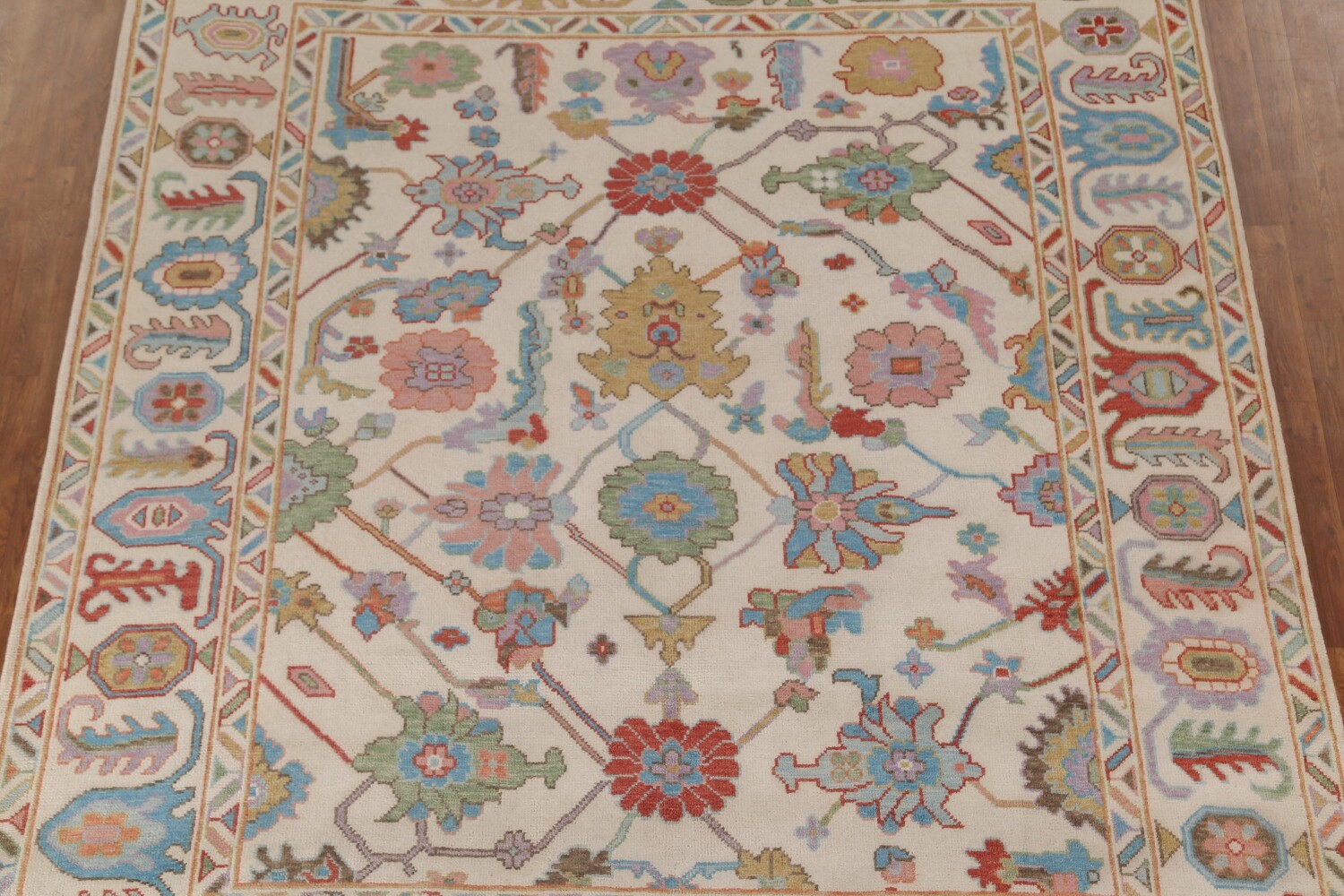 A Beautiful Genuine India Oushak rug is Hand Knotted by skillful weavers in India with 100% Wool Material. This rug is in New, First Quality condition. dimensions are 9' 10'' X 8' 2'' in foot and 300 X 249 in centimeter. the primary color is Beige & Ivories.