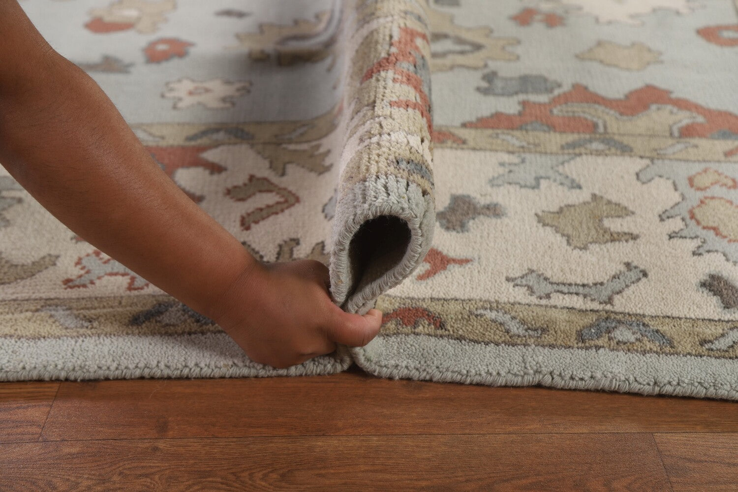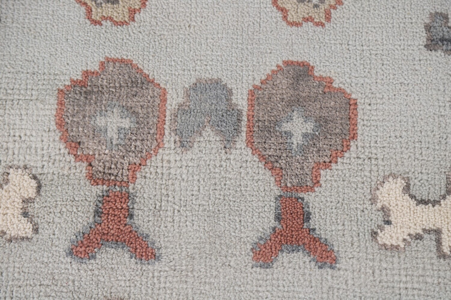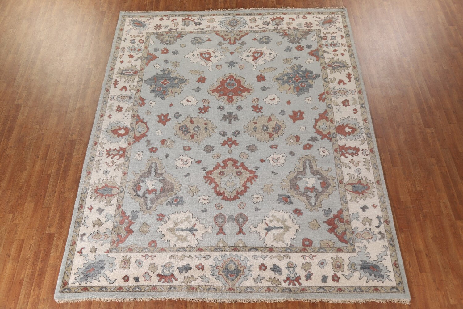 A Beautiful Genuine India Oushak rug is Hand Knotted by skillful weavers in India with 100% Wool Material. This rug is in New, First Quality condition. dimensions are 11' 7'' X 9' 3'' in foot and 353 X 282 in centimeter. the primary color is Greys & Charcoal.