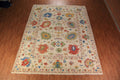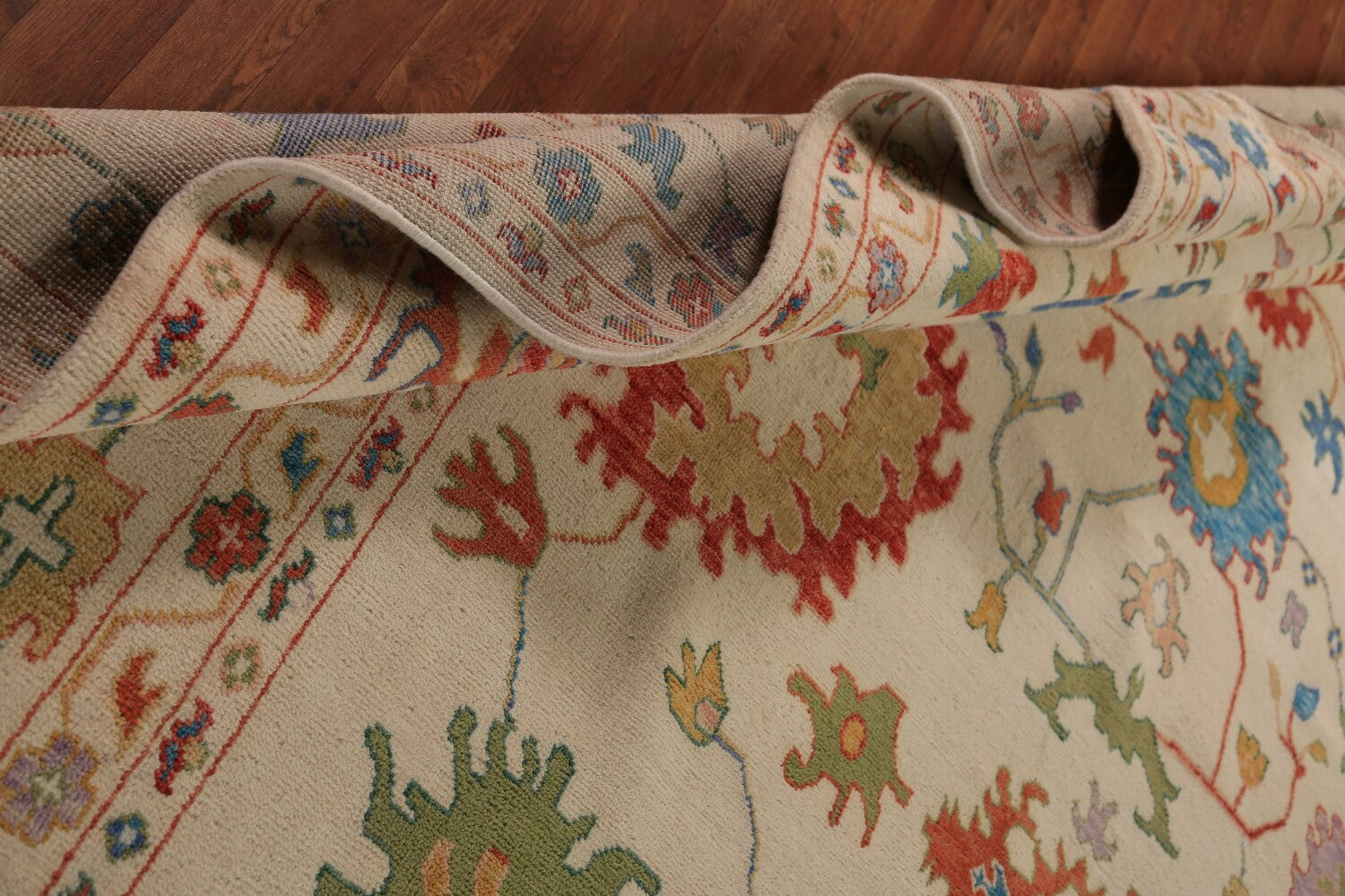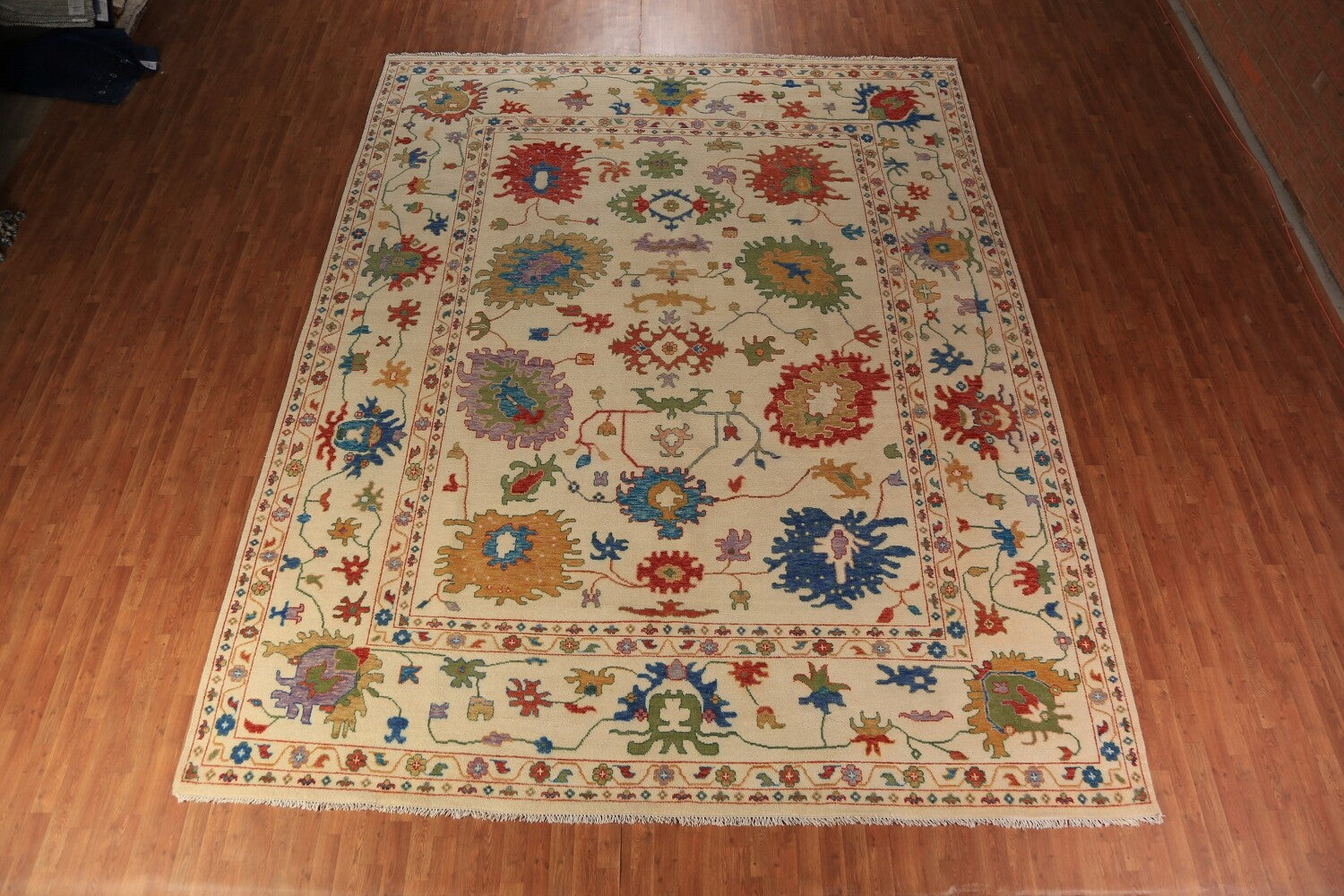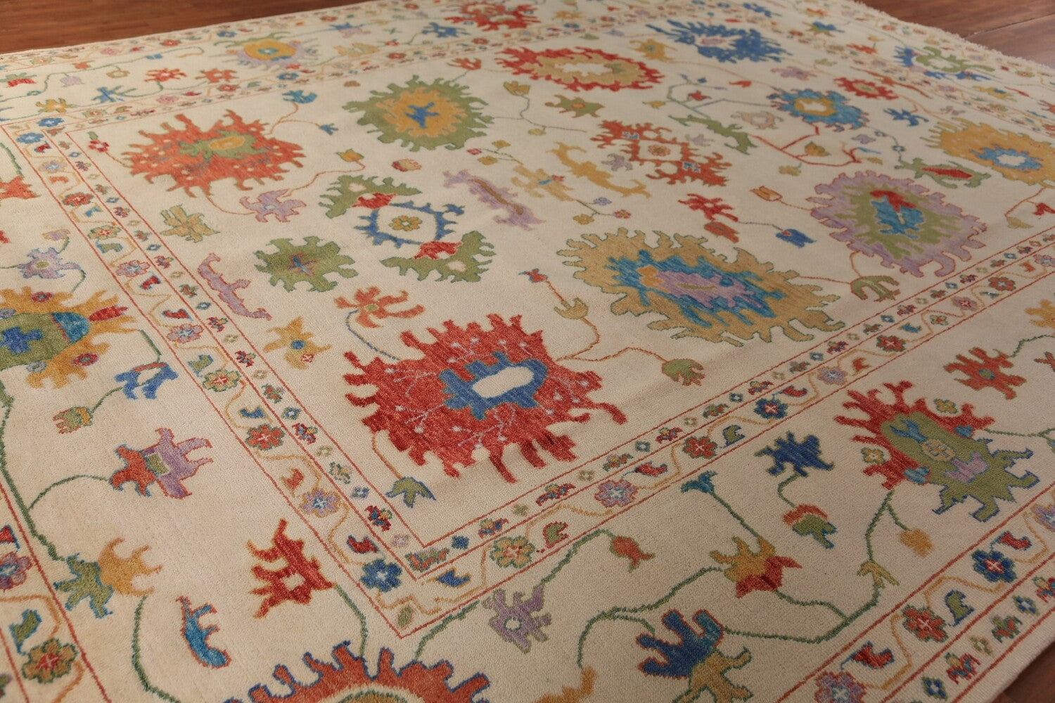 A Beautiful Genuine India Oushak rug is Hand Knotted by skillful weavers in India with 100% Wool Material. This rug is in New, First Quality condition. dimensions are 14' 9'' X 11' 10'' in foot and 450 X 361 in centimeter. the primary color is Beige & Ivories.