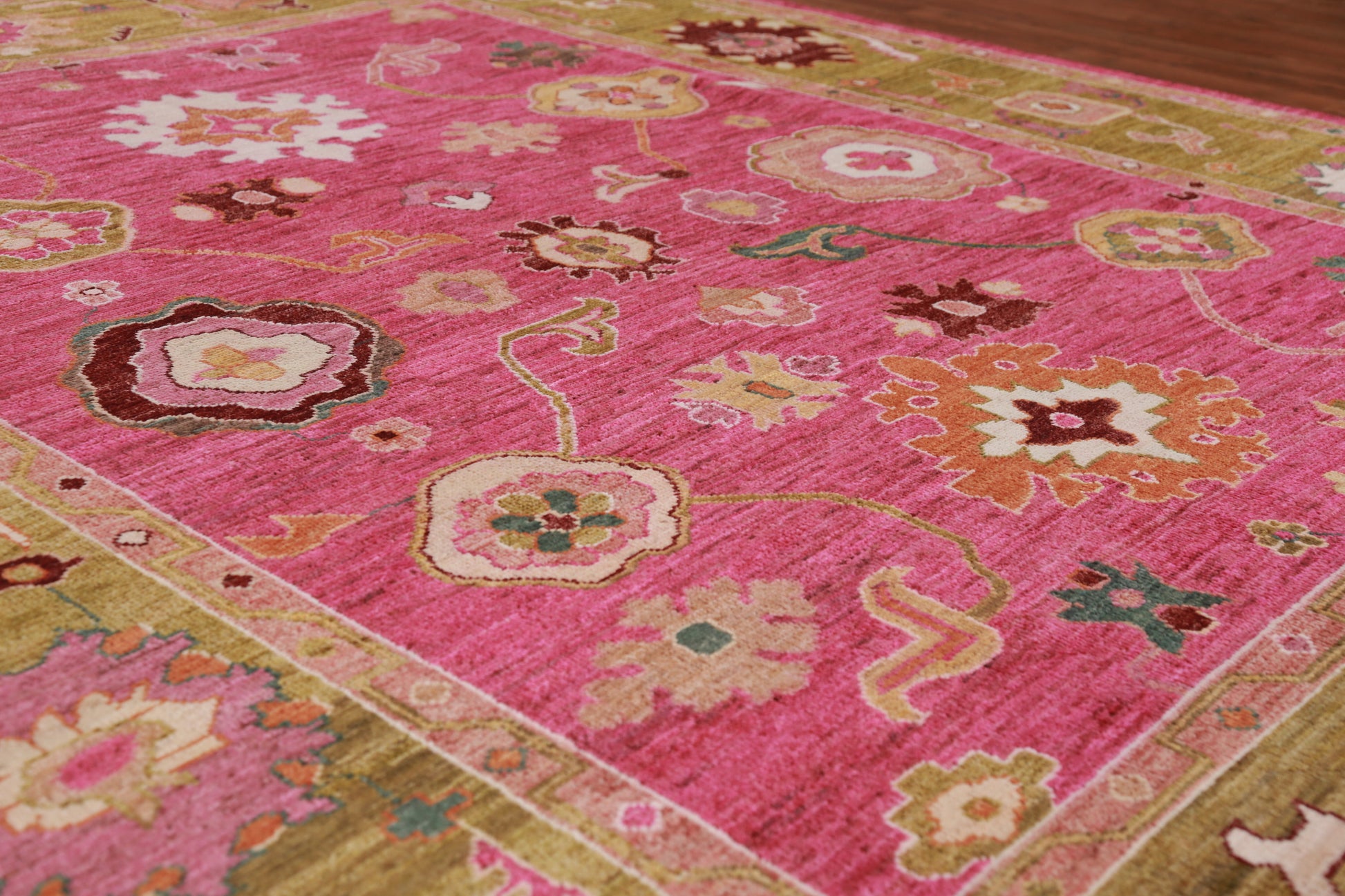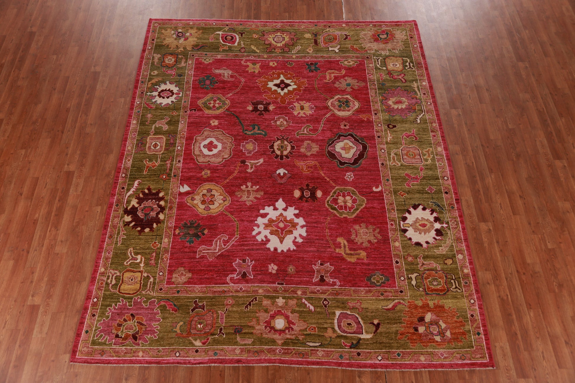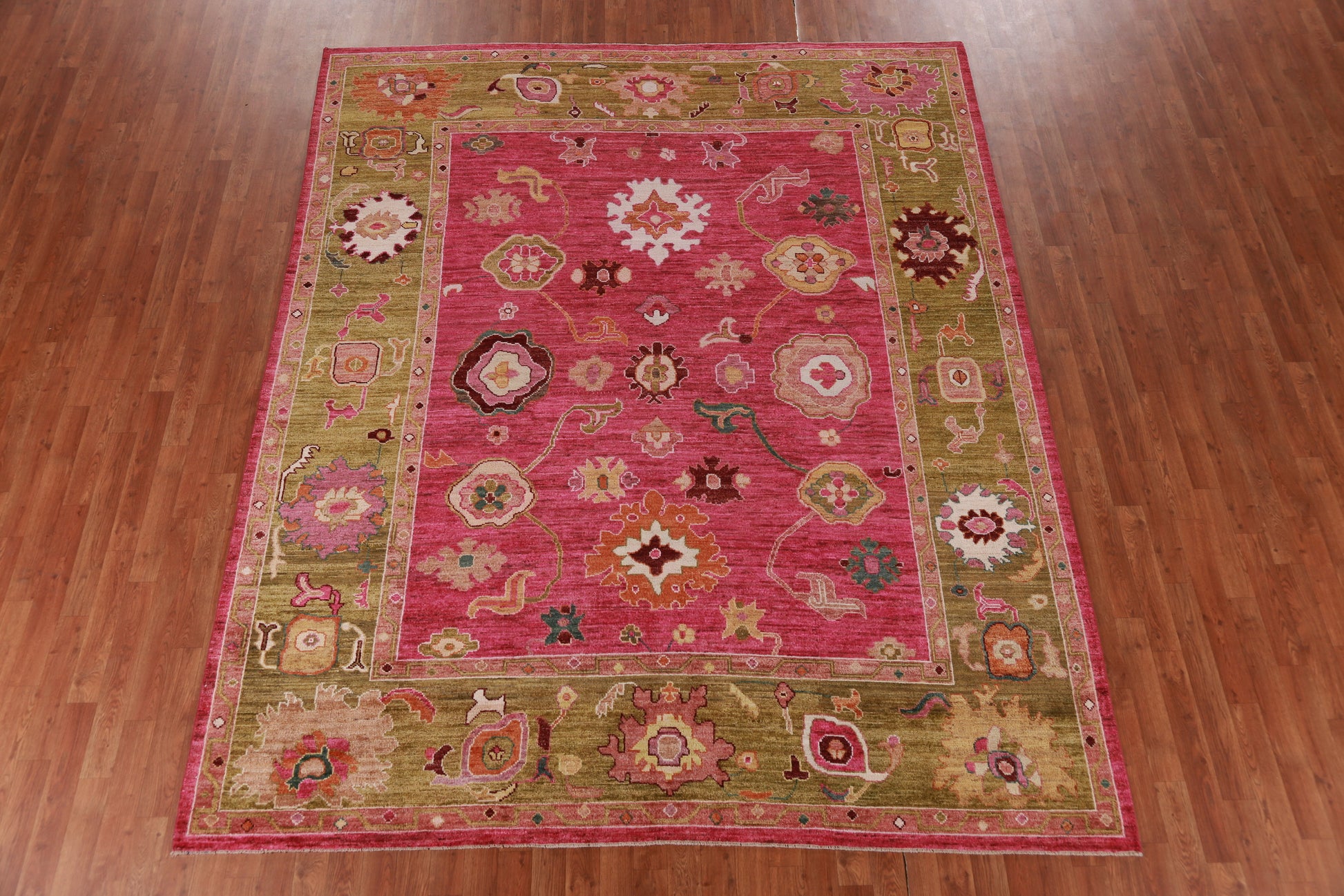 A Beautiful Genuine Turkey Oushak rug is Hand Knotted by skillful weavers in Turkey with 100% Wool Material. This rug is in New, First Quality condition. dimensions are 9' 8'' X 8' 0'' in foot and 295 X 244 in centimeter. the primary color is Pink.