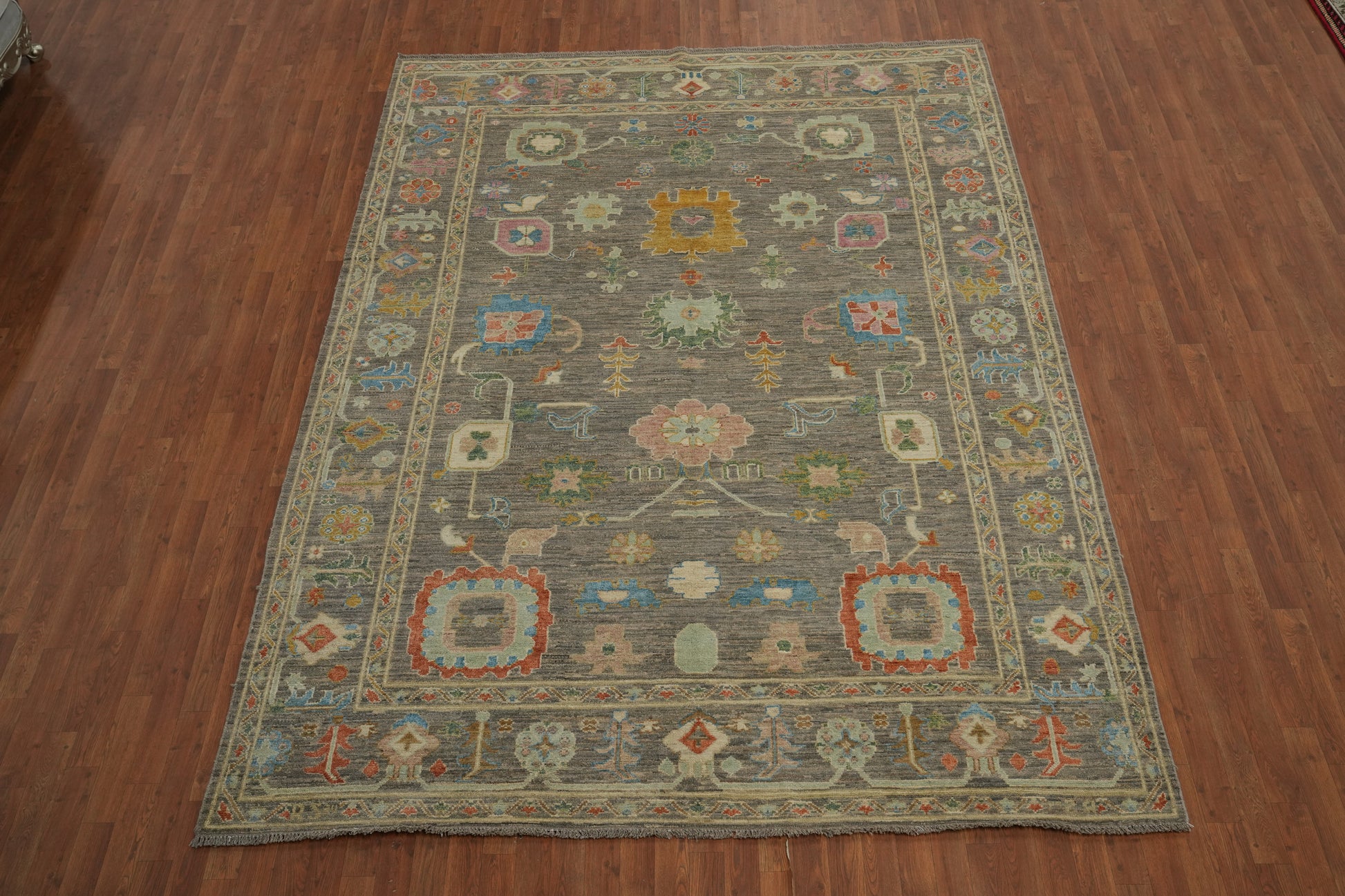 A Beautiful Genuine Turkey Oushak rug is Hand Knotted by skillful weavers in Turkey with 100% Wool Material. This rug is in New, First Quality condition. dimensions are 10' 11'' X 8' 0'' in foot and 333 X 244 in centimeter. the primary color is Greys & Charcoal.