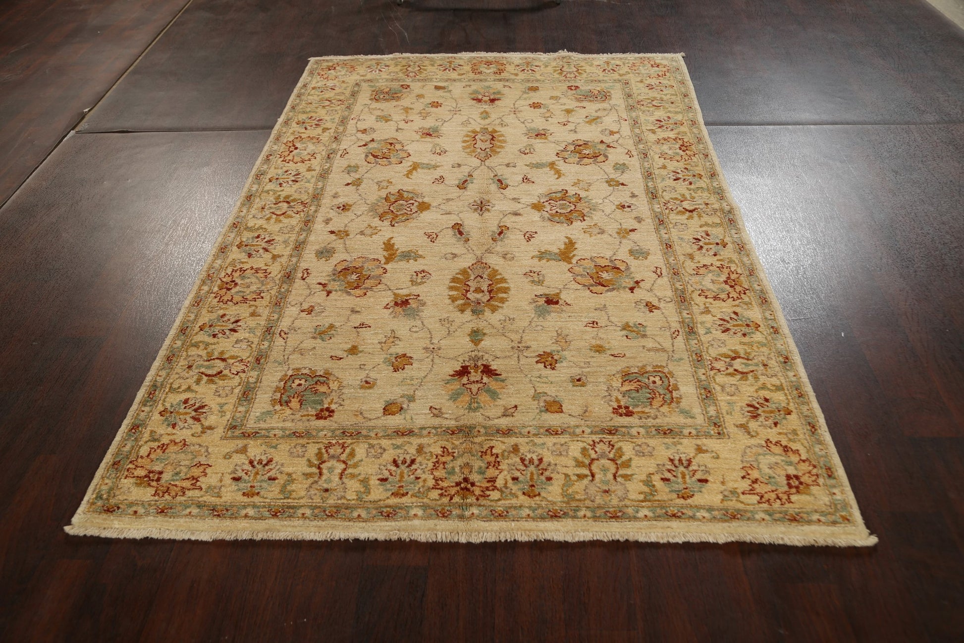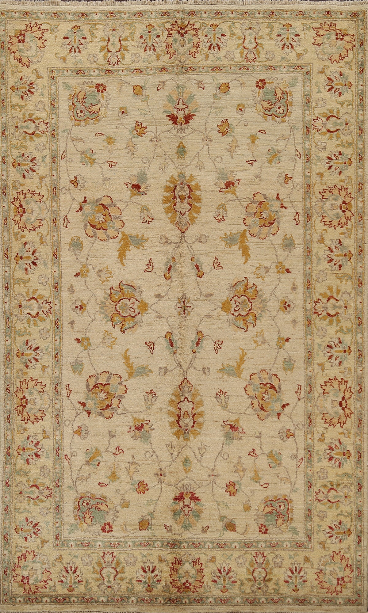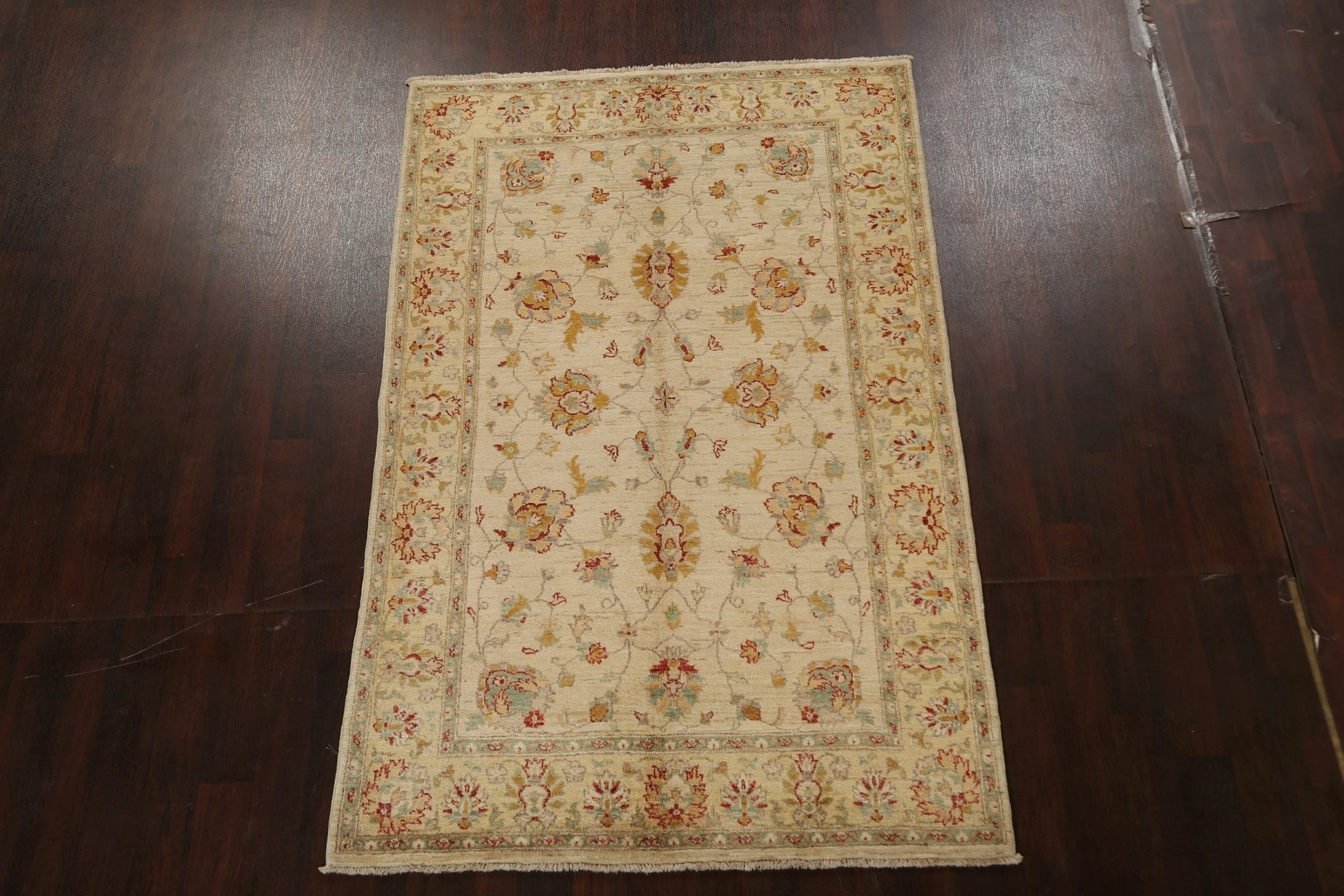 A Beautiful Genuine Pakistan Peshawar-Chobi rug is Hand Knotted by skillful weavers in Pakistan with 100% Wool Material. This rug is in New, First Quality condition. dimensions are 7' 10'' X 5' 0'' in foot and 239 X 152 in centimeter. the primary color is Beige & Ivories.