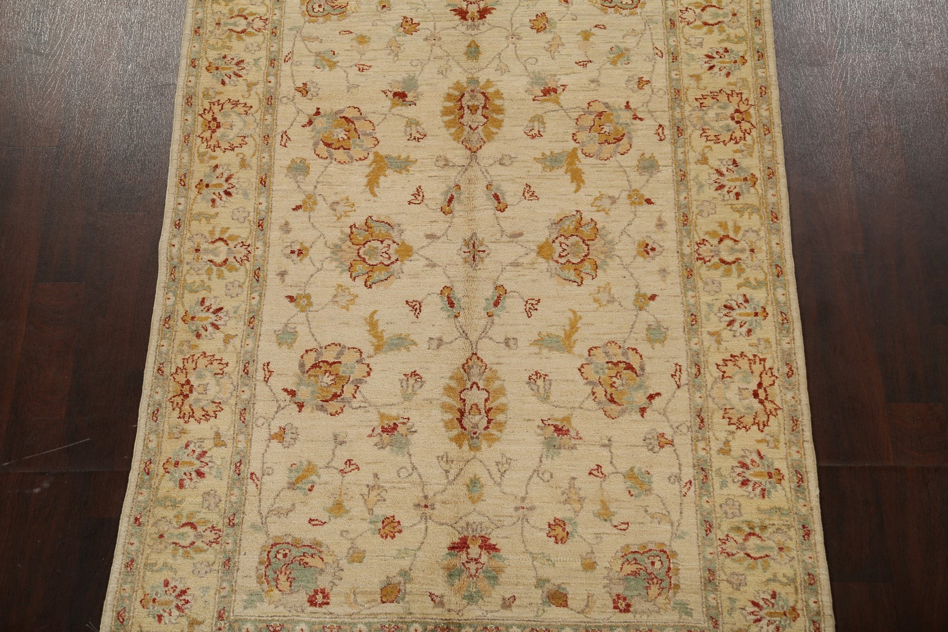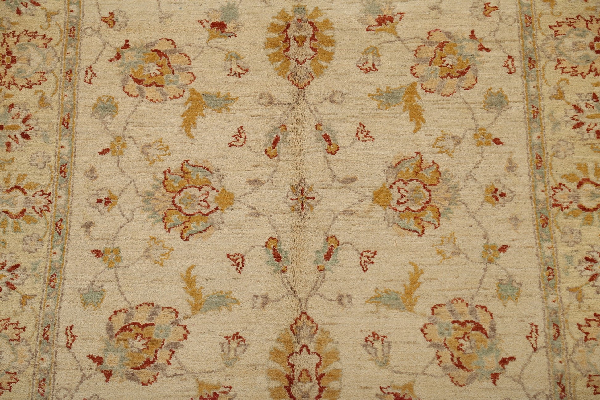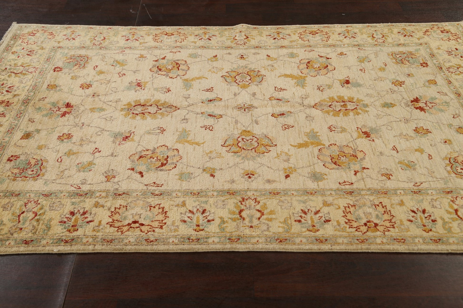 A Beautiful Genuine Pakistan Peshawar-Chobi rug is Hand Knotted by skillful weavers in Pakistan with 100% Wool Material. This rug is in New, First Quality condition. dimensions are 7' 10'' X 5' 0'' in foot and 239 X 152 in centimeter. the primary color is Beige & Ivories.