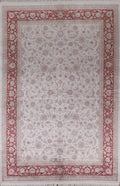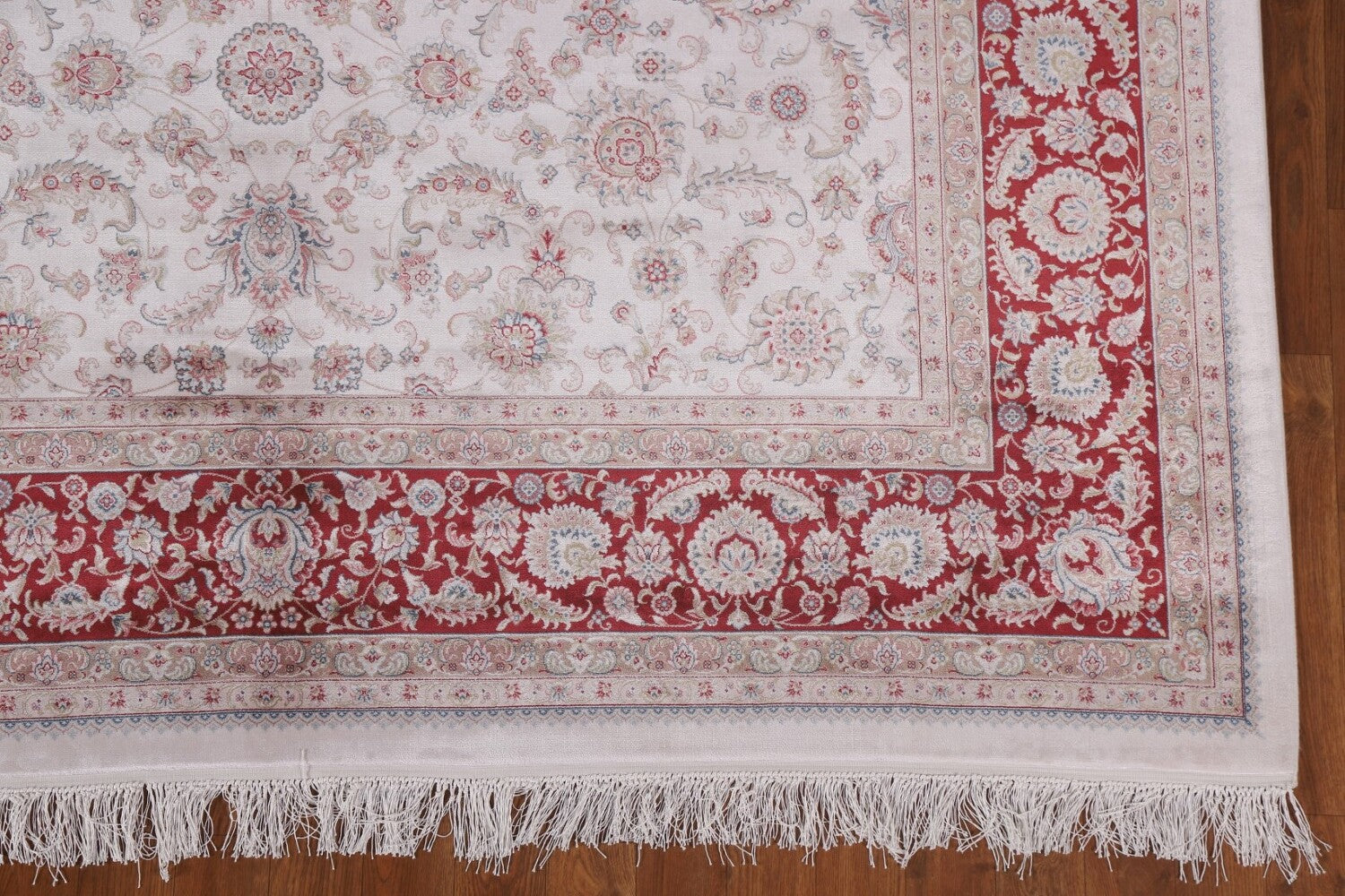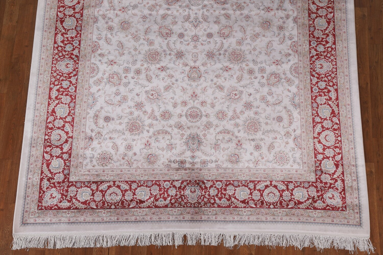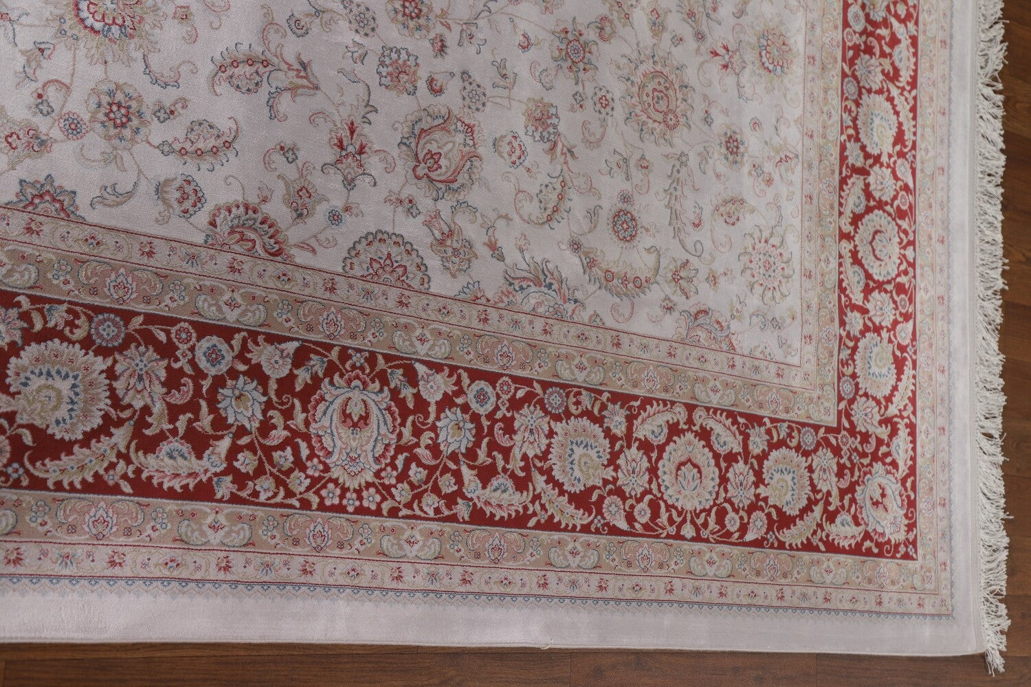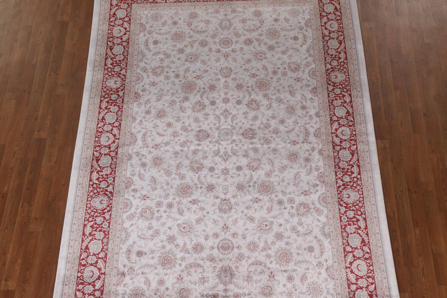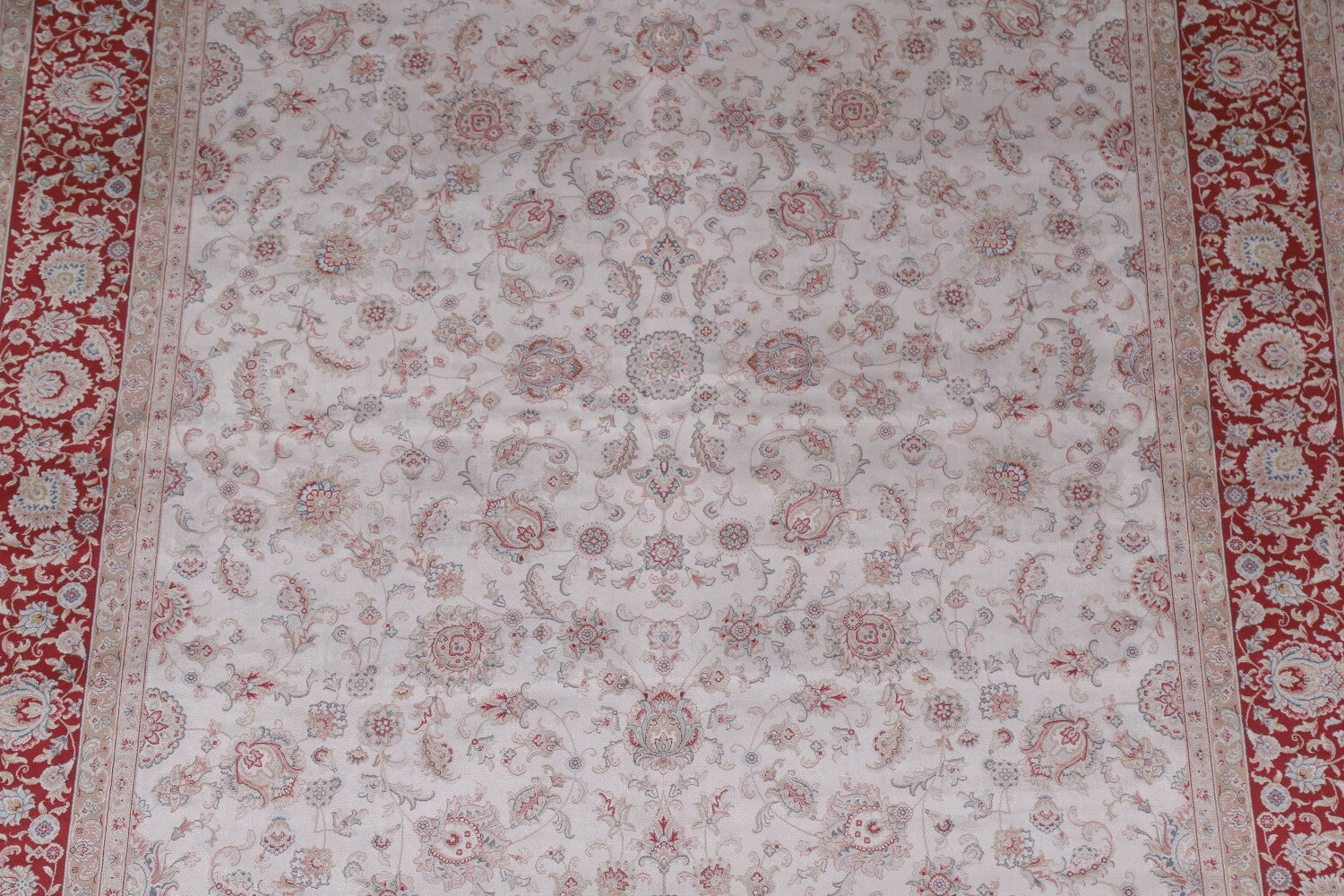 A Beautiful Genuine Turkey Tabriz rug is Machine Made by skillful weavers in Turkey with 90% Silk - 10% Polyester Material. This rug is in condition. dimensions are 9' 8'' X 6' 5'' in foot and 295 X 196 in centimeter. the primary color is Beige & Ivories.