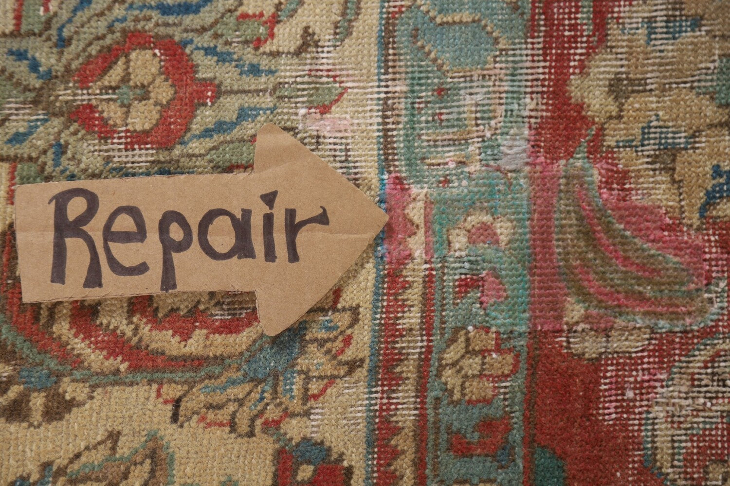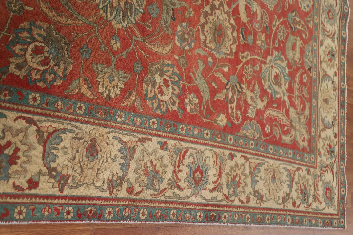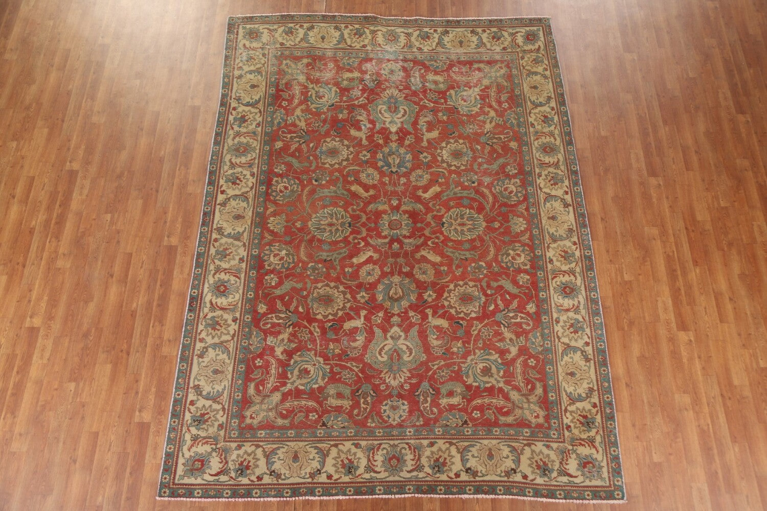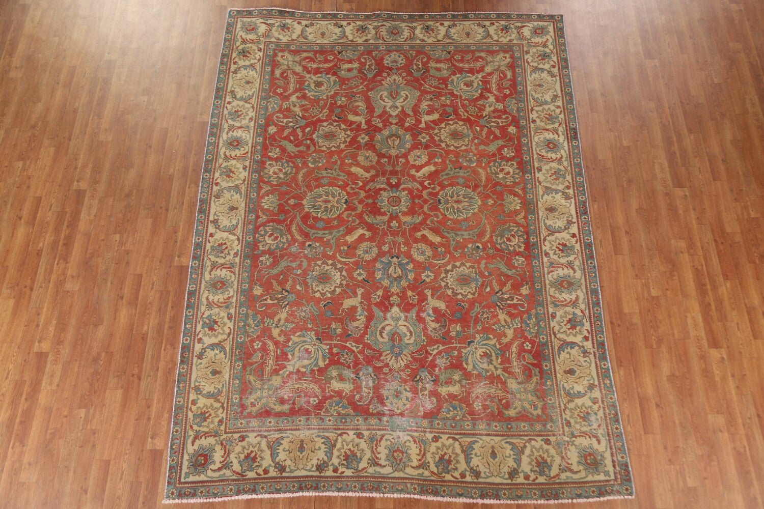 A Beautiful Genuine Persia ( Persia ) Tabriz rug is Hand Knotted by skillful weavers in Persia ( Persia ) with 100% Wool Material. This rug is in Very Good ( Evenly Low Pile-Repair) condition. dimensions are 10' 5'' X 7' 4'' in foot and 318 X 224 in centimeter. the primary color is Red.