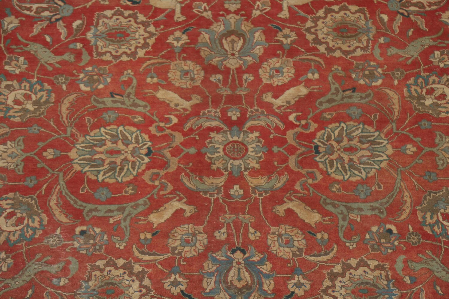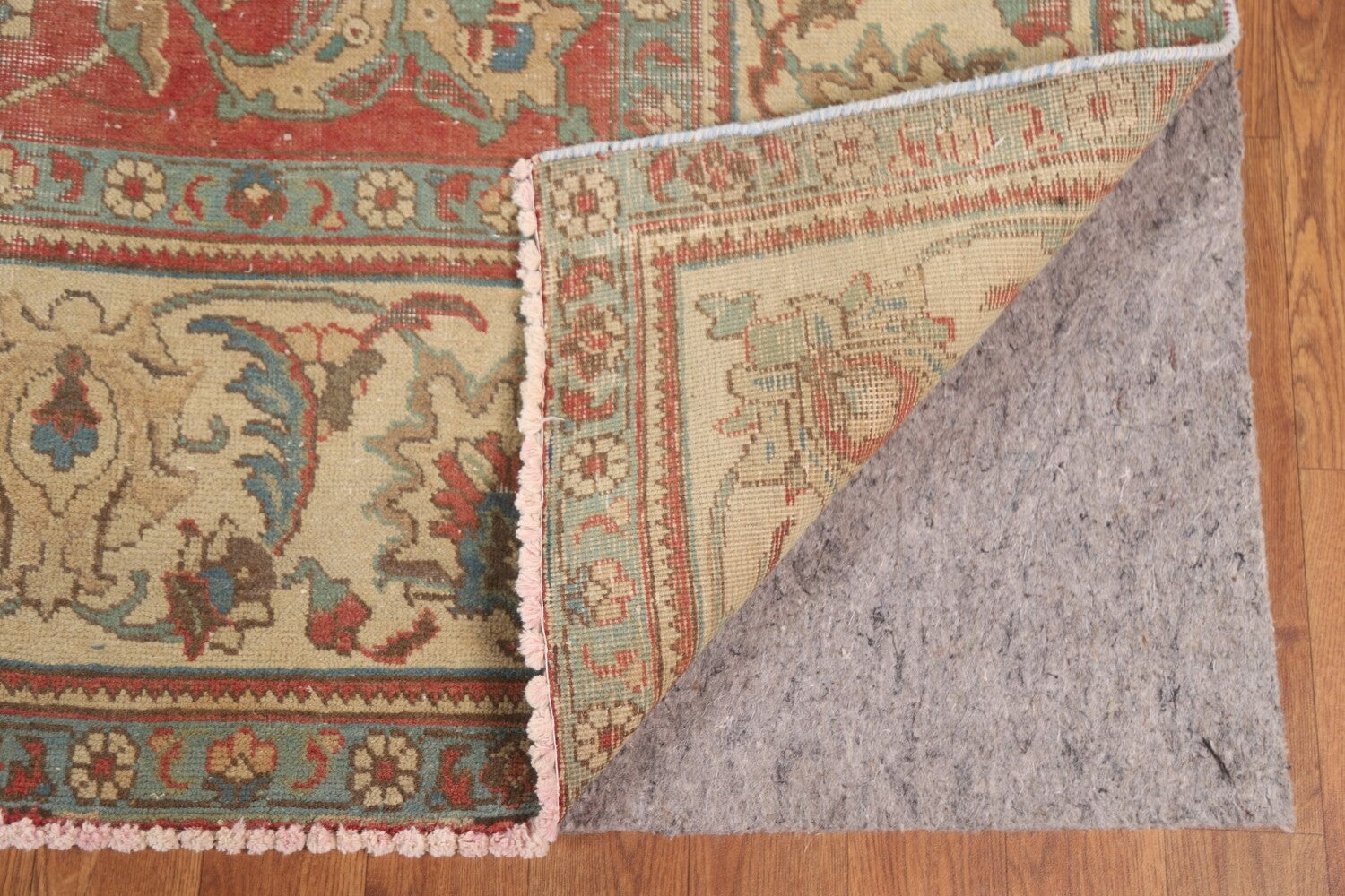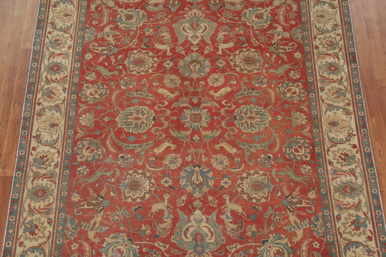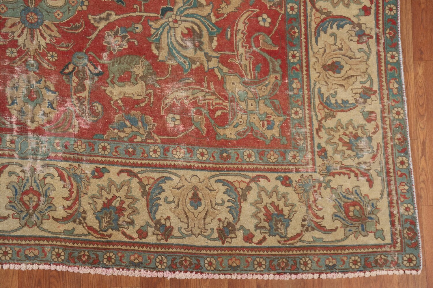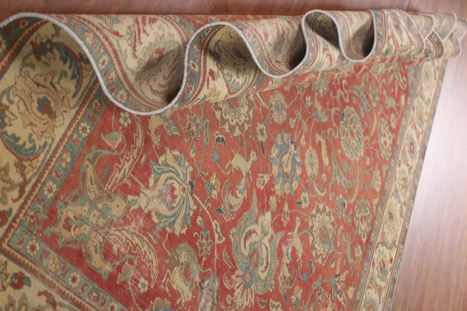 A Beautiful Genuine Persia ( Persia ) Tabriz rug is Hand Knotted by skillful weavers in Persia ( Persia ) with 100% Wool Material. This rug is in Very Good ( Evenly Low Pile-Repair) condition. dimensions are 10' 5'' X 7' 4'' in foot and 318 X 224 in centimeter. the primary color is Red.