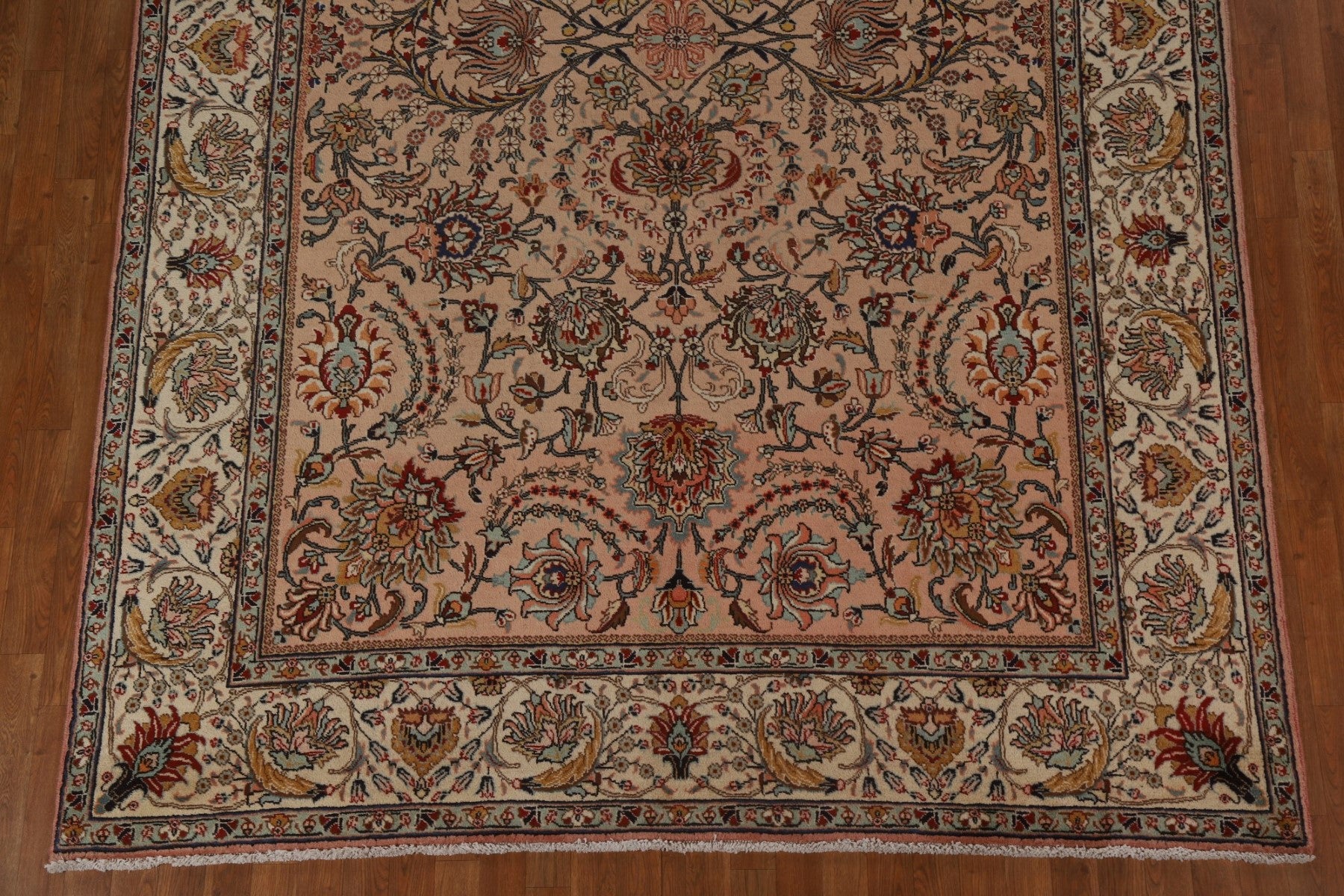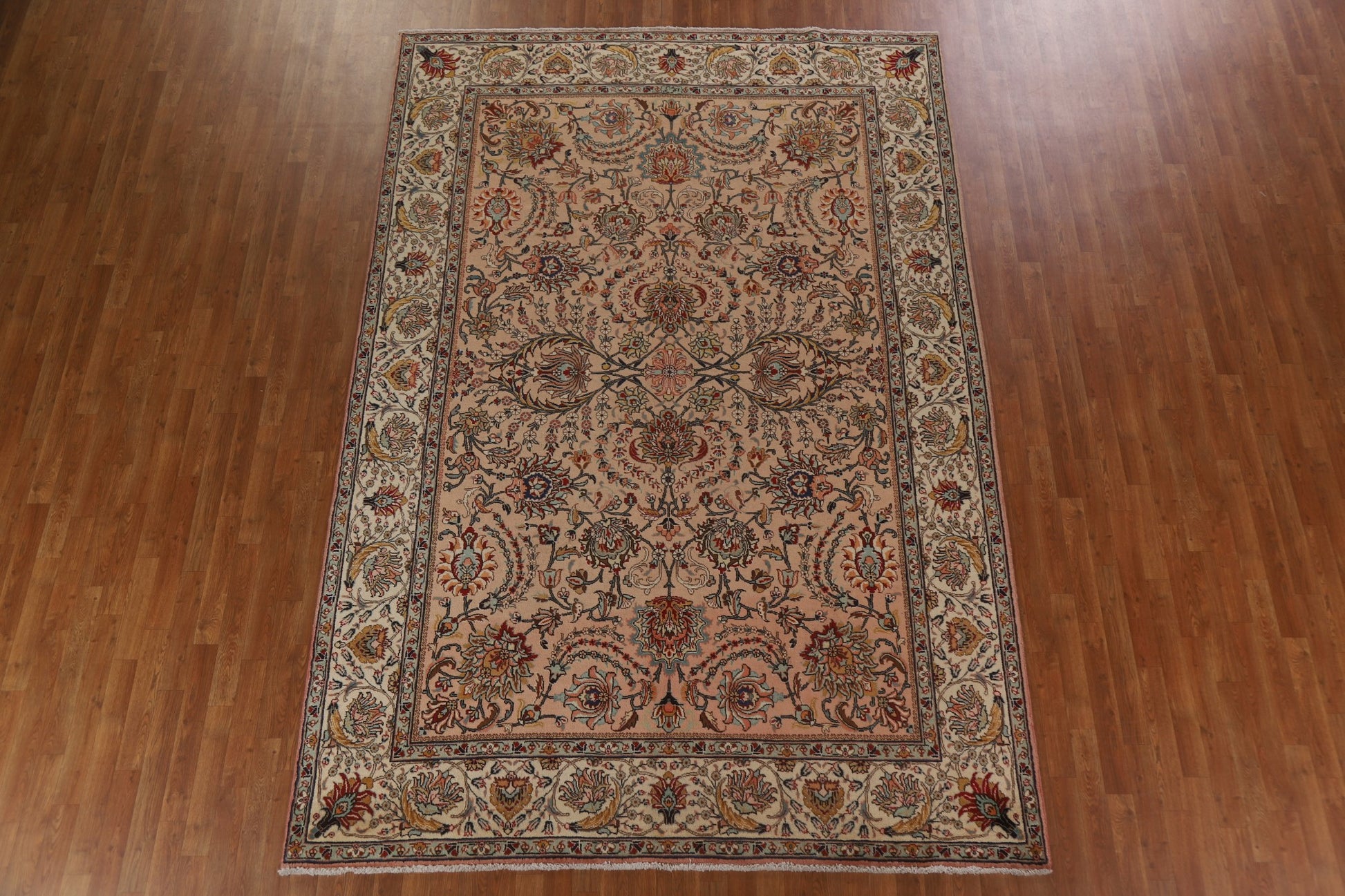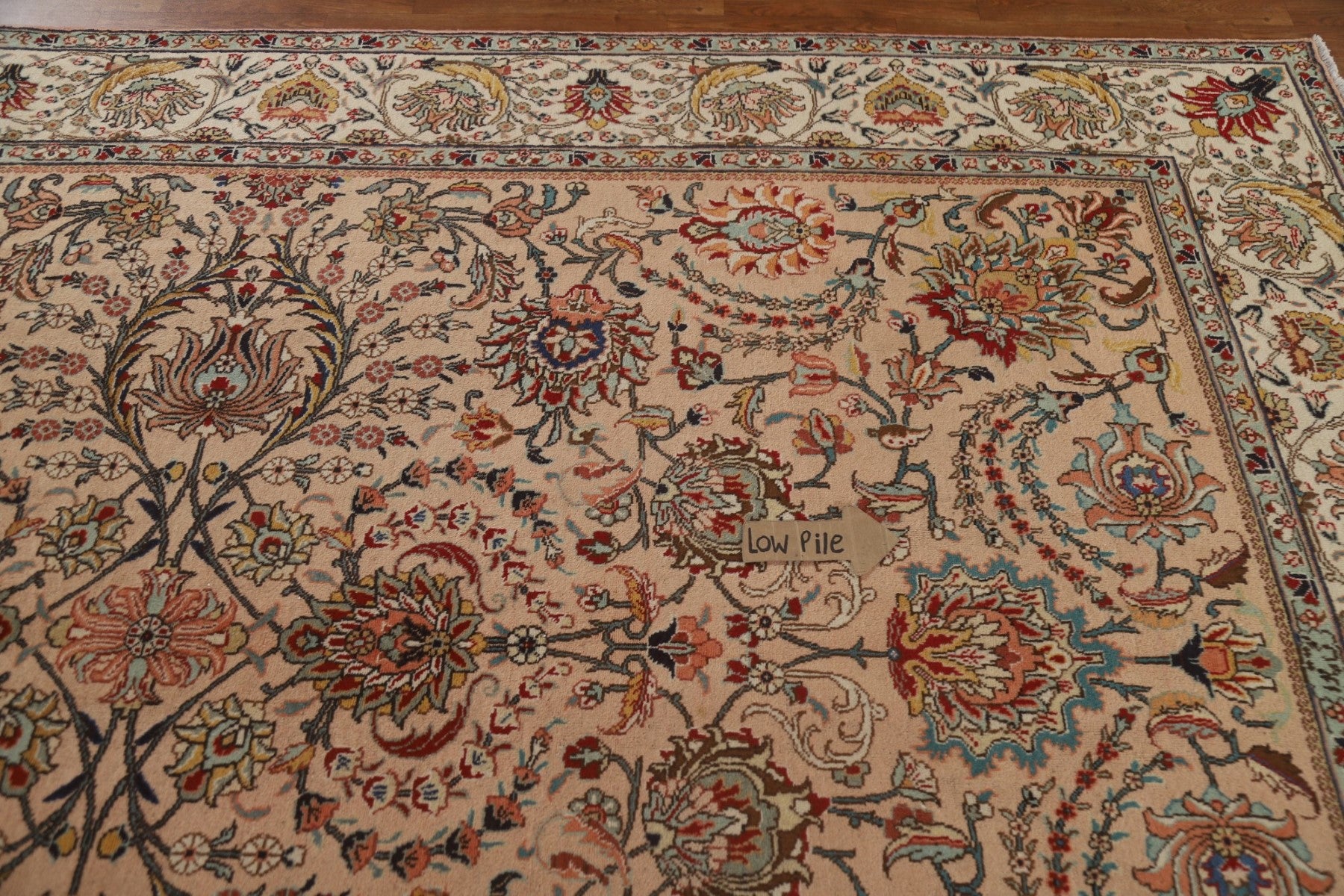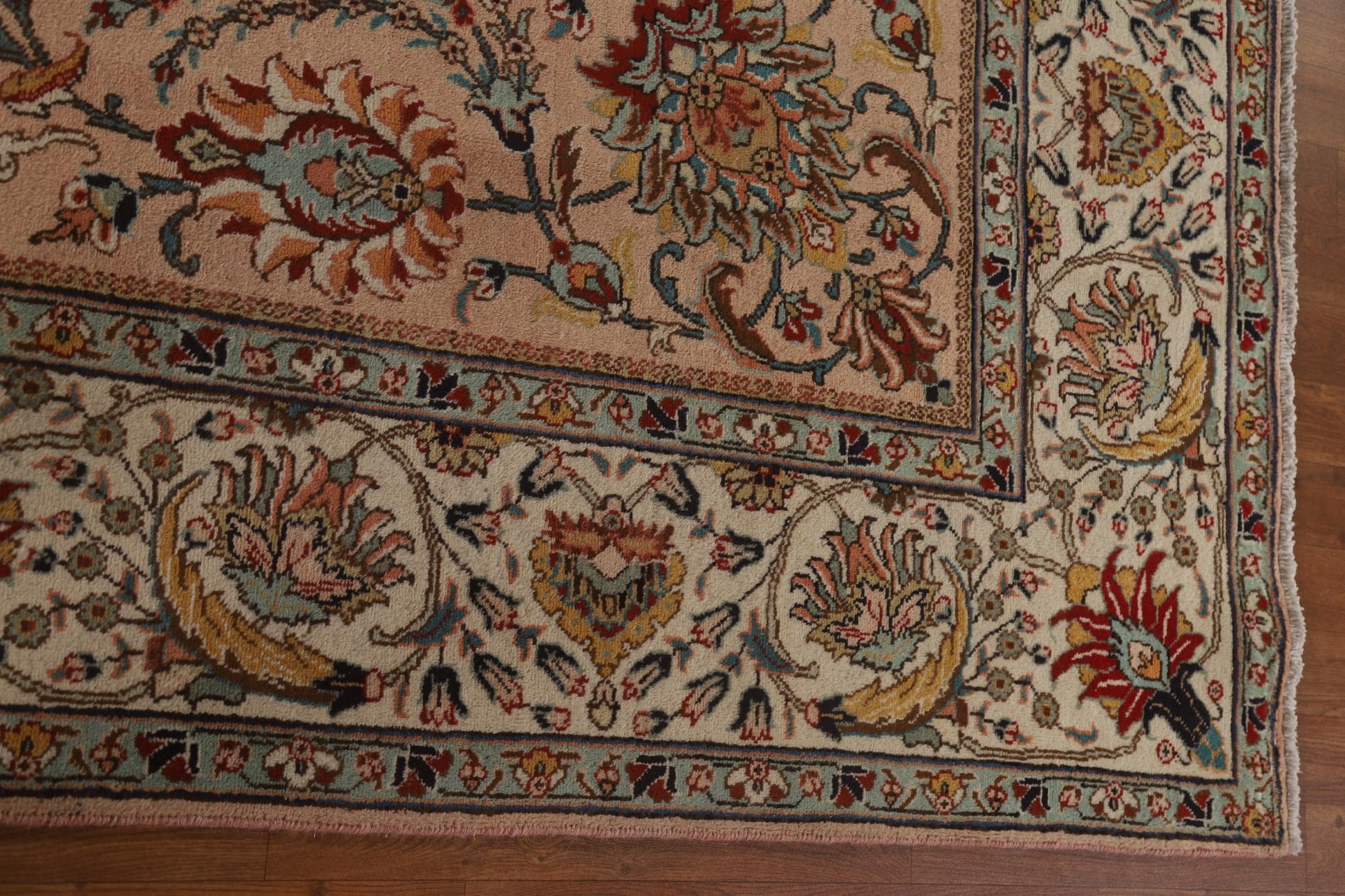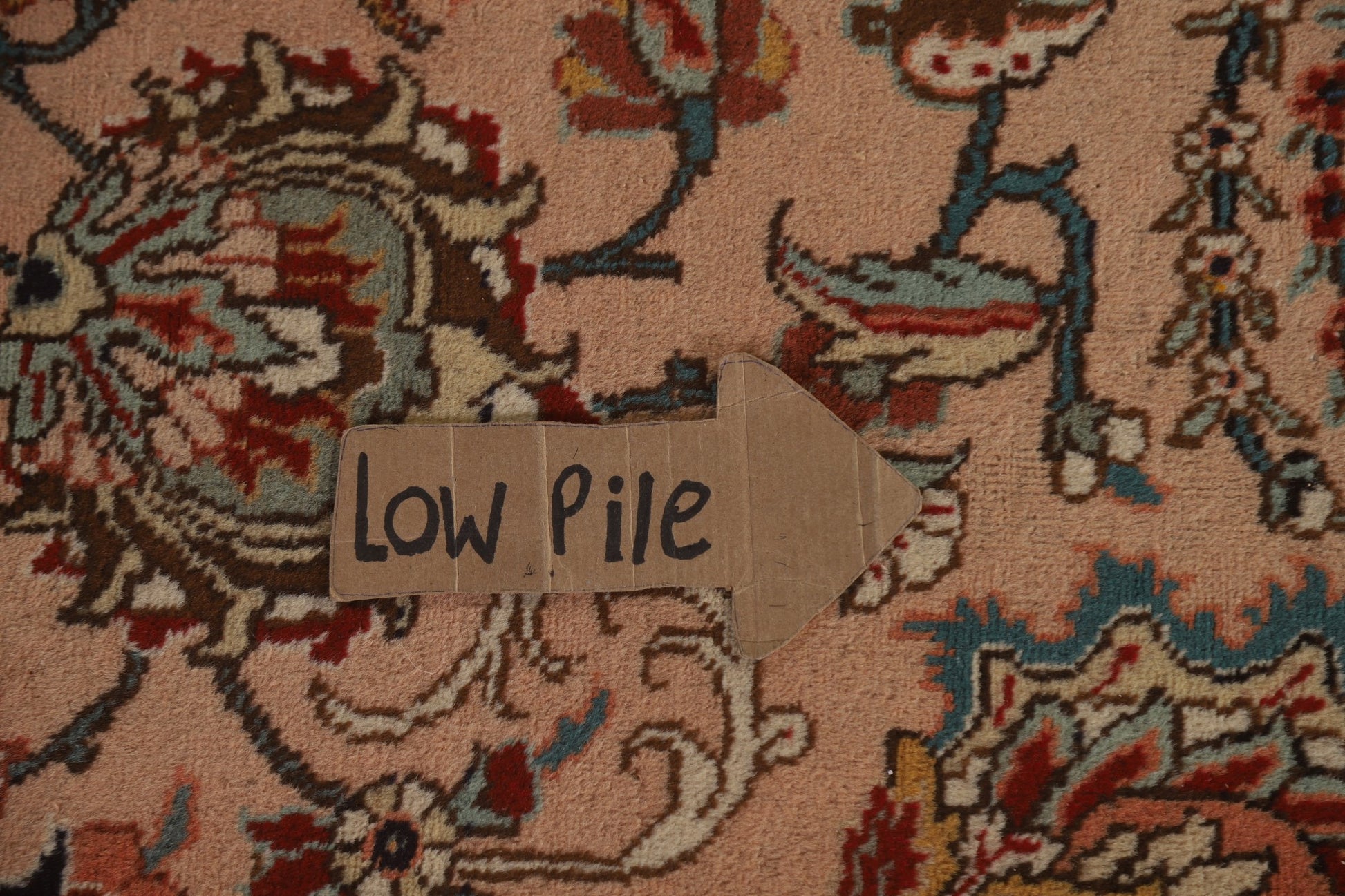 A Beautiful Genuine Persia ( Persia ) Tabriz rug is Hand Knotted by skillful weavers in Persia ( Persia ) with 100% Wool Material. This rug is in Very Good ( Low Pile ) condition. dimensions are 11' 2'' X 7' 7'' in foot and 340 X 231 in centimeter. the primary color is Peach.