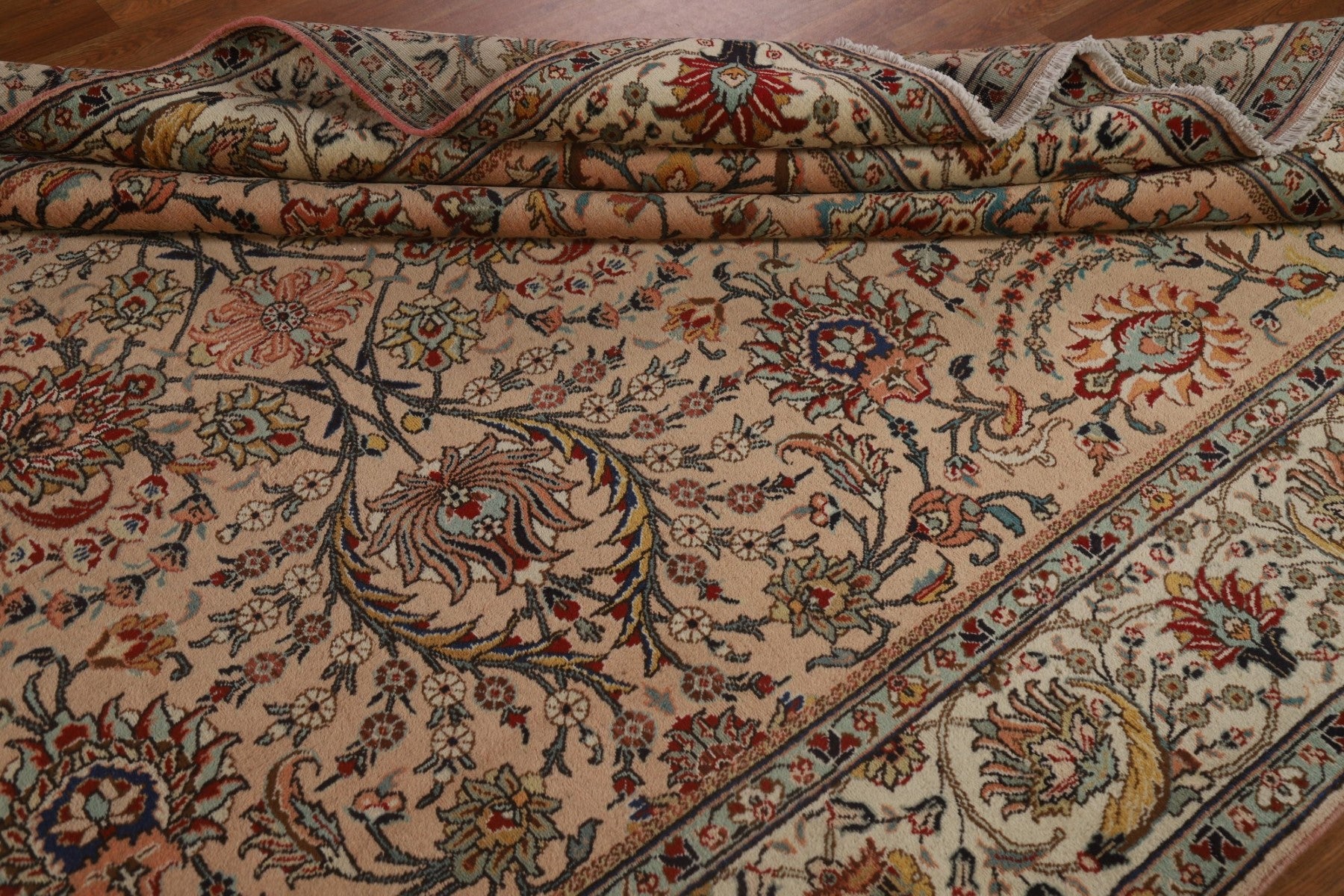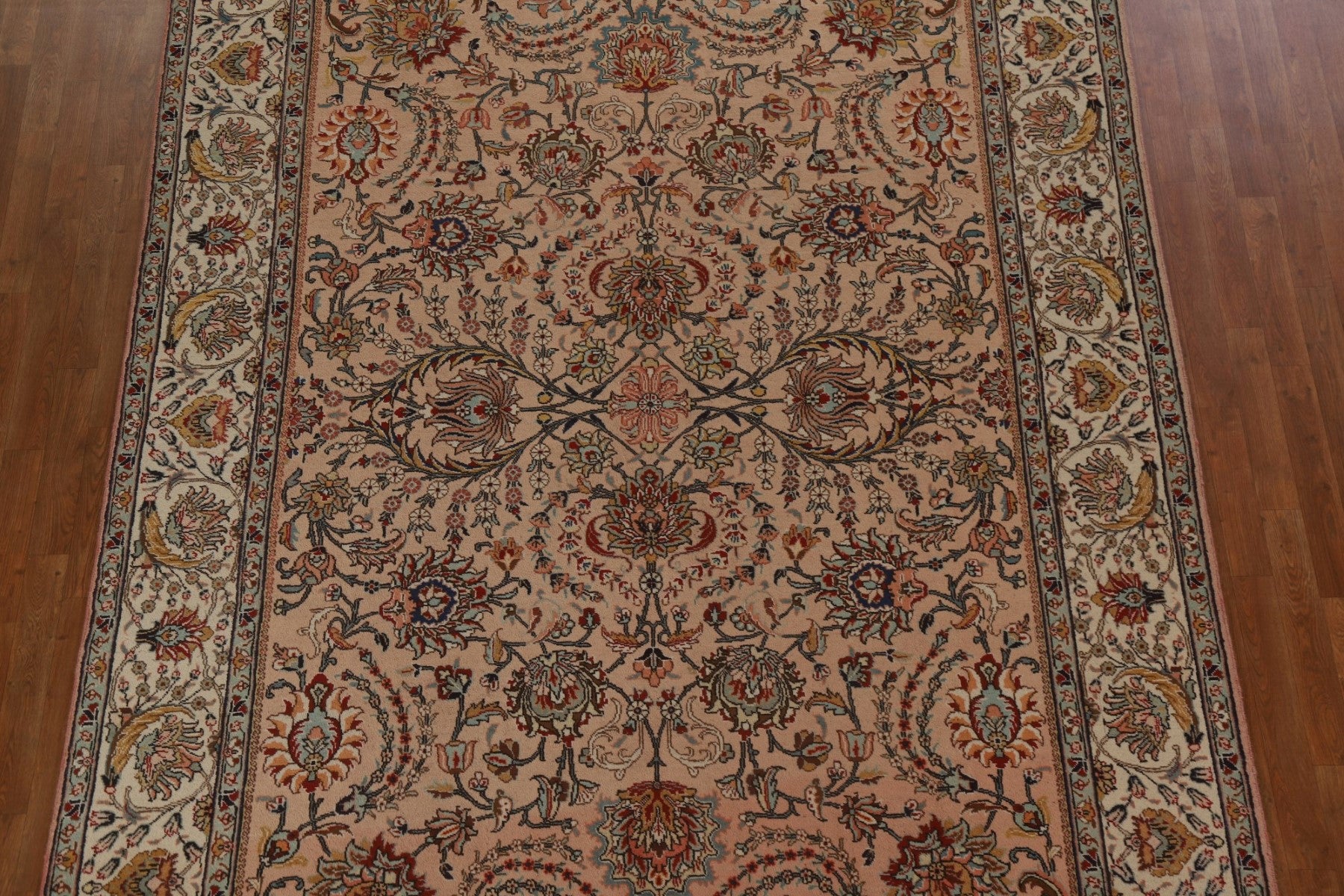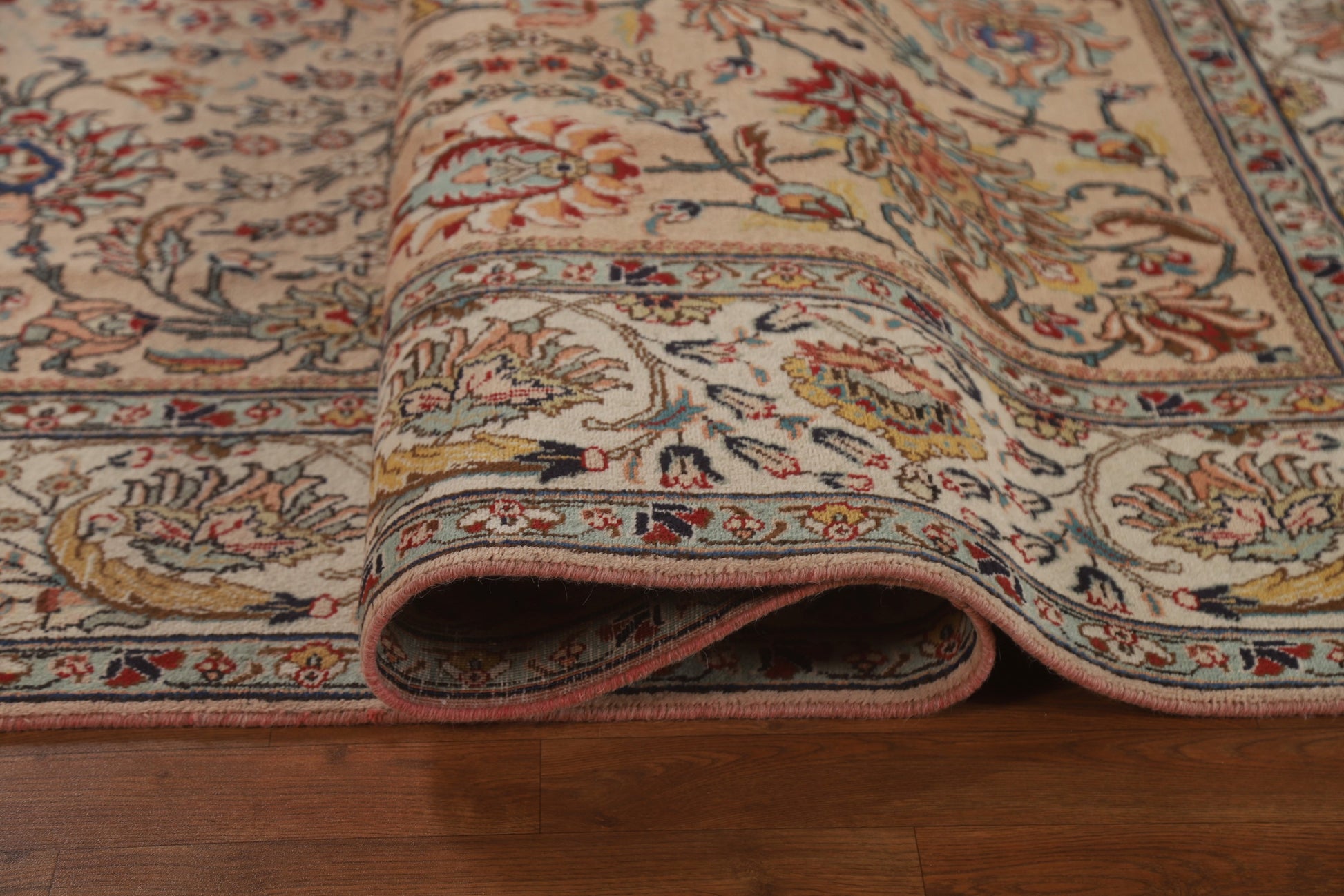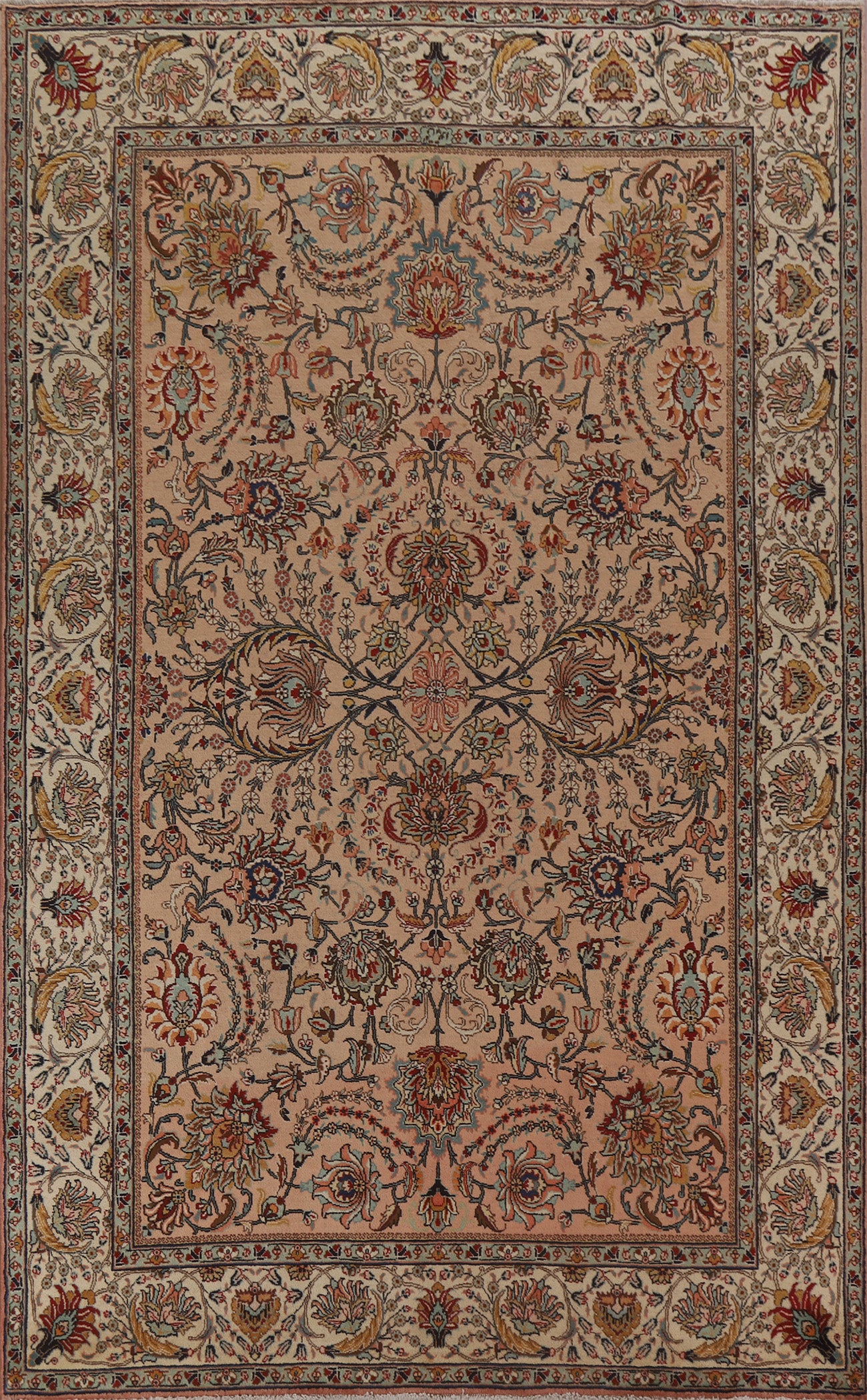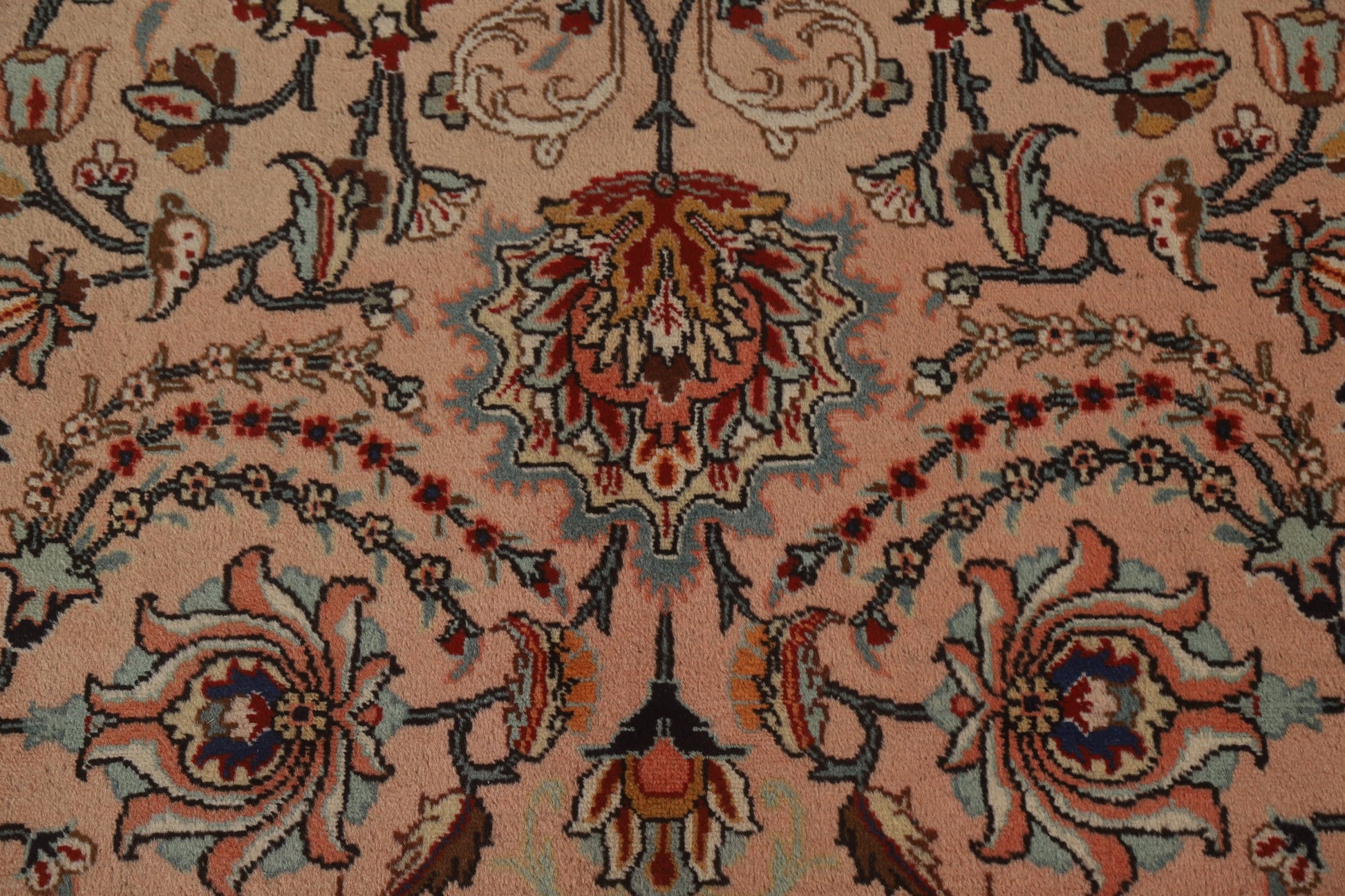 A Beautiful Genuine Persia ( Persia ) Tabriz rug is Hand Knotted by skillful weavers in Persia ( Persia ) with 100% Wool Material. This rug is in Very Good ( Low Pile ) condition. dimensions are 11' 2'' X 7' 7'' in foot and 340 X 231 in centimeter. the primary color is Peach.