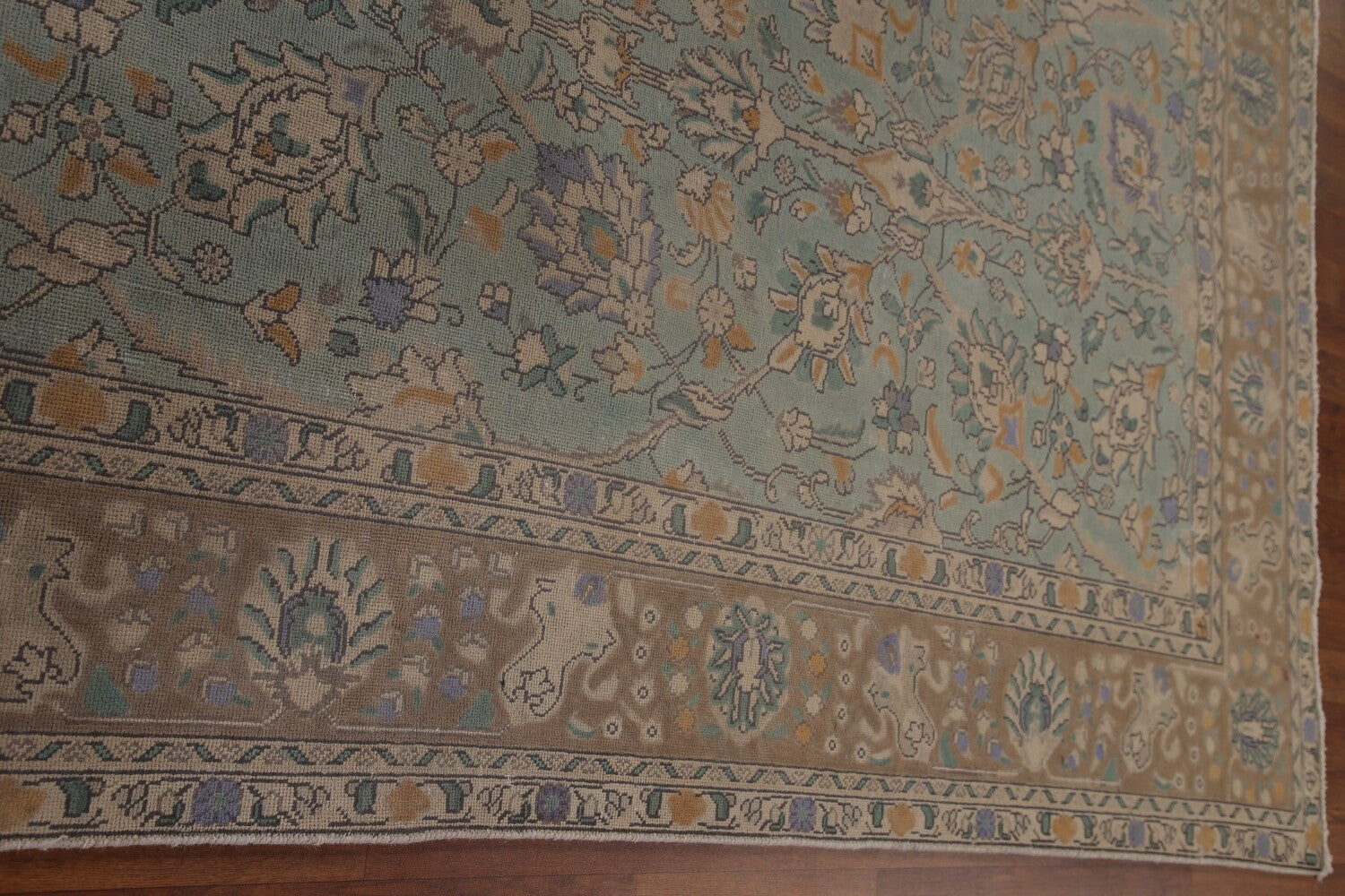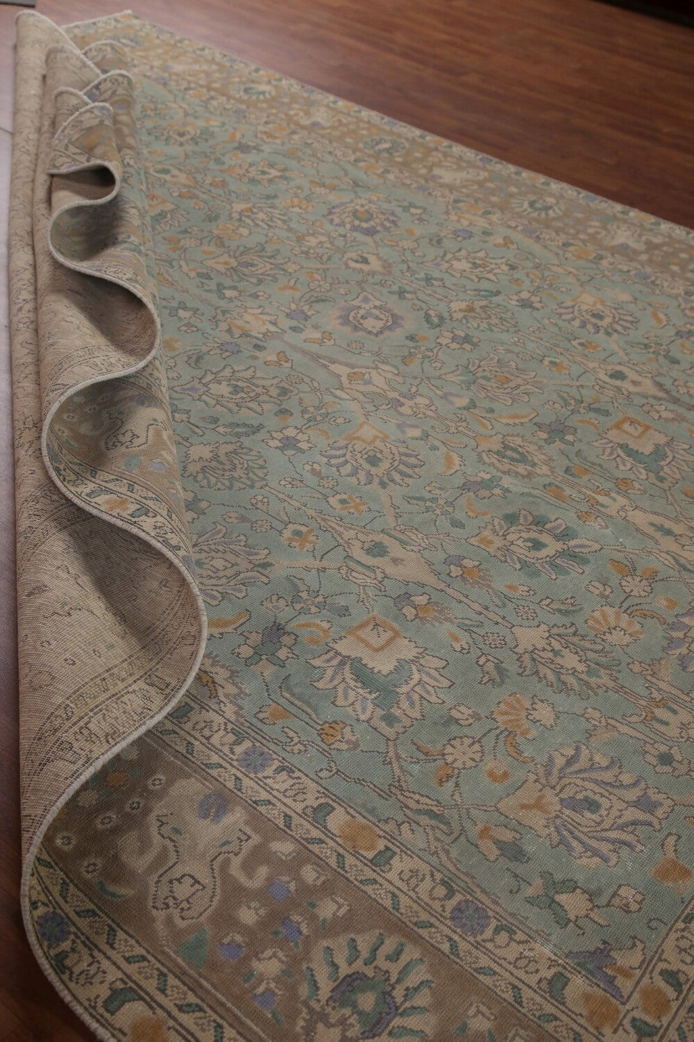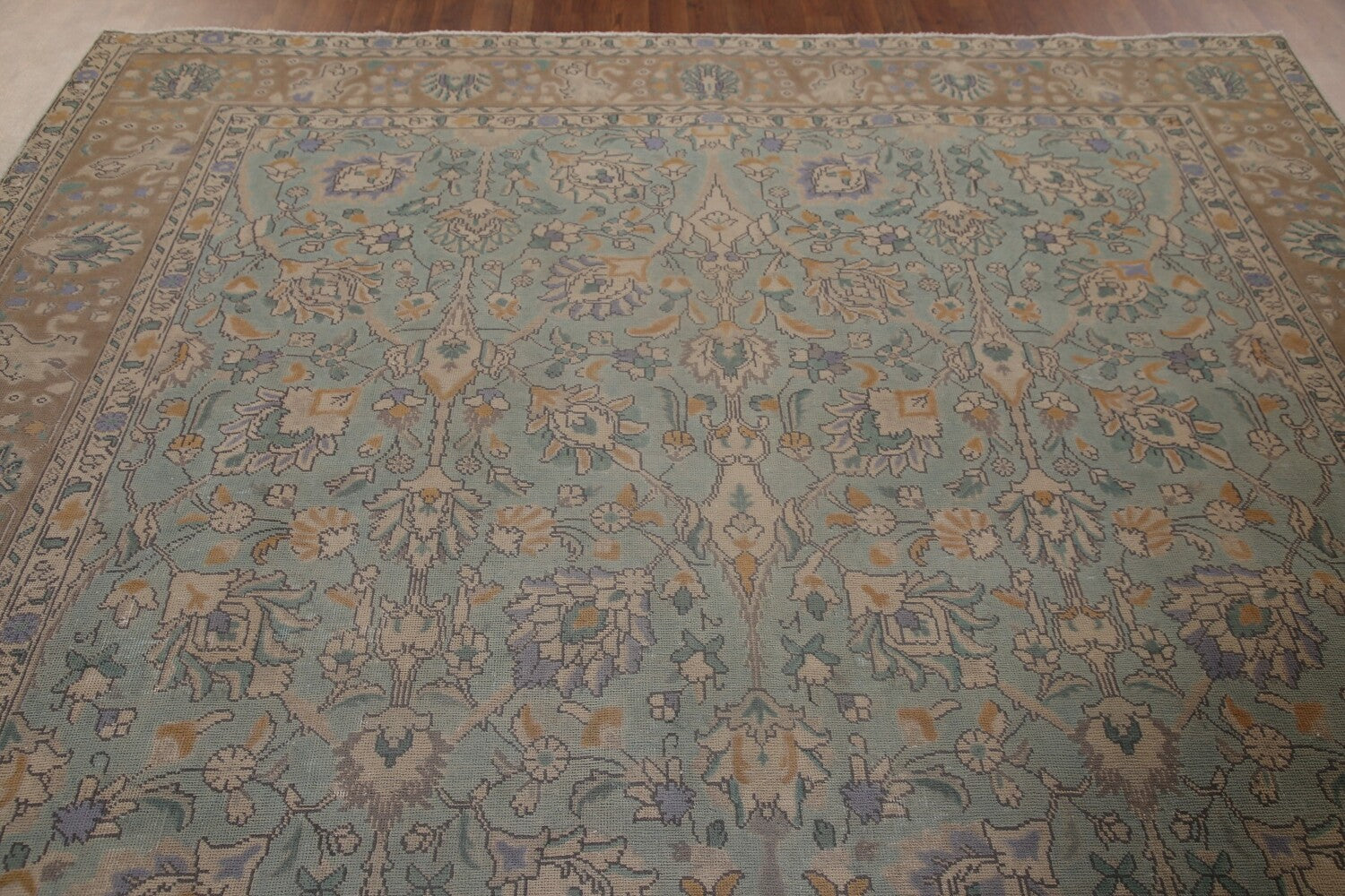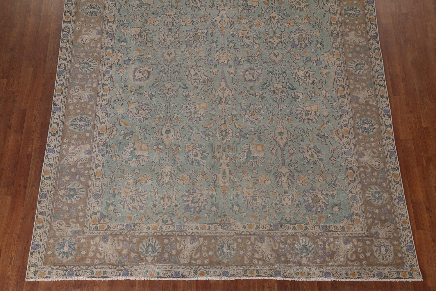 A Beautiful Genuine Persia ( Persia ) Tabriz rug is Hand Knotted by skillful weavers in Persia ( Persia ) with 100% Wool Material. This rug is in Very Good (Low Pile) condition. dimensions are 10' 10'' X 8' 0'' in foot and 330 X 244 in centimeter. the primary color is Green.