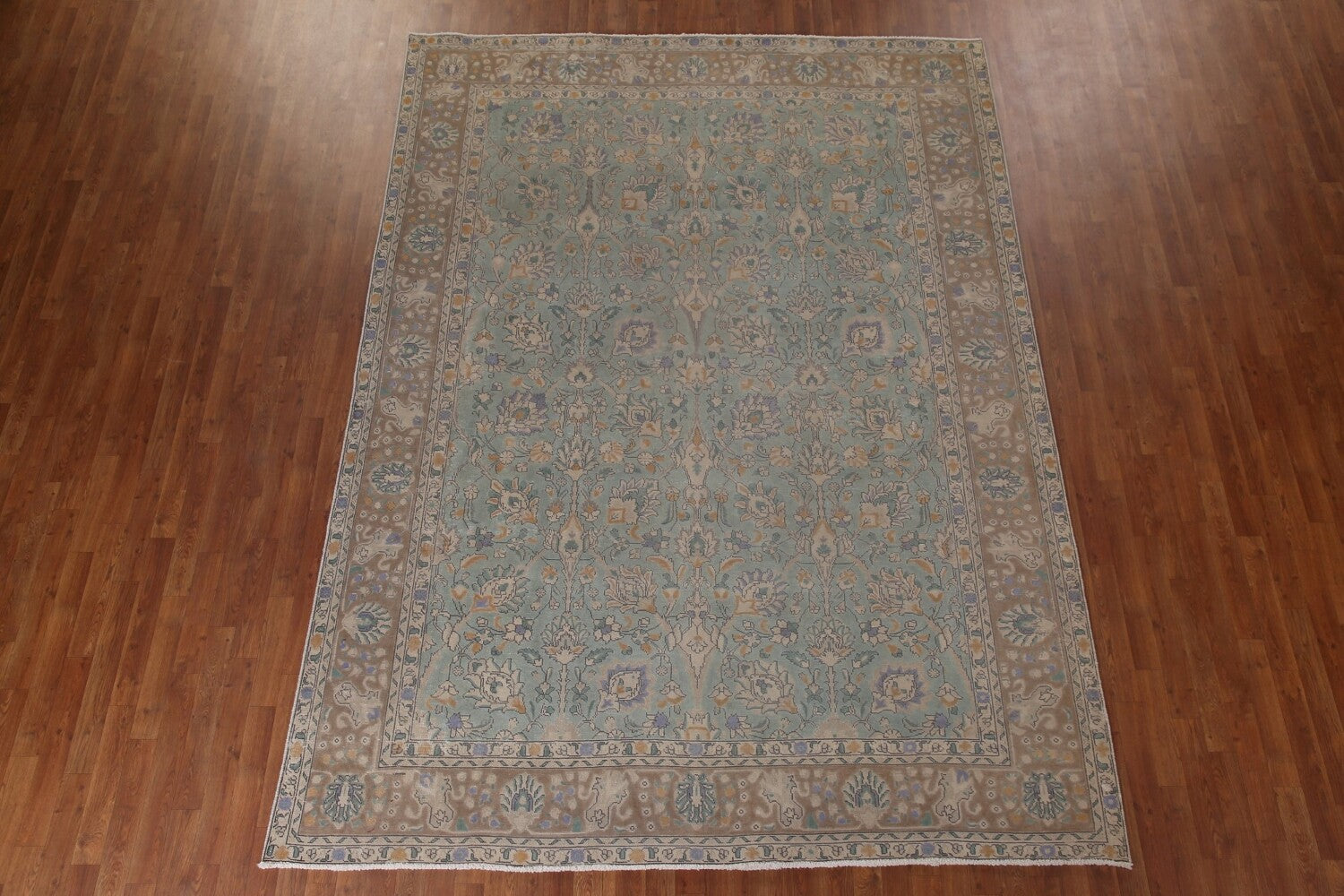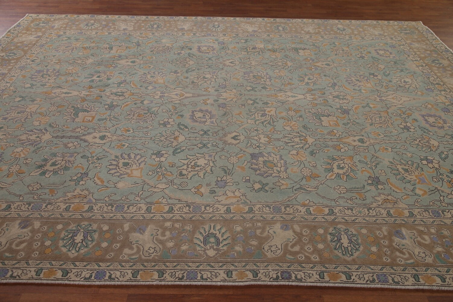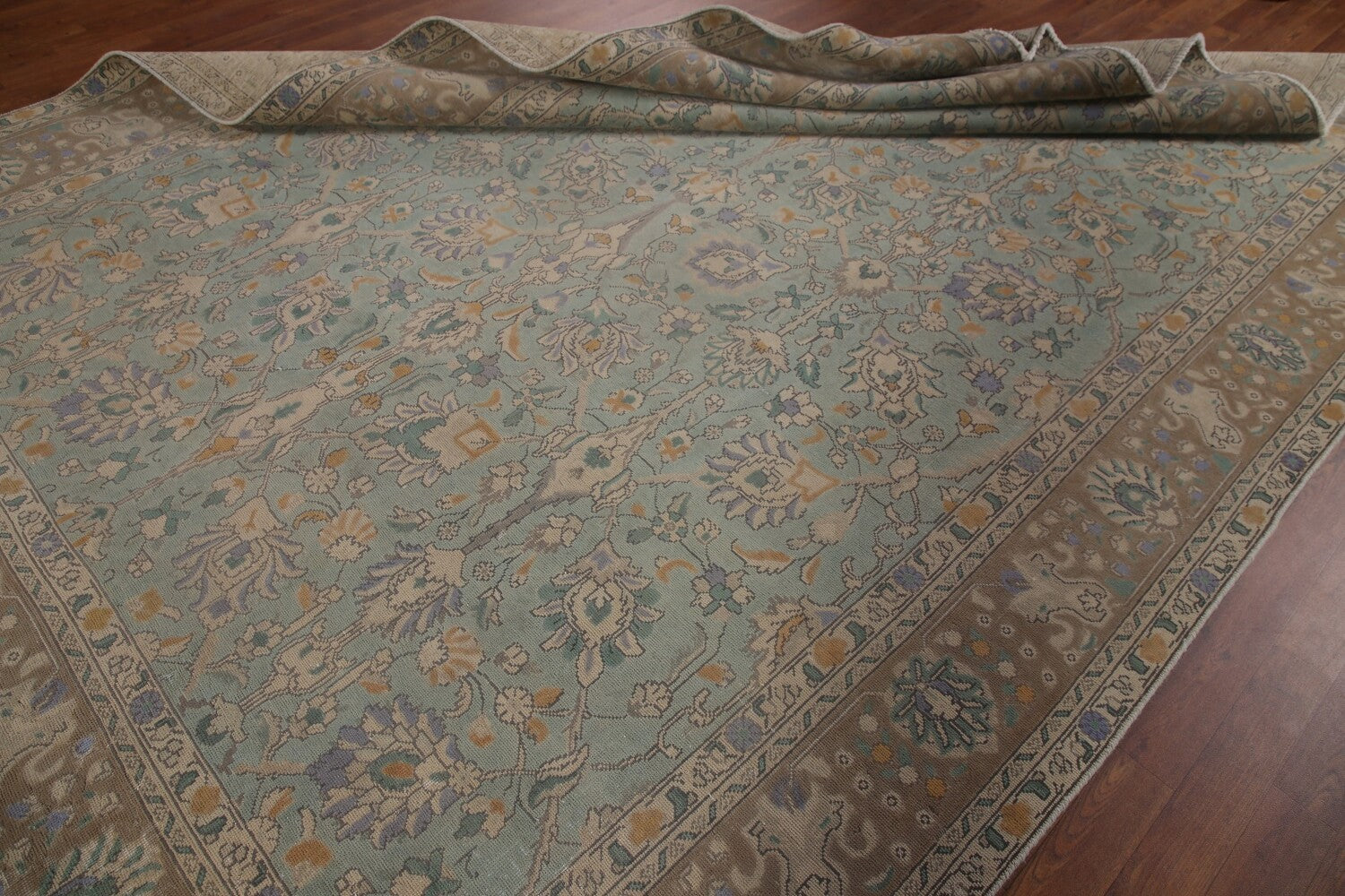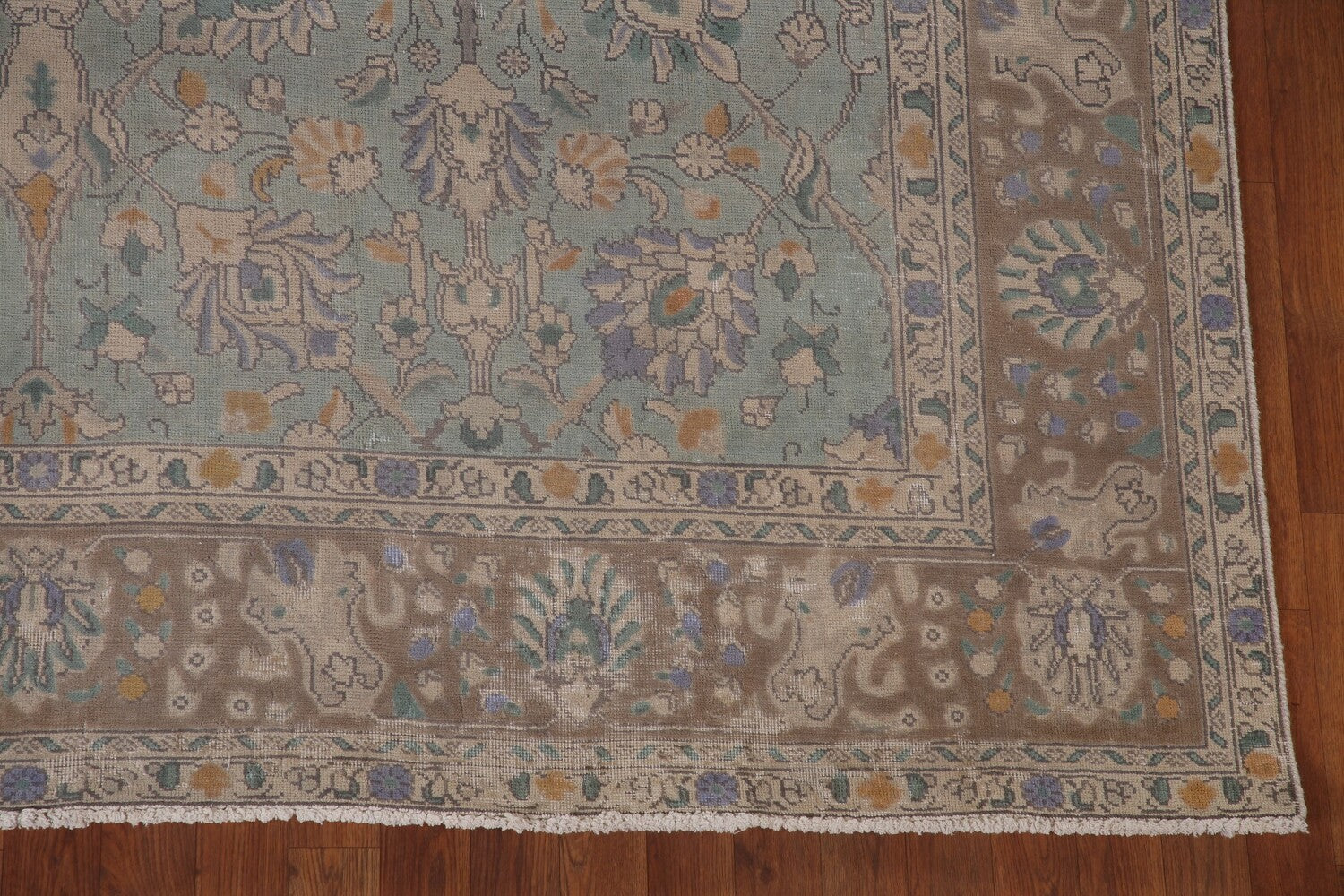 A Beautiful Genuine Persia ( Persia ) Tabriz rug is Hand Knotted by skillful weavers in Persia ( Persia ) with 100% Wool Material. This rug is in Very Good (Low Pile) condition. dimensions are 10' 10'' X 8' 0'' in foot and 330 X 244 in centimeter. the primary color is Green.