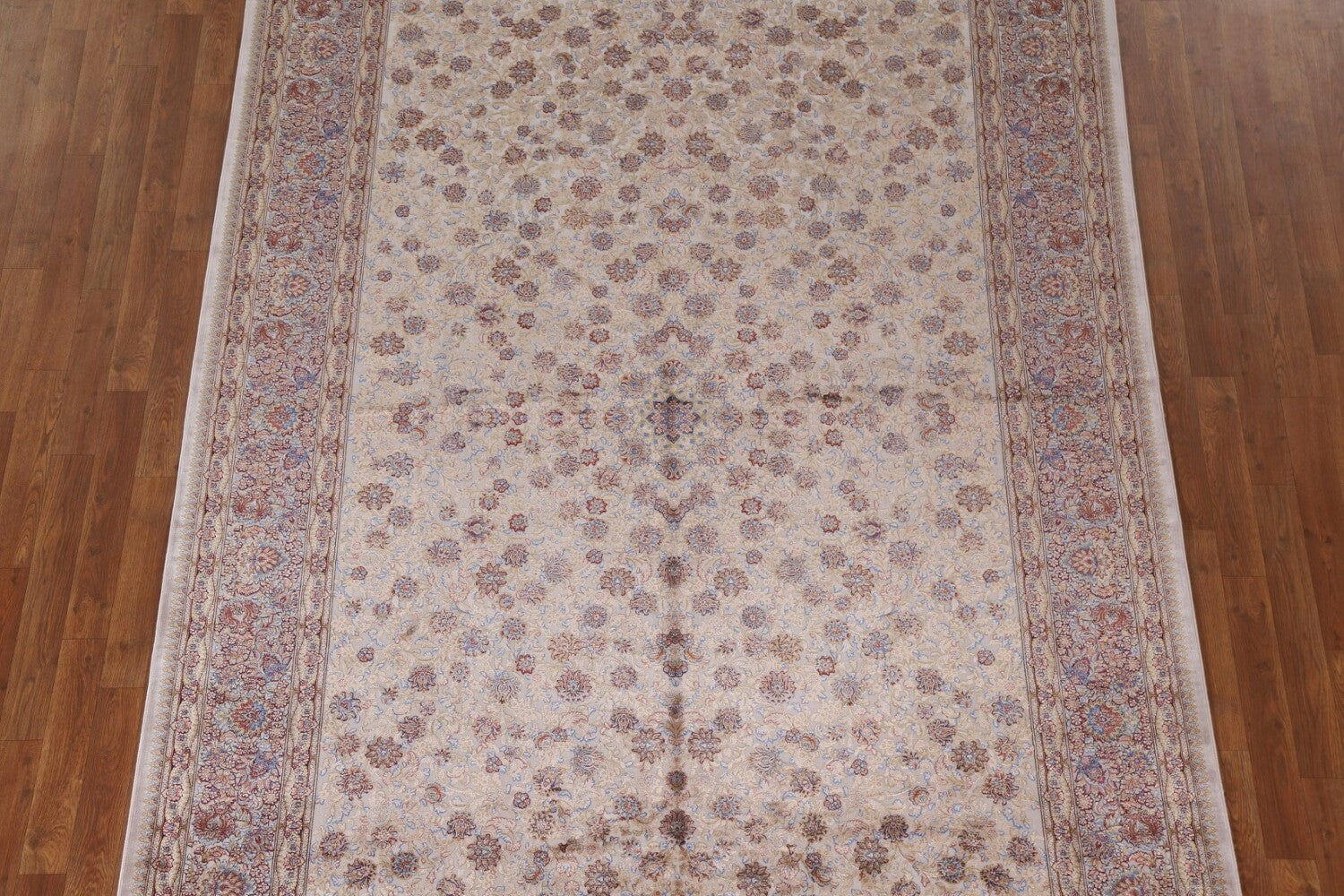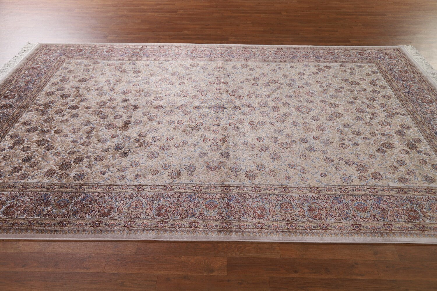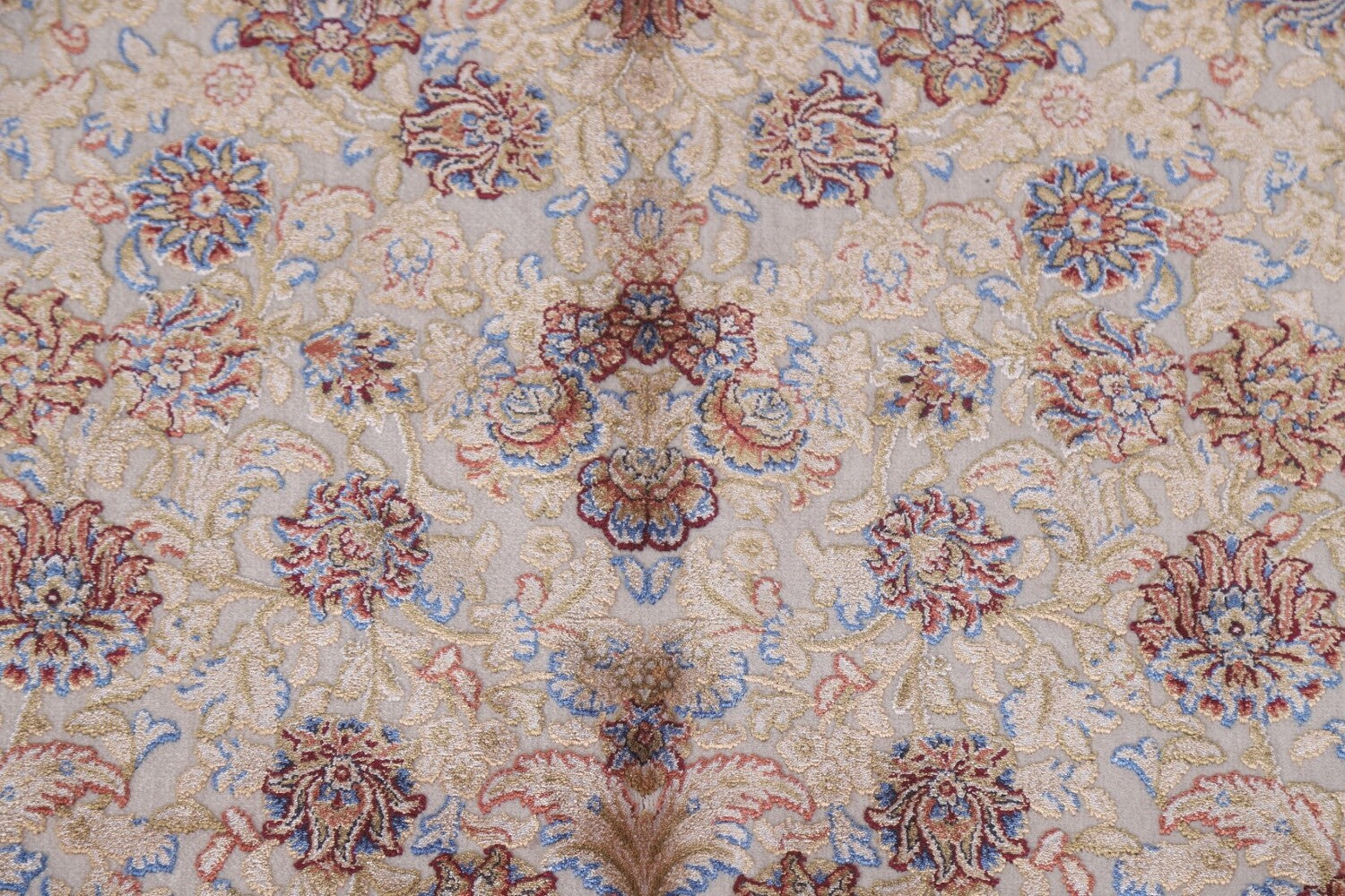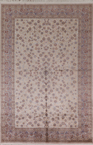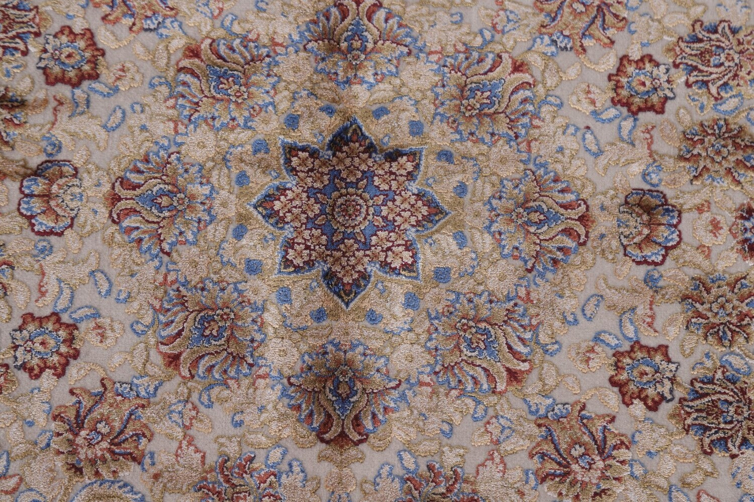 A Beautiful Genuine Turkey Tabriz rug is Machine Made by skillful weavers in Turkey with 90% Silk - 10% Polyester Material. This rug is in condition. dimensions are 9' 8'' X 6' 6'' in foot and 295 X 198 in centimeter. the primary color is Beige & Ivories.