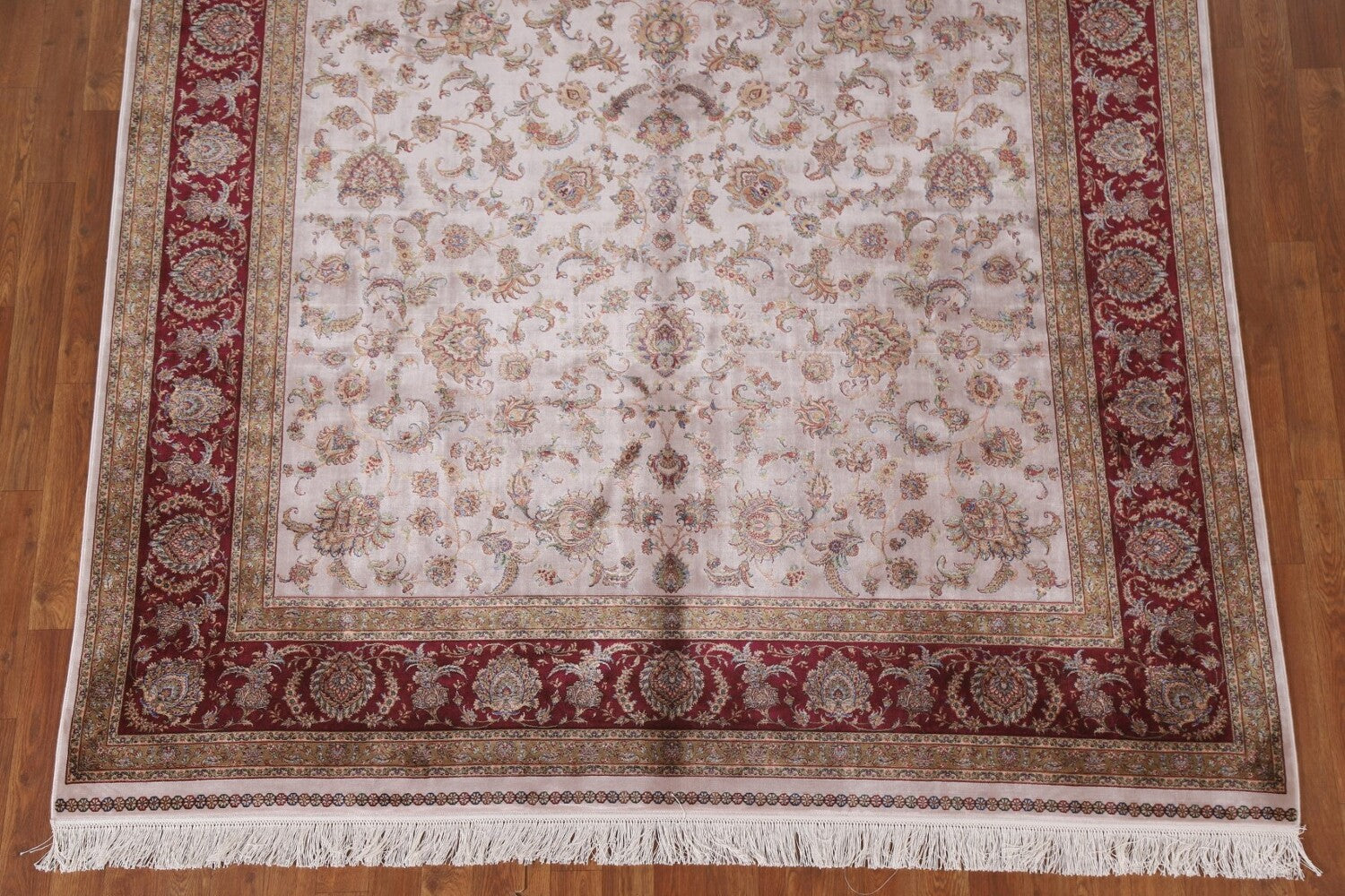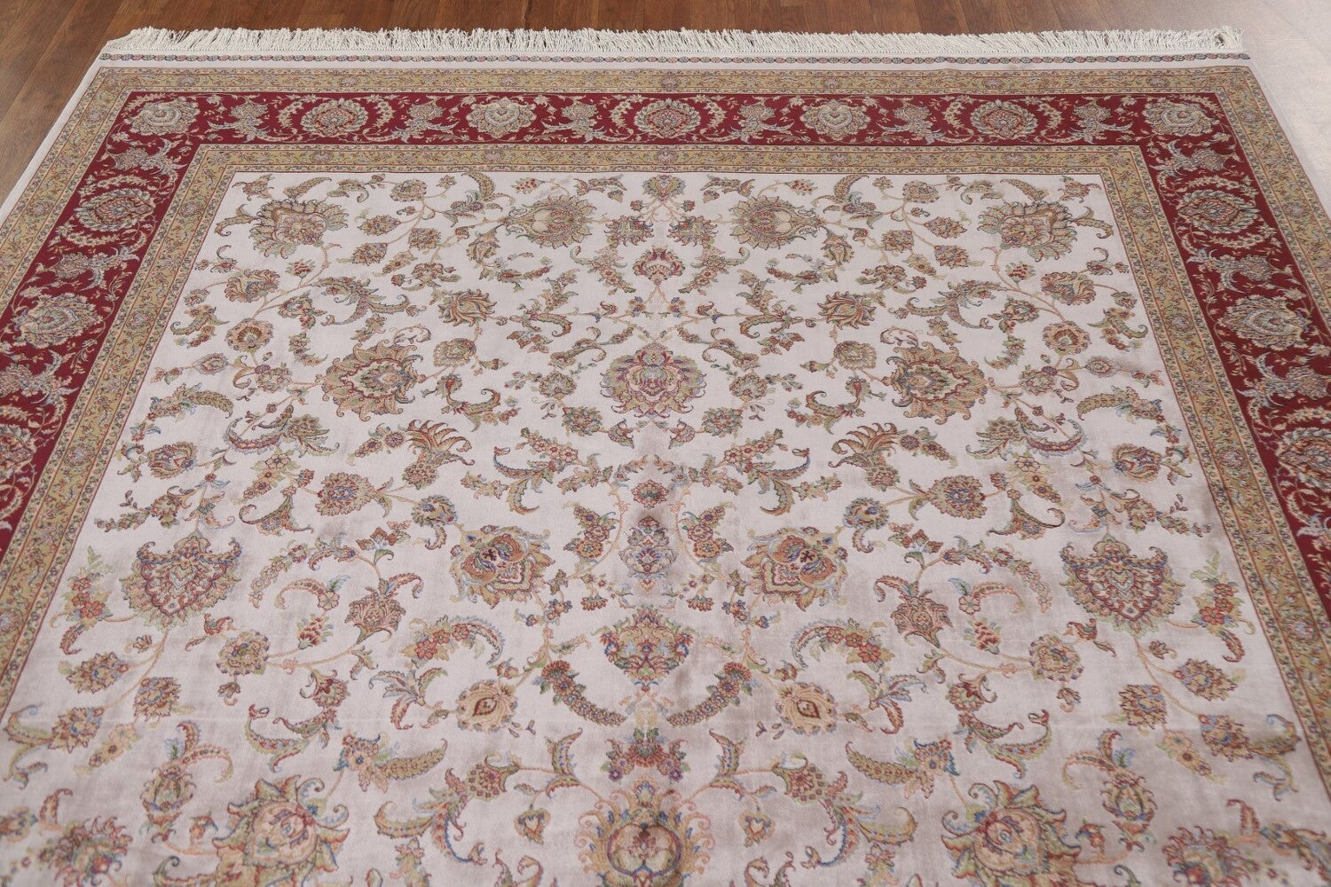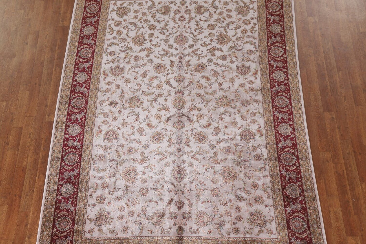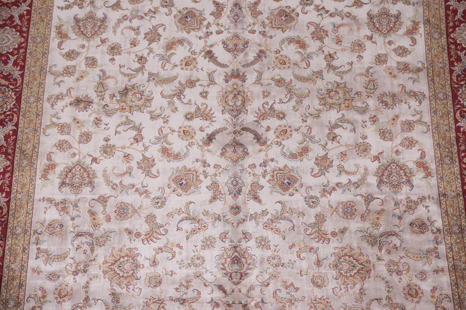A Beautiful Genuine Turkey Tabriz rug is Machine Made by skillful weavers in Turkey with 90% Silk - 10% Polyester Material. This rug is in condition. dimensions are 9' 11'' X 6' 7'' in foot and 302 X 201 in centimeter. the primary color is Beige & Ivories.