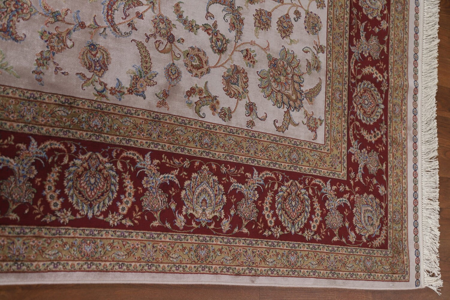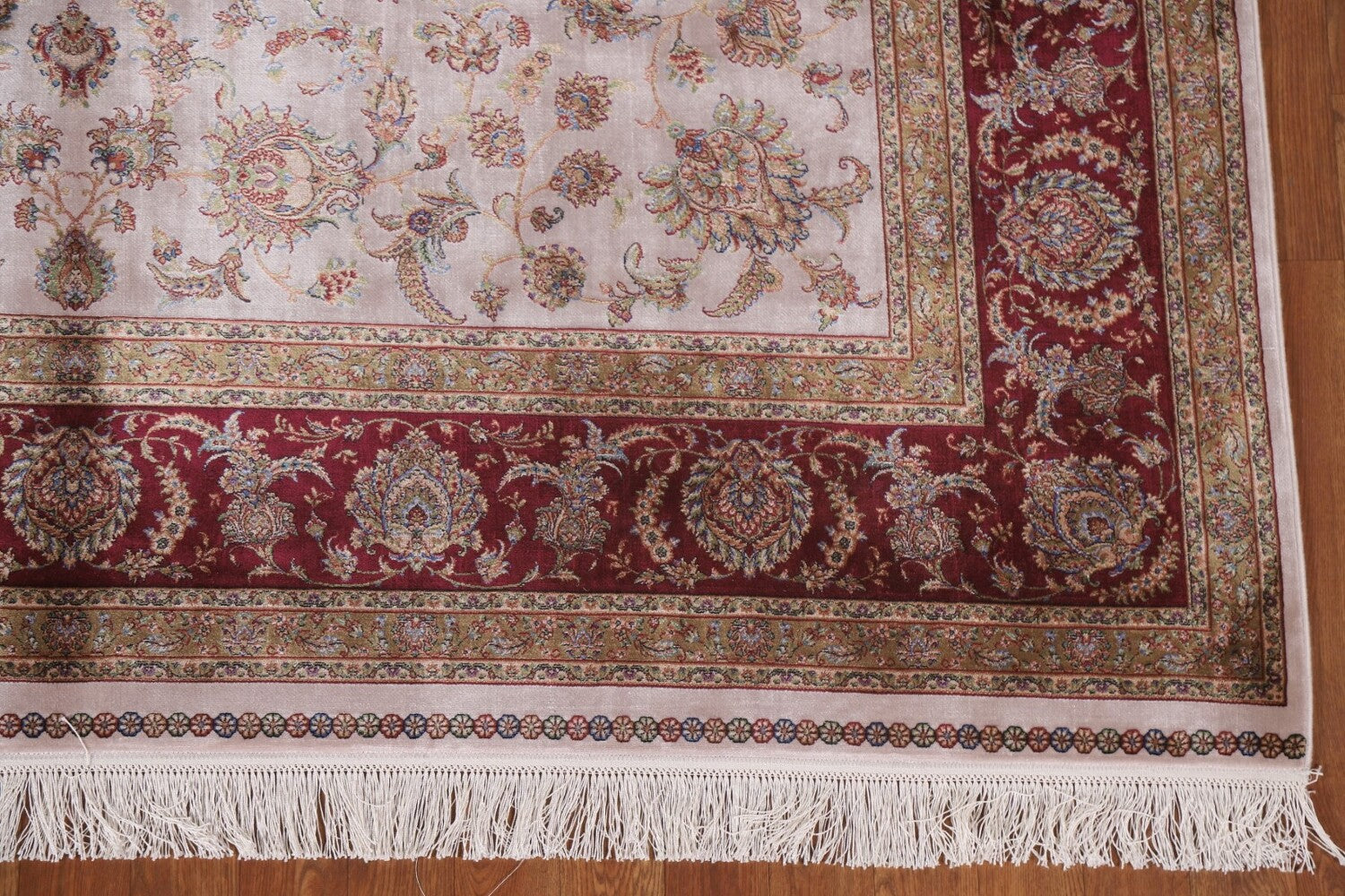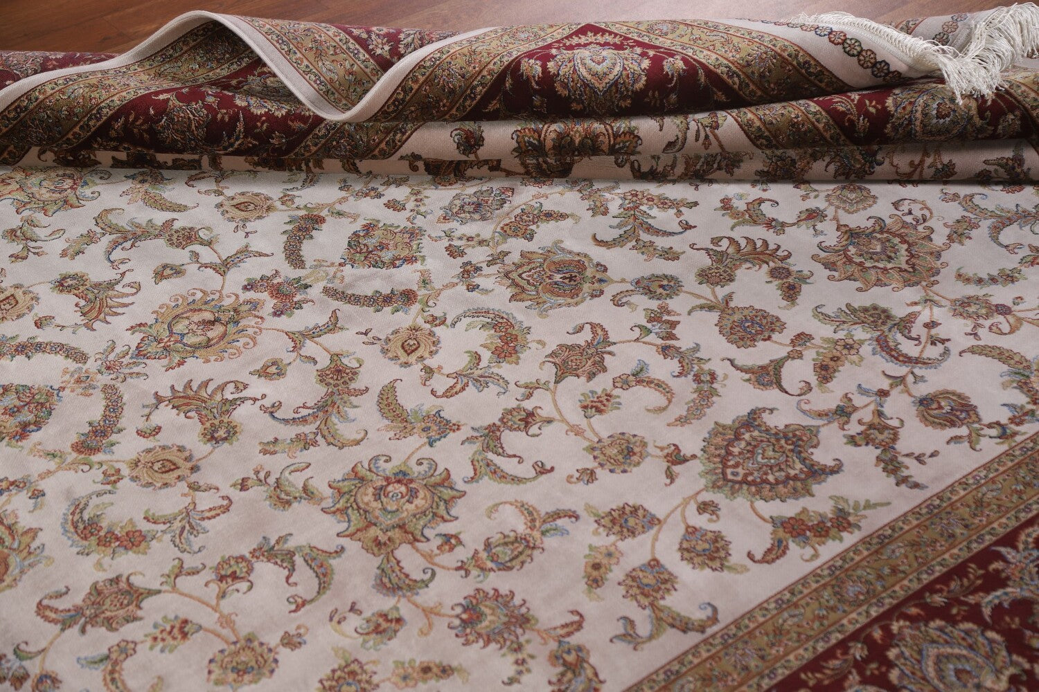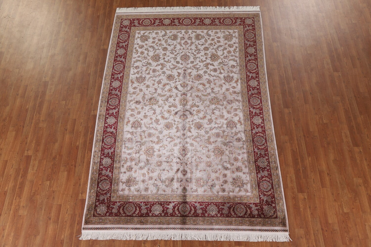 A Beautiful Genuine Turkey Tabriz rug is Machine Made by skillful weavers in Turkey with 90% Silk - 10% Polyester Material. This rug is in condition. dimensions are 9' 11'' X 6' 7'' in foot and 302 X 201 in centimeter. the primary color is Beige & Ivories.