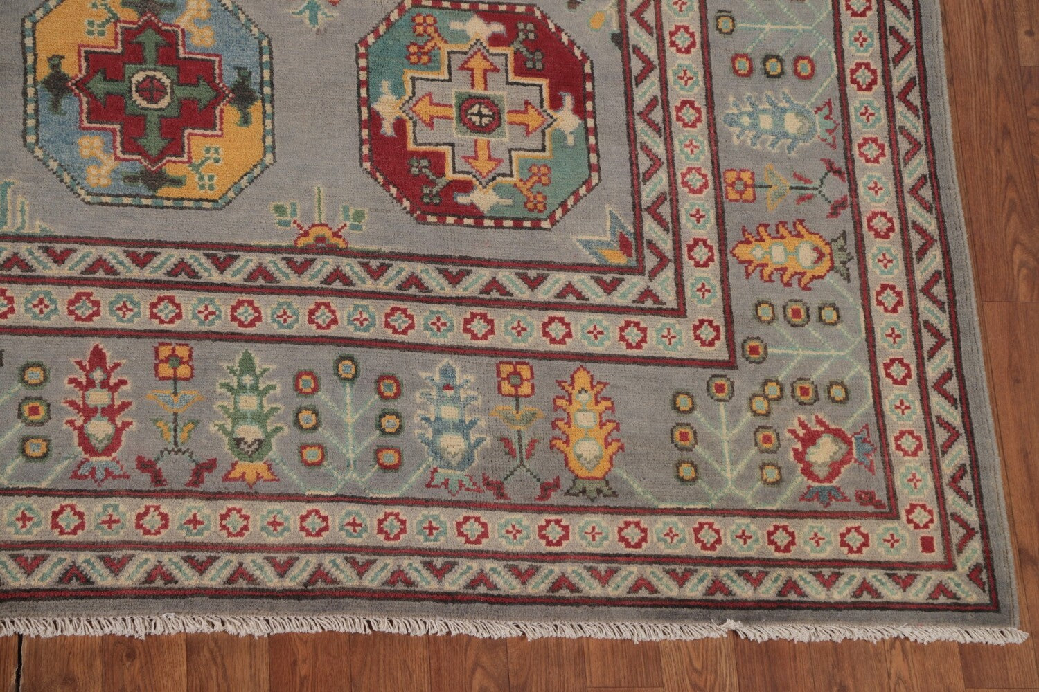 A Beautiful Genuine Pakistan Kazak rug is Hand Knotted by skillful weavers in Pakistan with 100% Wool Material. This rug is in New, First Quality condition. dimensions are 11' 9'' X 8' 5'' in foot and 358 X 257 in centimeter. the primary color is Greys & Charcoal.