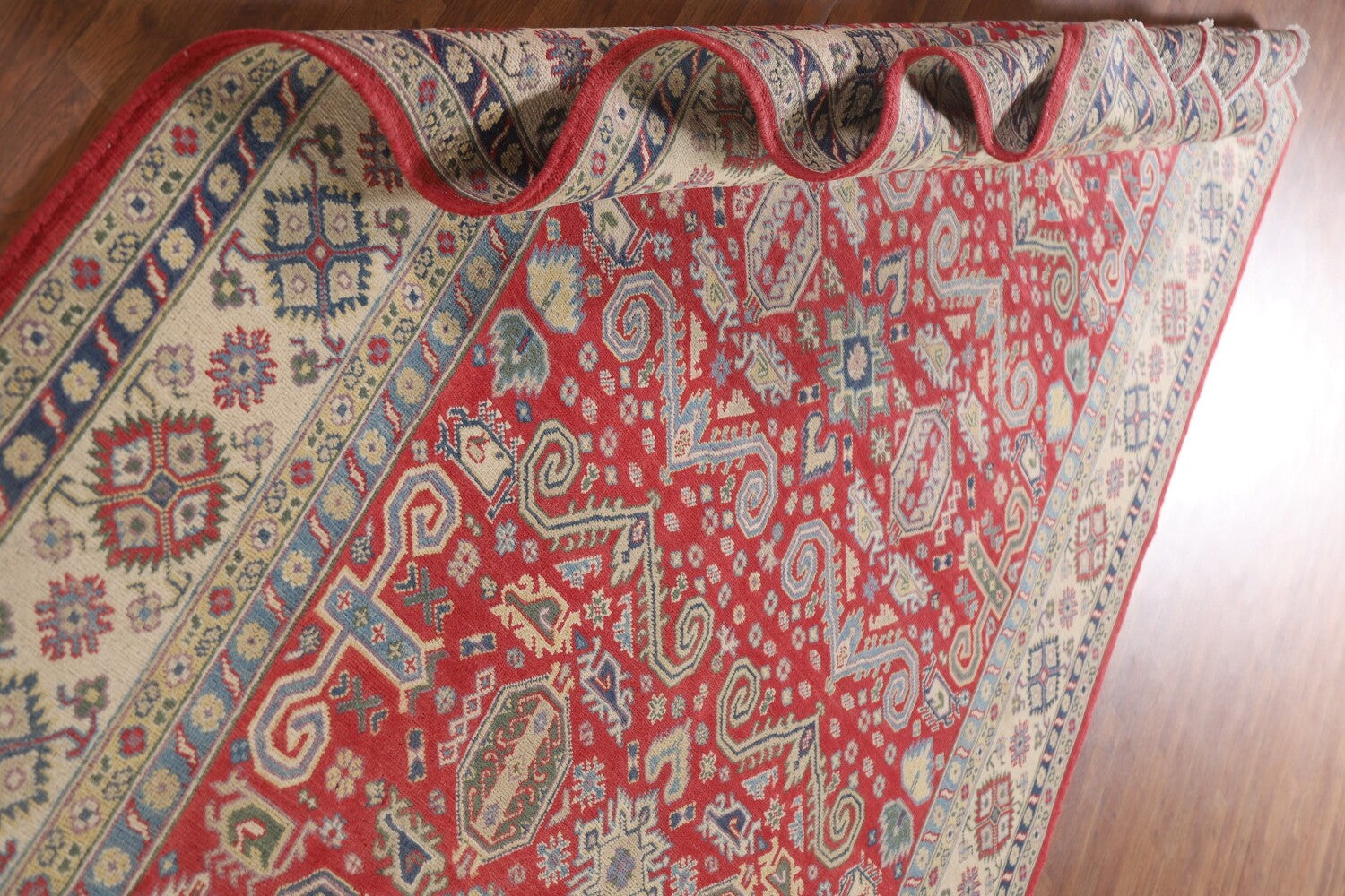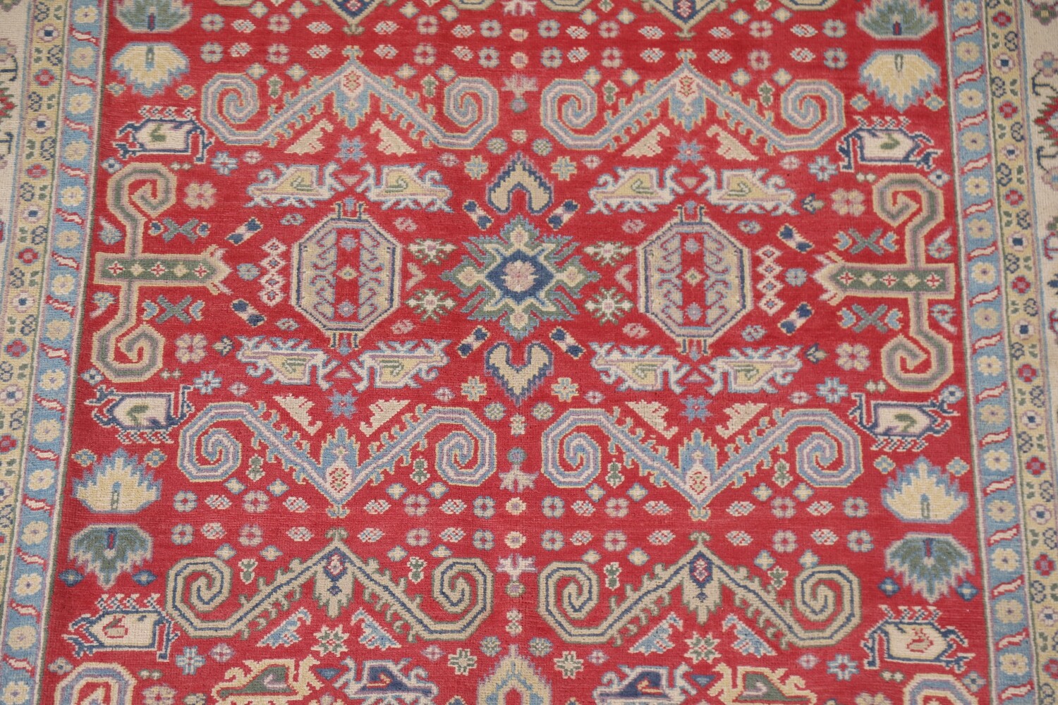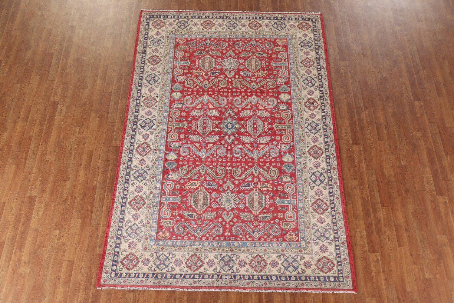 A Beautiful Genuine Pakistan Kazak rug is Hand Knotted by skillful weavers in Pakistan with 100% Wool Material. This rug is in New, First Quality condition. dimensions are 9' 9'' X 6' 7'' in foot and 297 X 201 in centimeter. the primary color is Red.