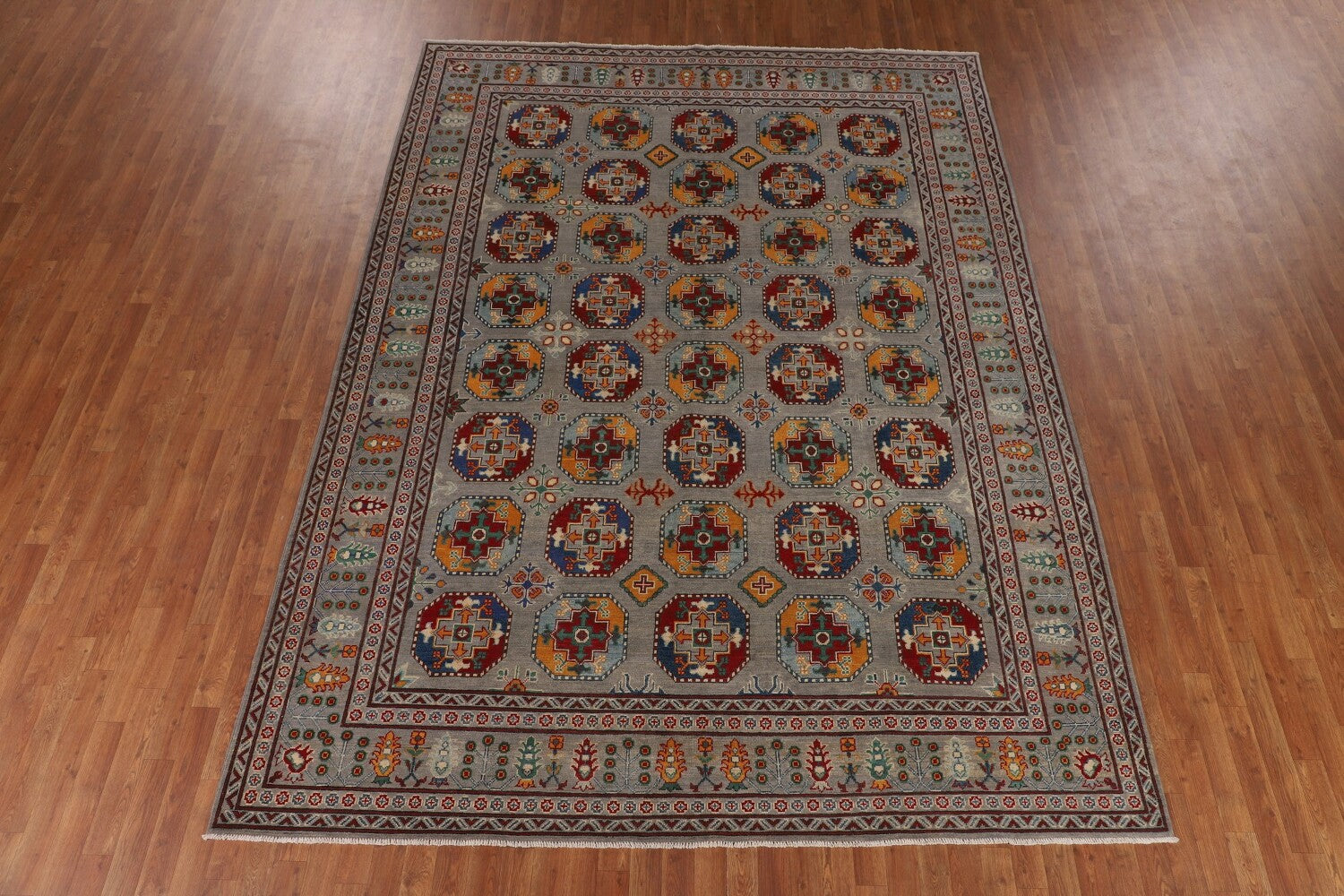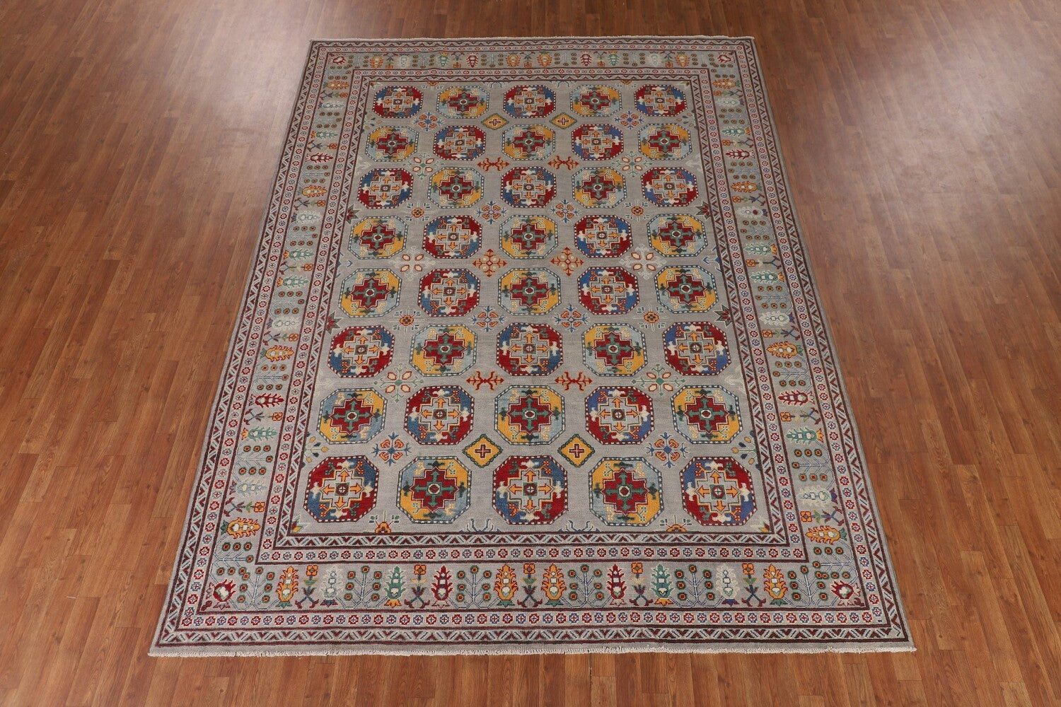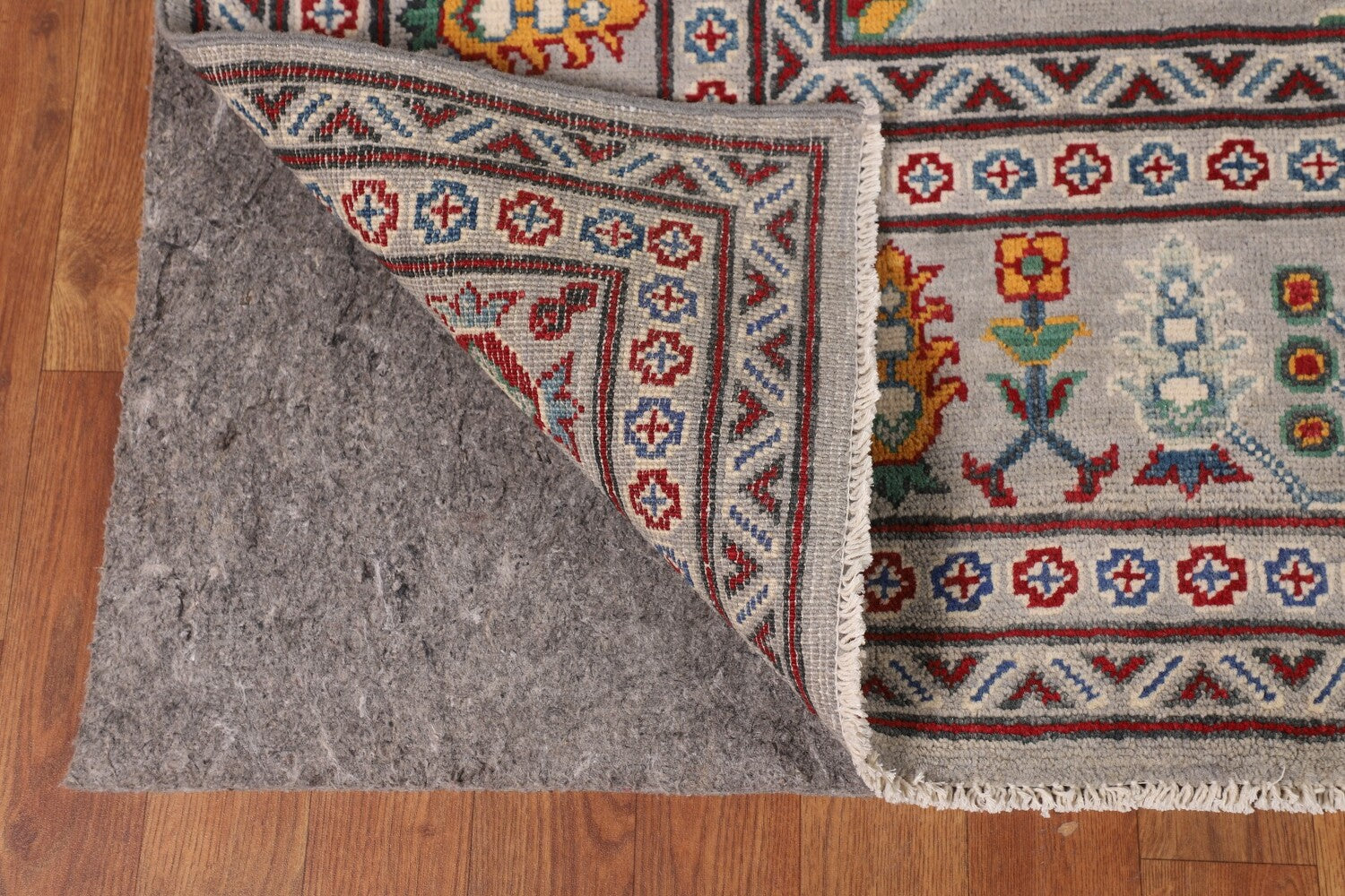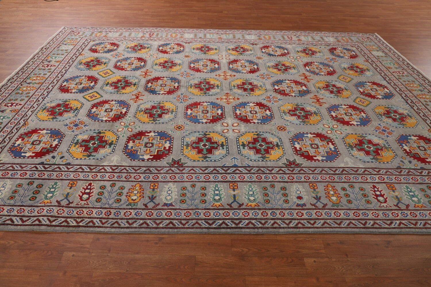 A Beautiful Genuine Pakistan Kazak rug is Hand Knotted by skillful weavers in Pakistan with 100% Wool Material. This rug is in New, First Quality condition. dimensions are 11' 4'' X 8' 4'' in foot and 345 X 254 in centimeter. the primary color is Greys & Charcoal.
