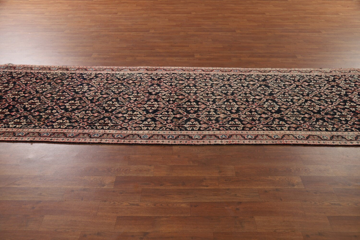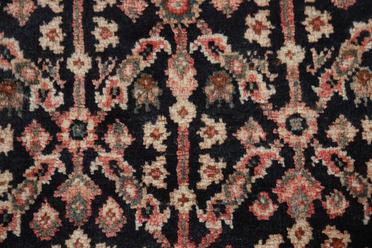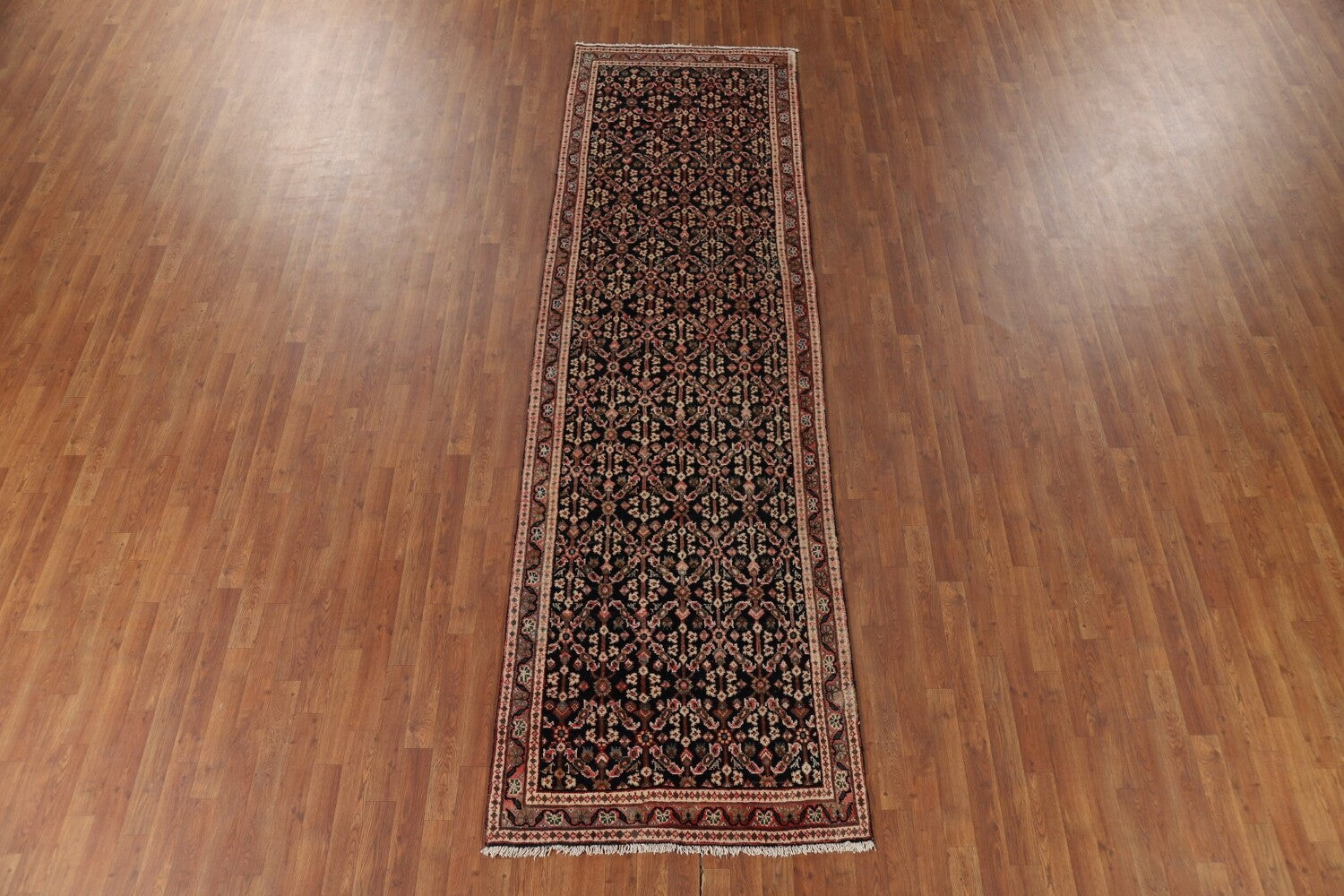 A Beautiful Genuine Persia ( Persia ) Mahal rug is Hand Knotted by skillful weavers in Persia ( Persia ) with 100% Wool Material. This rug is in Very Good (Repair) condition. dimensions are 11' 1'' X 3' 5'' in foot and 338 X 104 in centimeter. the primary color is Black.