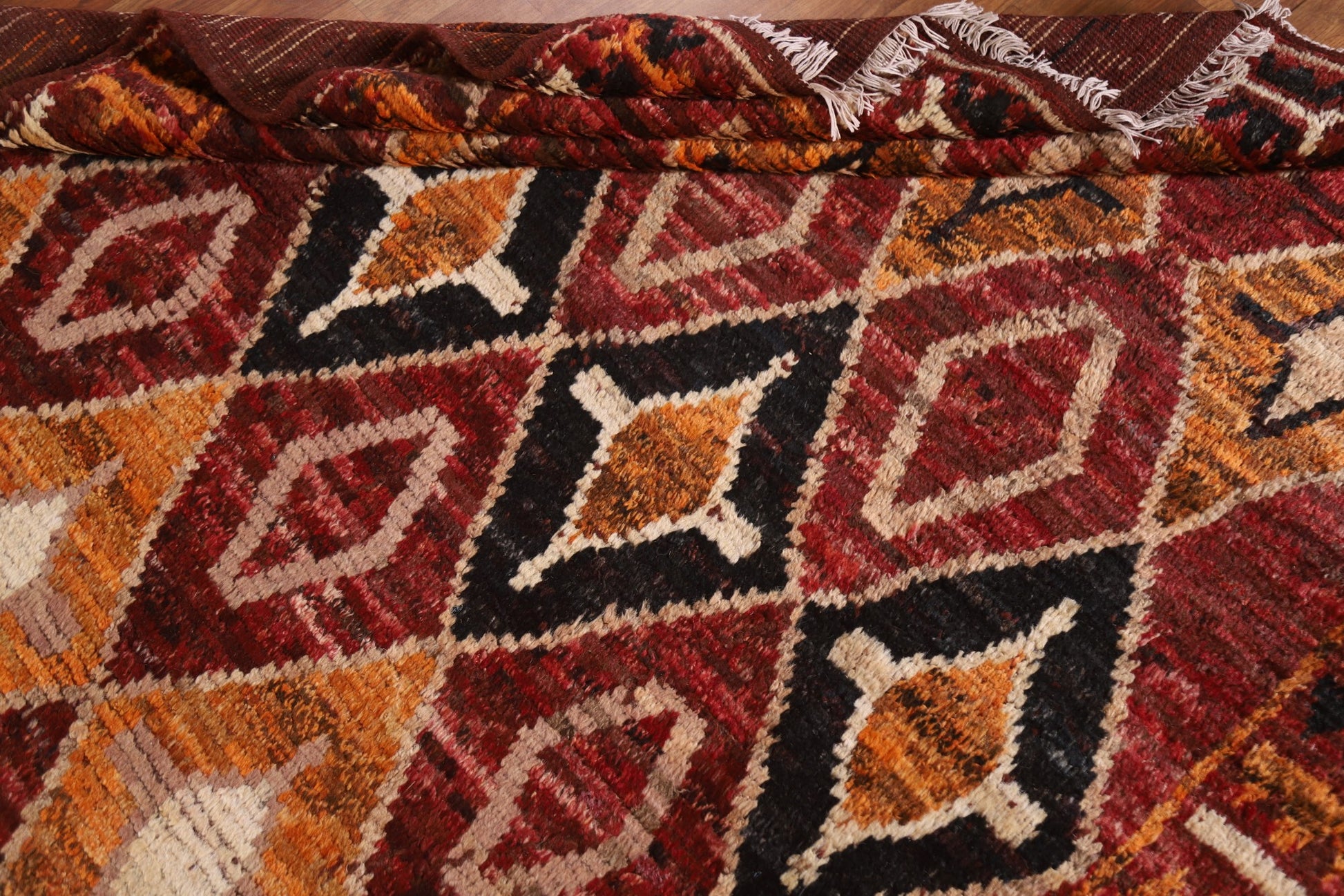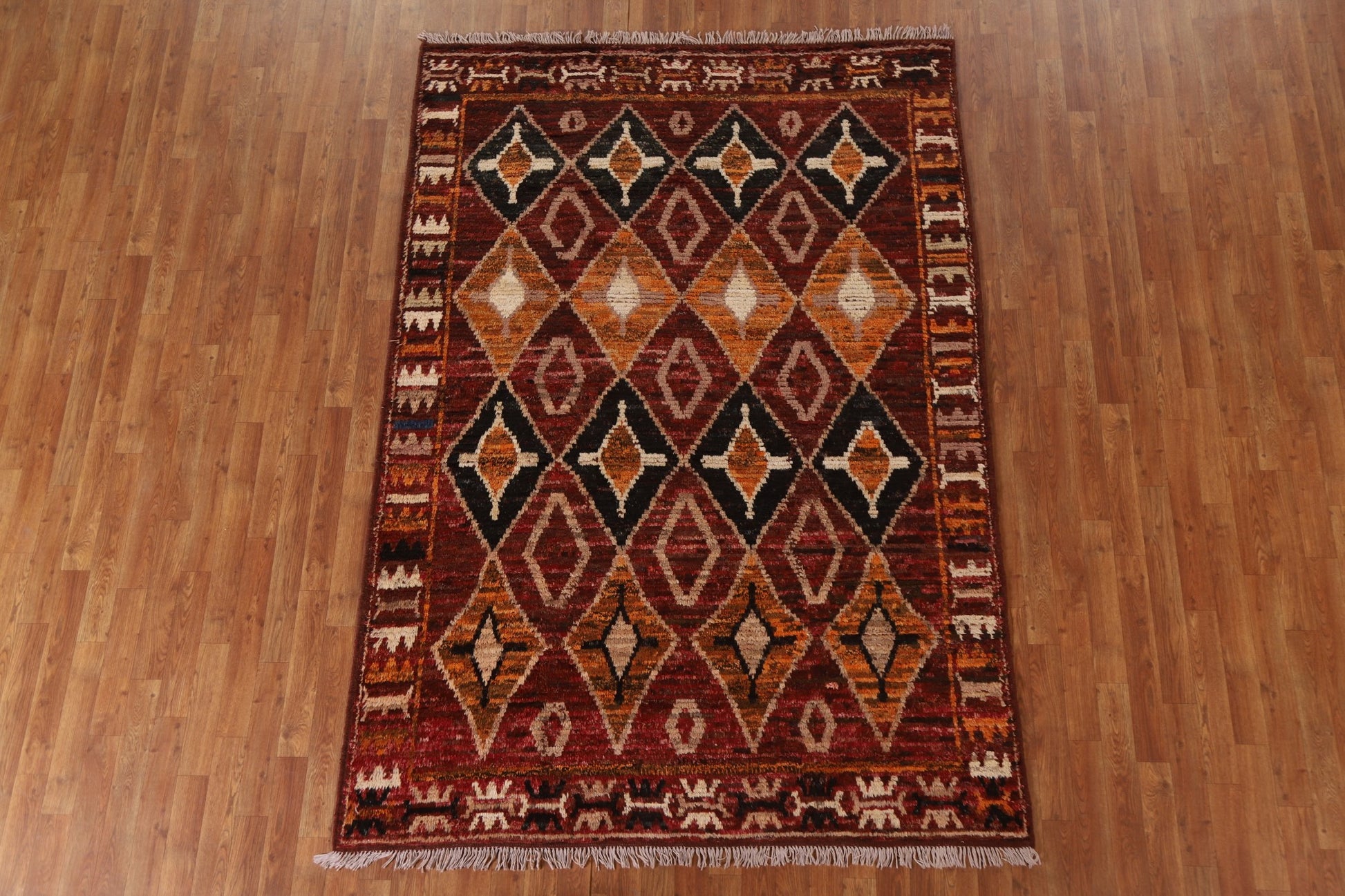 A Beautiful Genuine Pakistan Moroccan rug is Hand Knotted by skillful weavers in Pakistan with 100% Wool Material. This rug is in condition. dimensions are 8' 3'' X 5' 8'' in foot and 251 X 173 in centimeter. the primary color is Red.