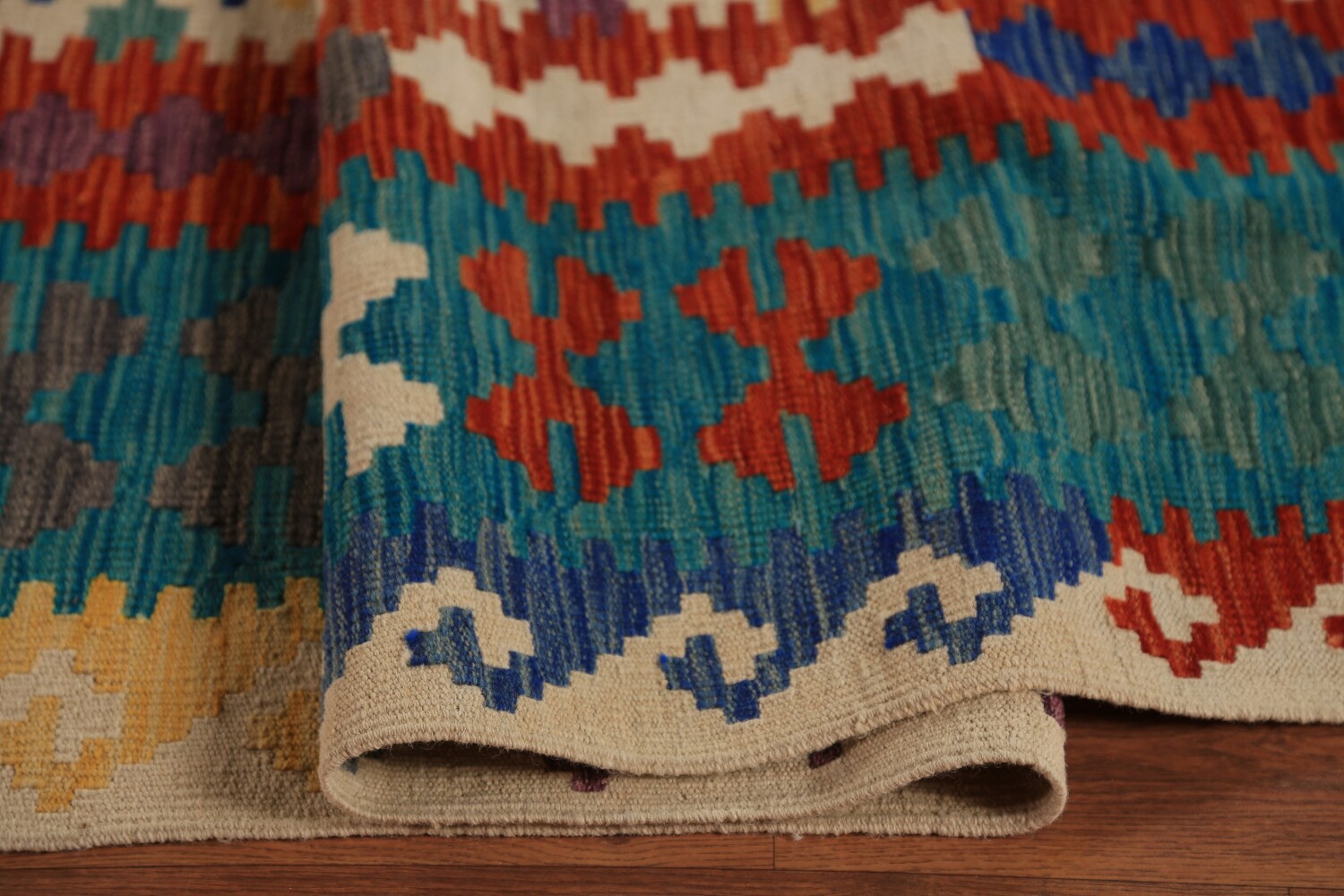 A Beautiful Genuine Pakistan Kilim rug is Hand Woven by skillful weavers in Pakistan with 100% Wool Material. This rug is in New, First Quality condition. dimensions are 16' 3'' X 10' 6'' in foot and 495 X 320 in centimeter. the primary color is Multi-Colored.