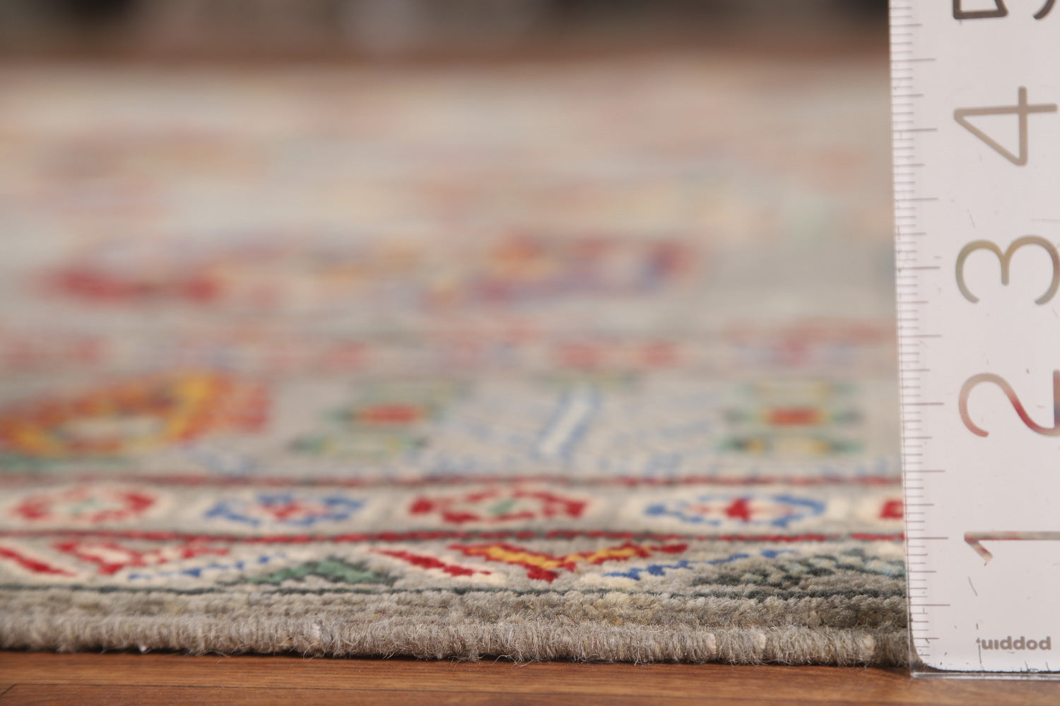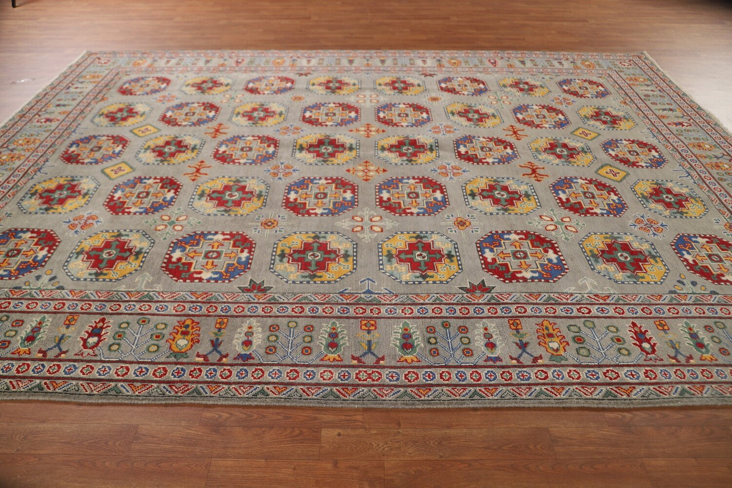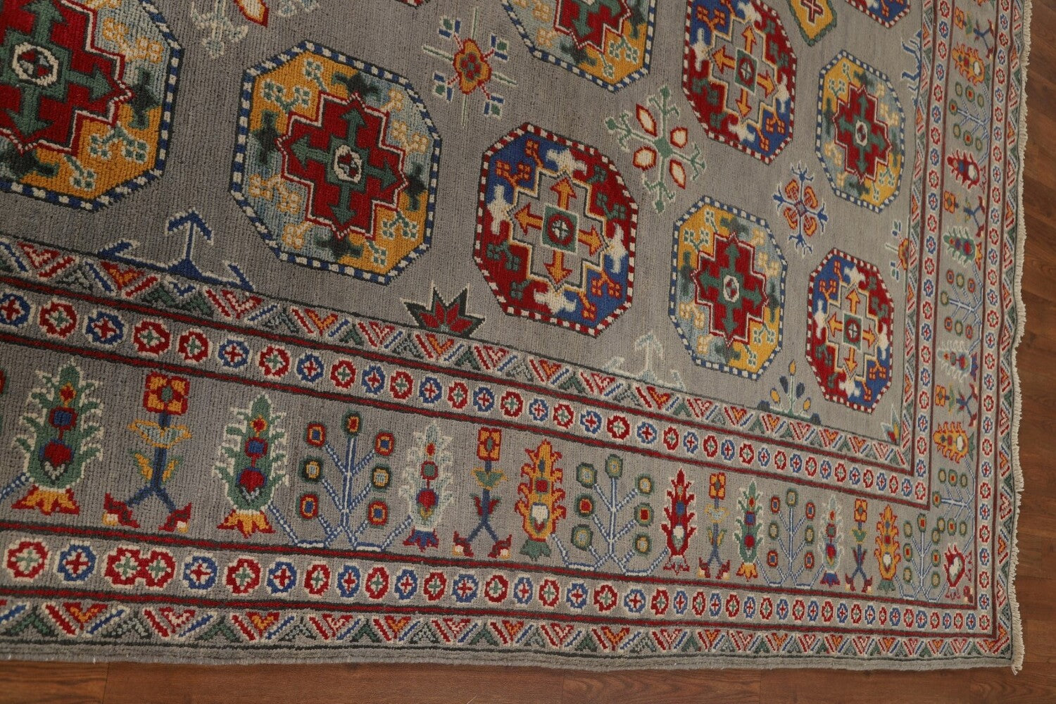 A Beautiful Genuine Pakistan Kazak rug is Hand Knotted by skillful weavers in Pakistan with 100% Wool Material. This rug is in New, First Quality condition. dimensions are 11' 4'' X 8' 4'' in foot and 345 X 254 in centimeter. the primary color is Greys & Charcoal.