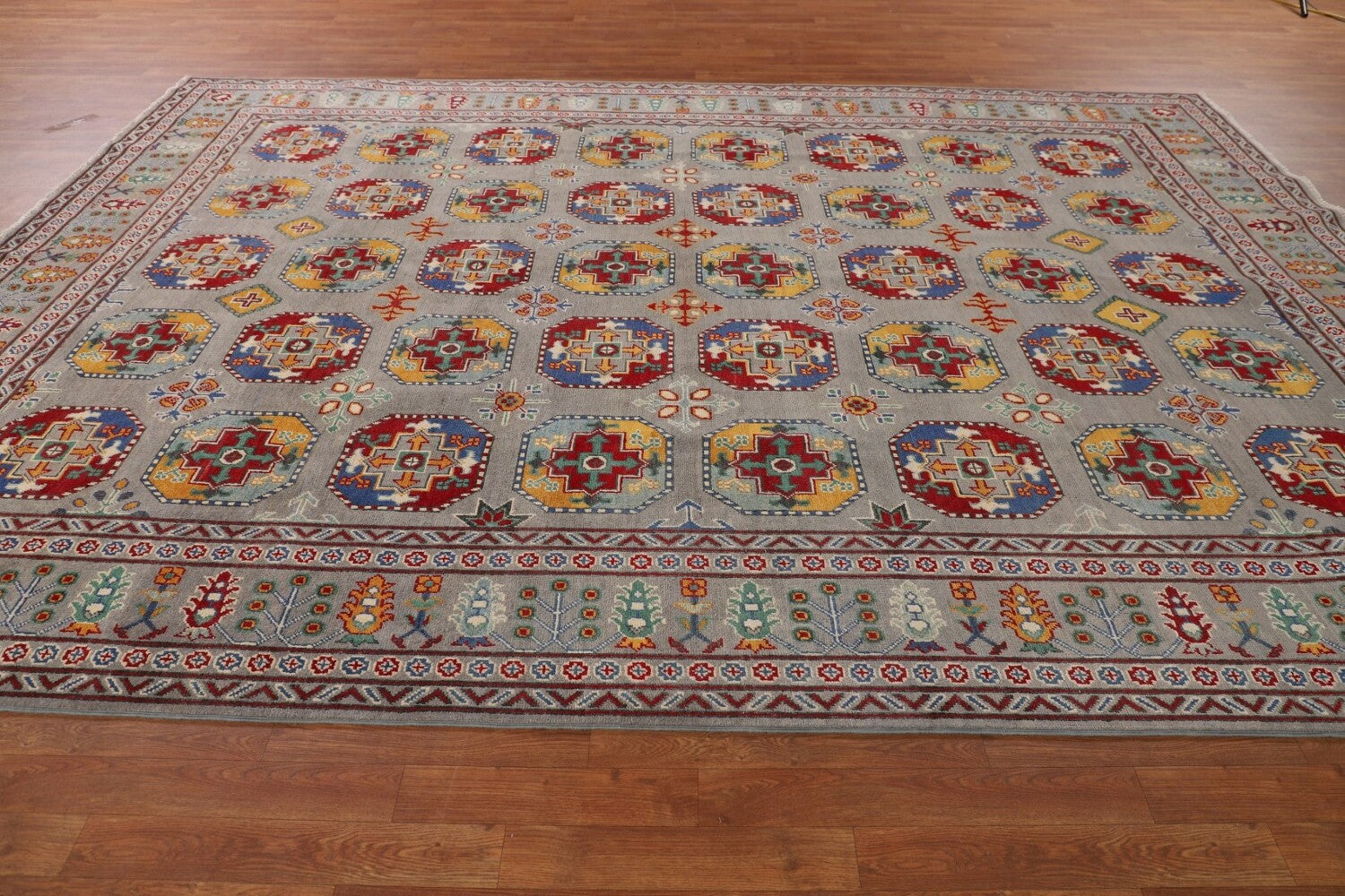 A Beautiful Genuine Pakistan Kazak rug is Hand Knotted by skillful weavers in Pakistan with 100% Wool Material. This rug is in New, First Quality condition. dimensions are 11' 9'' X 8' 5'' in foot and 358 X 257 in centimeter. the primary color is Greys & Charcoal.