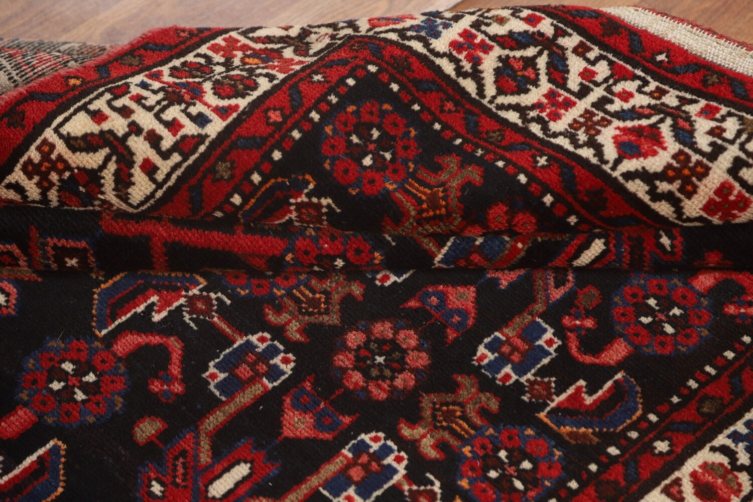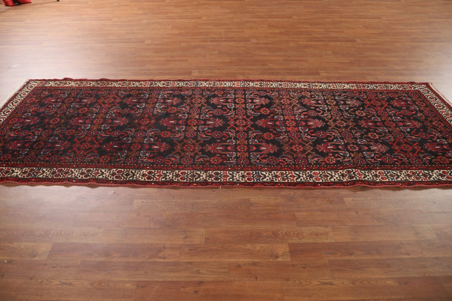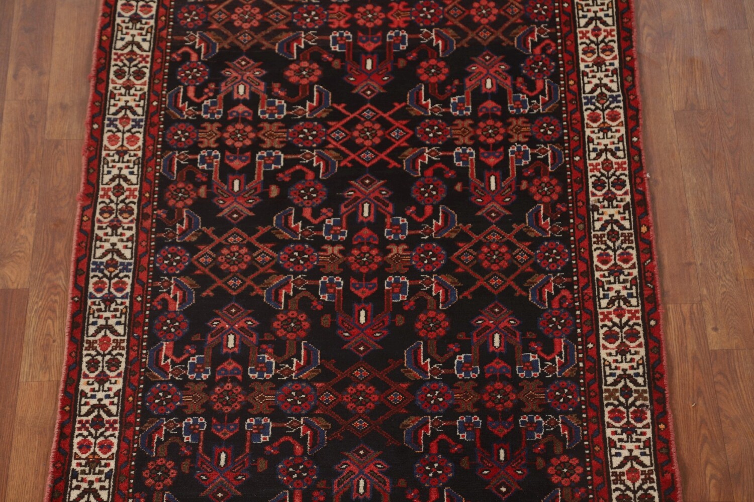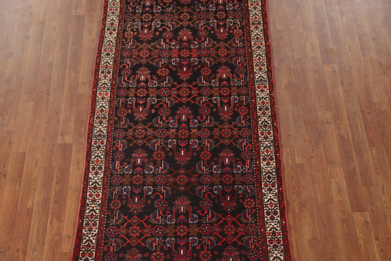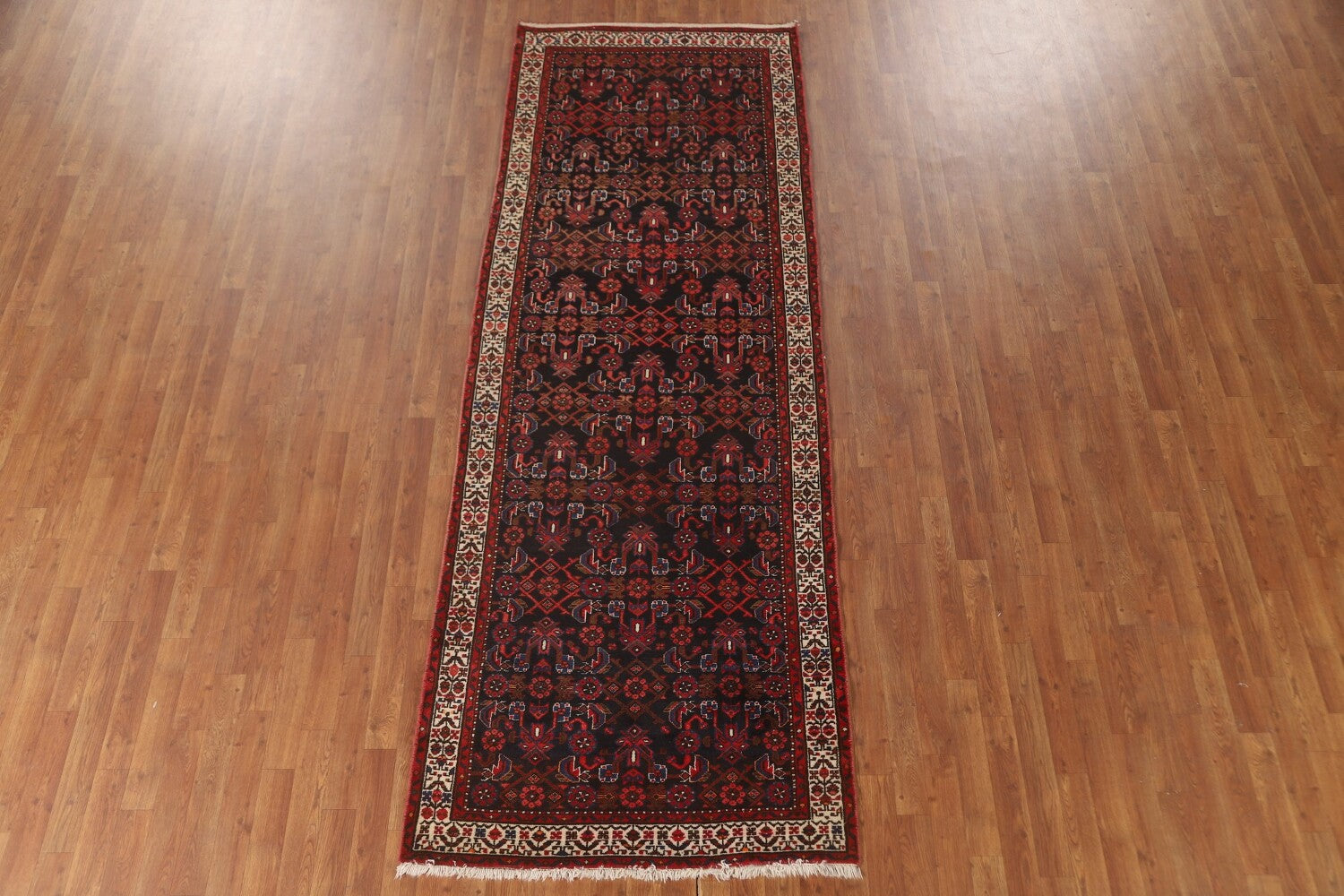 A Beautiful Genuine Persia ( Persia ) Hamedan rug is Hand Knotted by skillful weavers in Persia ( Persia ) with 100% Wool Material. This rug is in Very Good condition. dimensions are 10' 2'' X 3' 8'' in foot and 310 X 112 in centimeter. the primary color is Navy Blue & Blues.